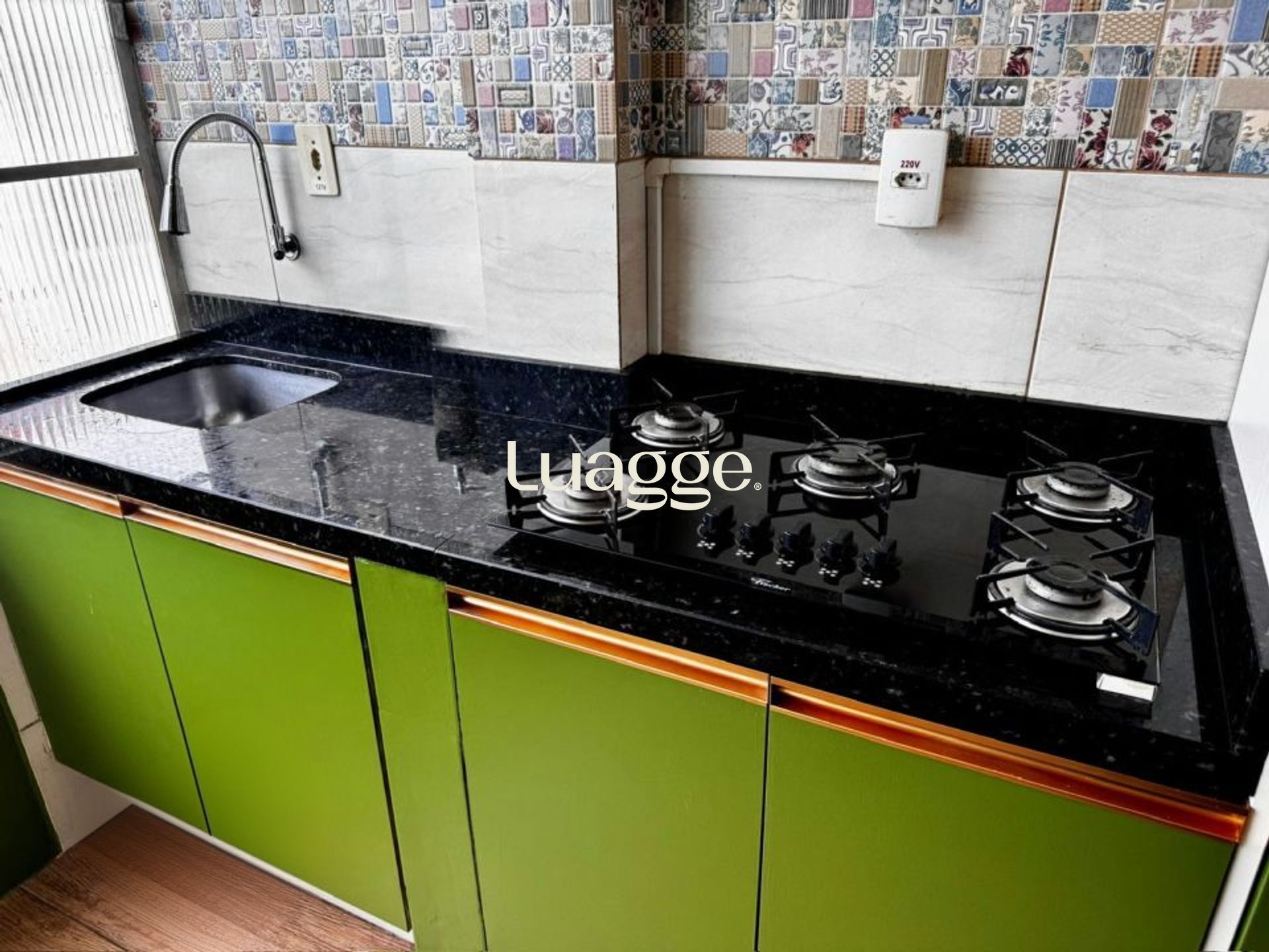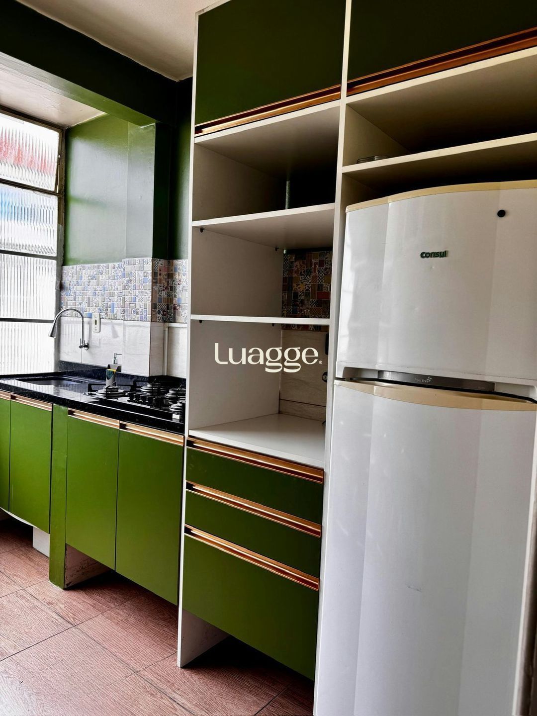 Sala/quarto amplo, iluminado, ventilado, com privacidade e vista aberta. Cozinha planejada e banheiro mobiliado, ambos com ventilação natural.