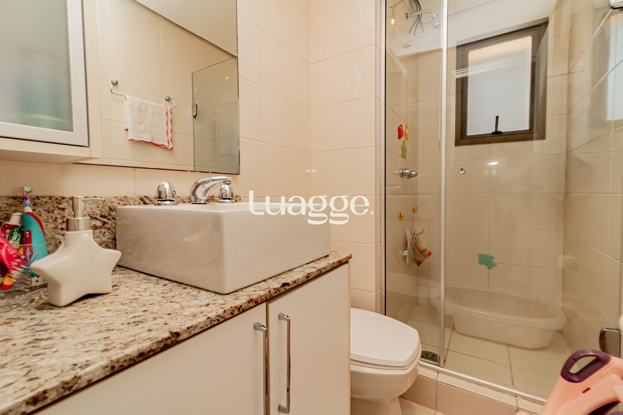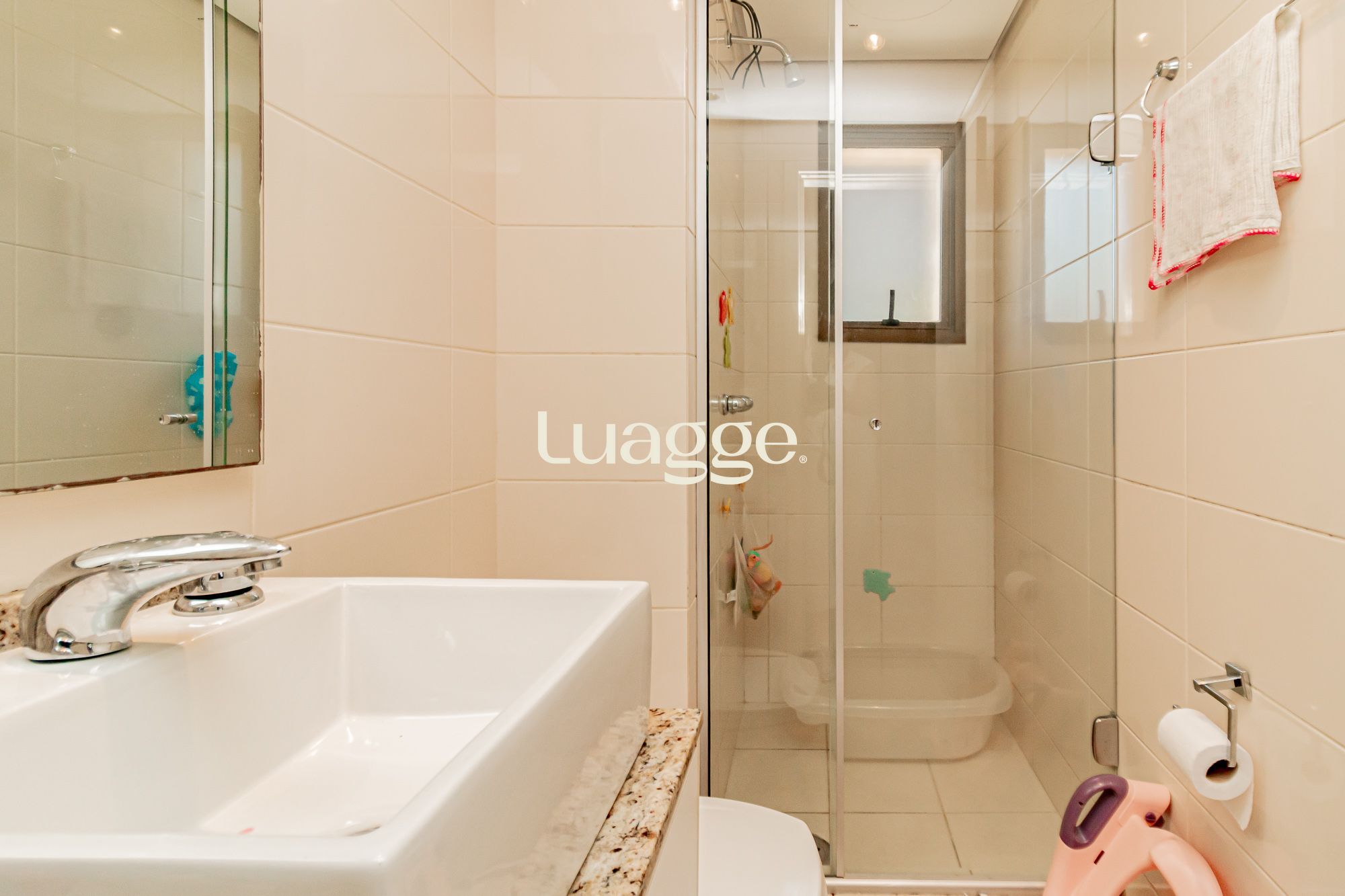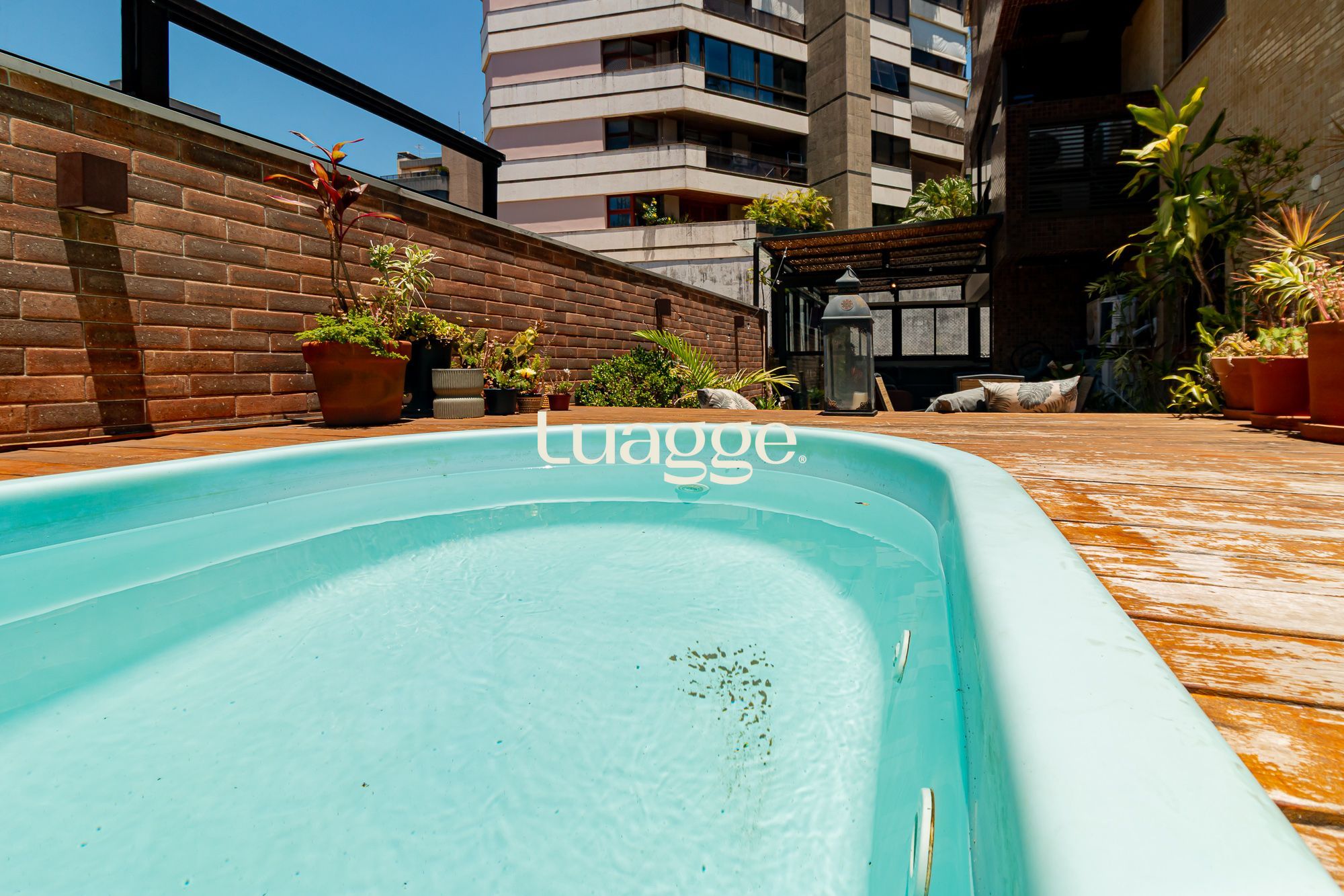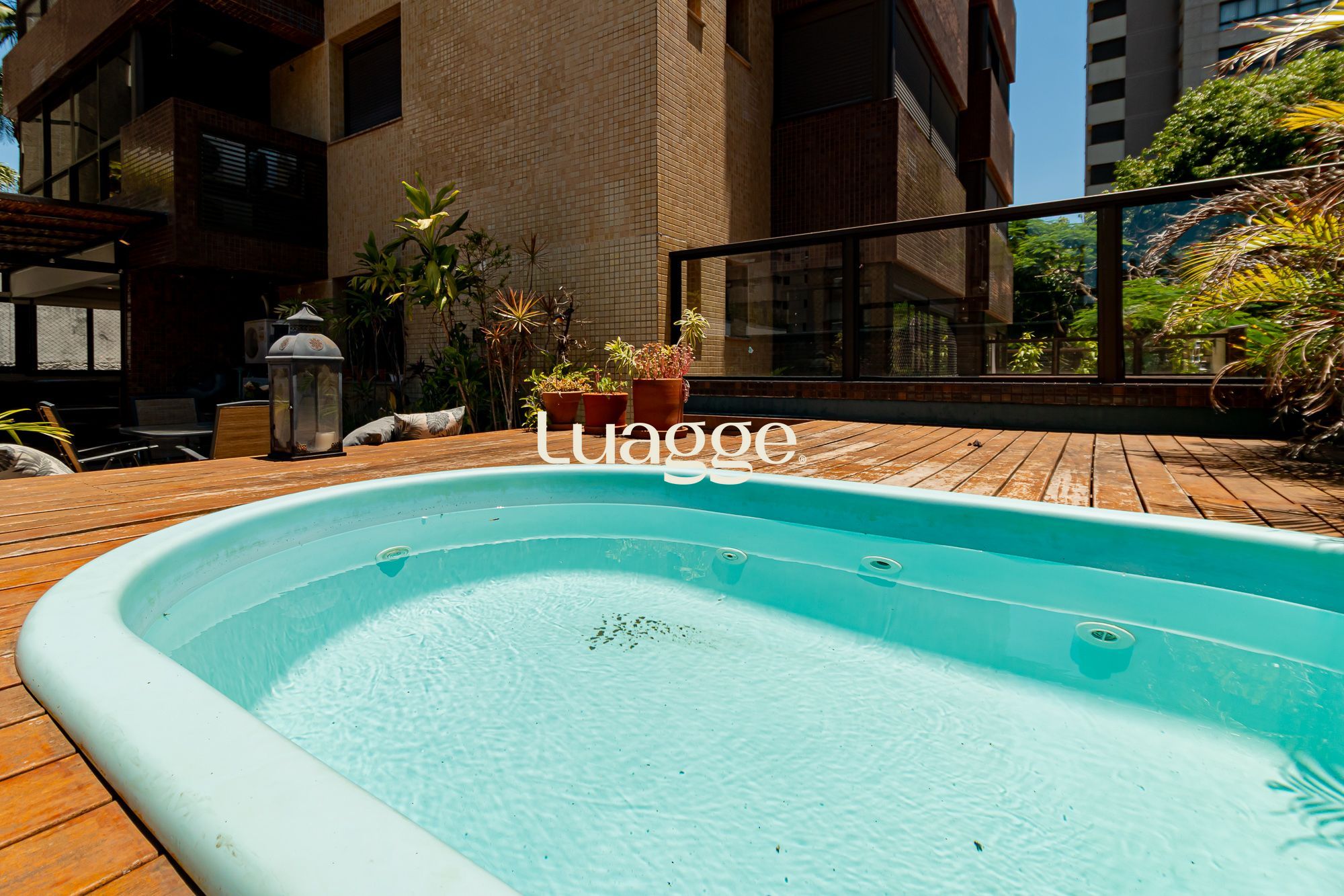 02 suítes, uma delas com closet, banheira, cozinha americana integrada com a sala de estar, lavado, churrasqueira, piscina na área externa ensolarada e 2 vagas de garagem.