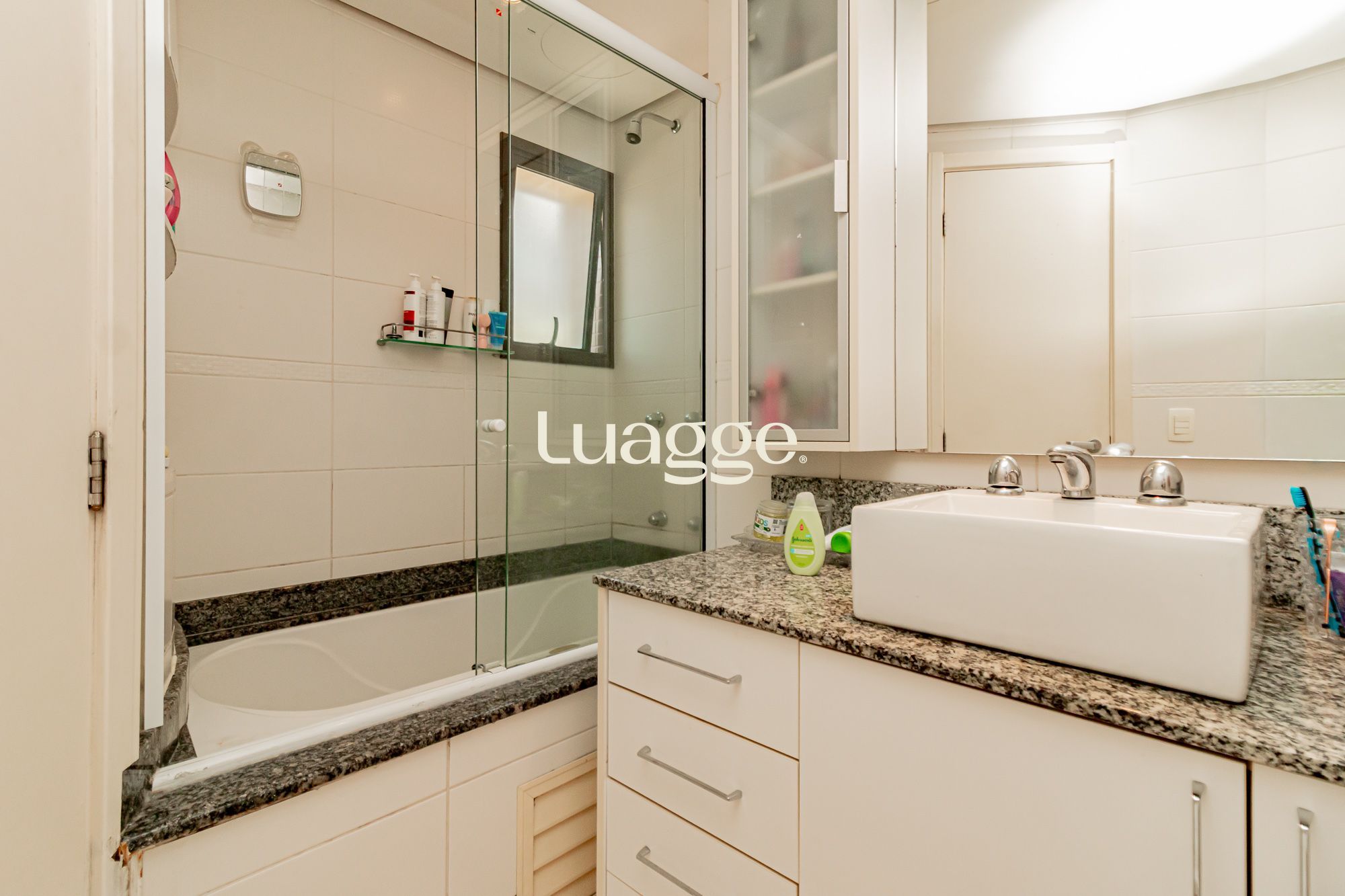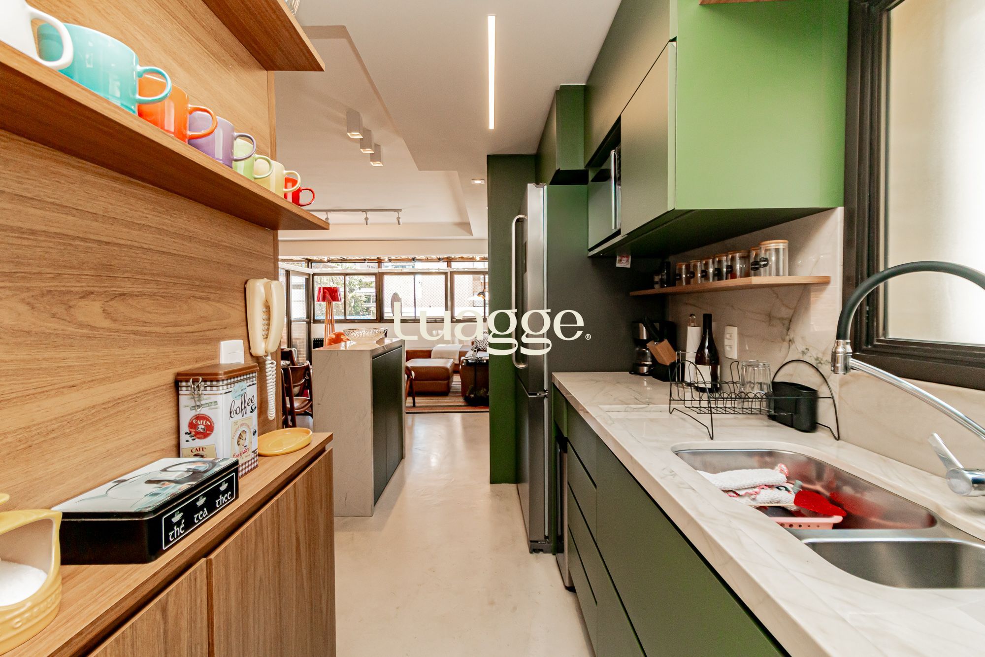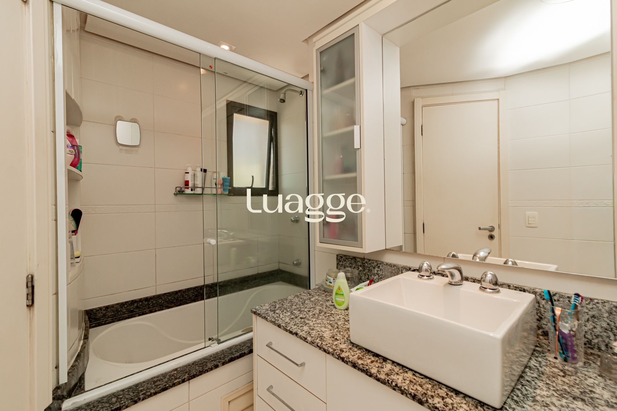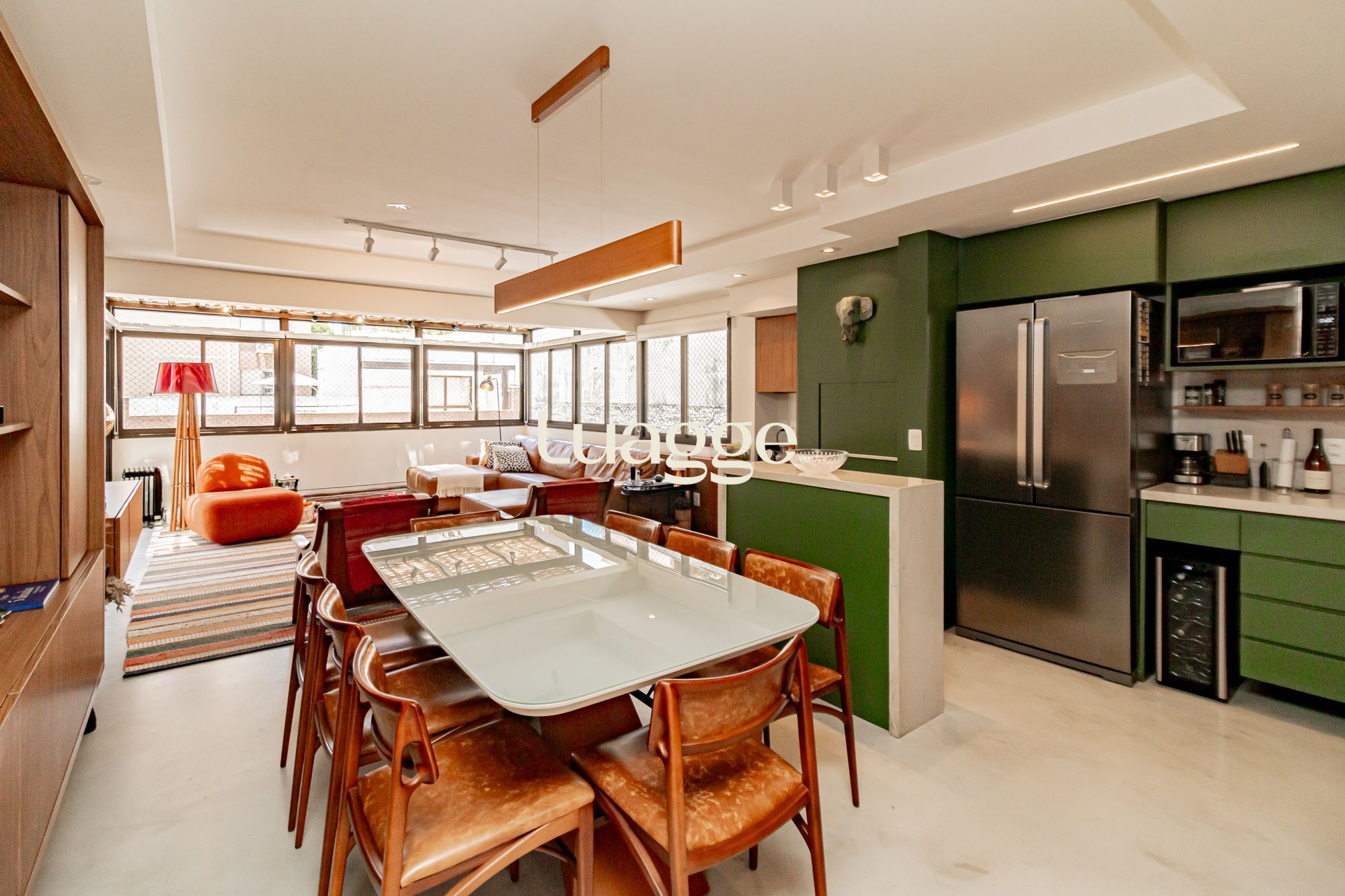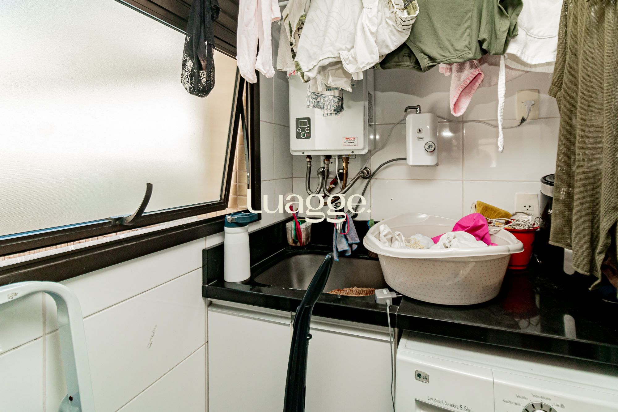02 suítes, uma delas com closet, banheira, cozinha americana integrada com a sala de estar, lavado, churrasqueira, piscina na área externa ensolarada e 2 vagas de garagem.