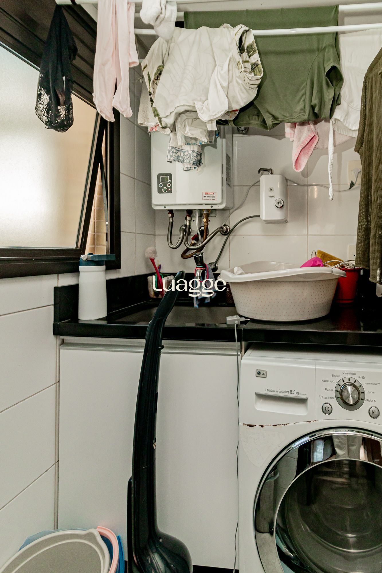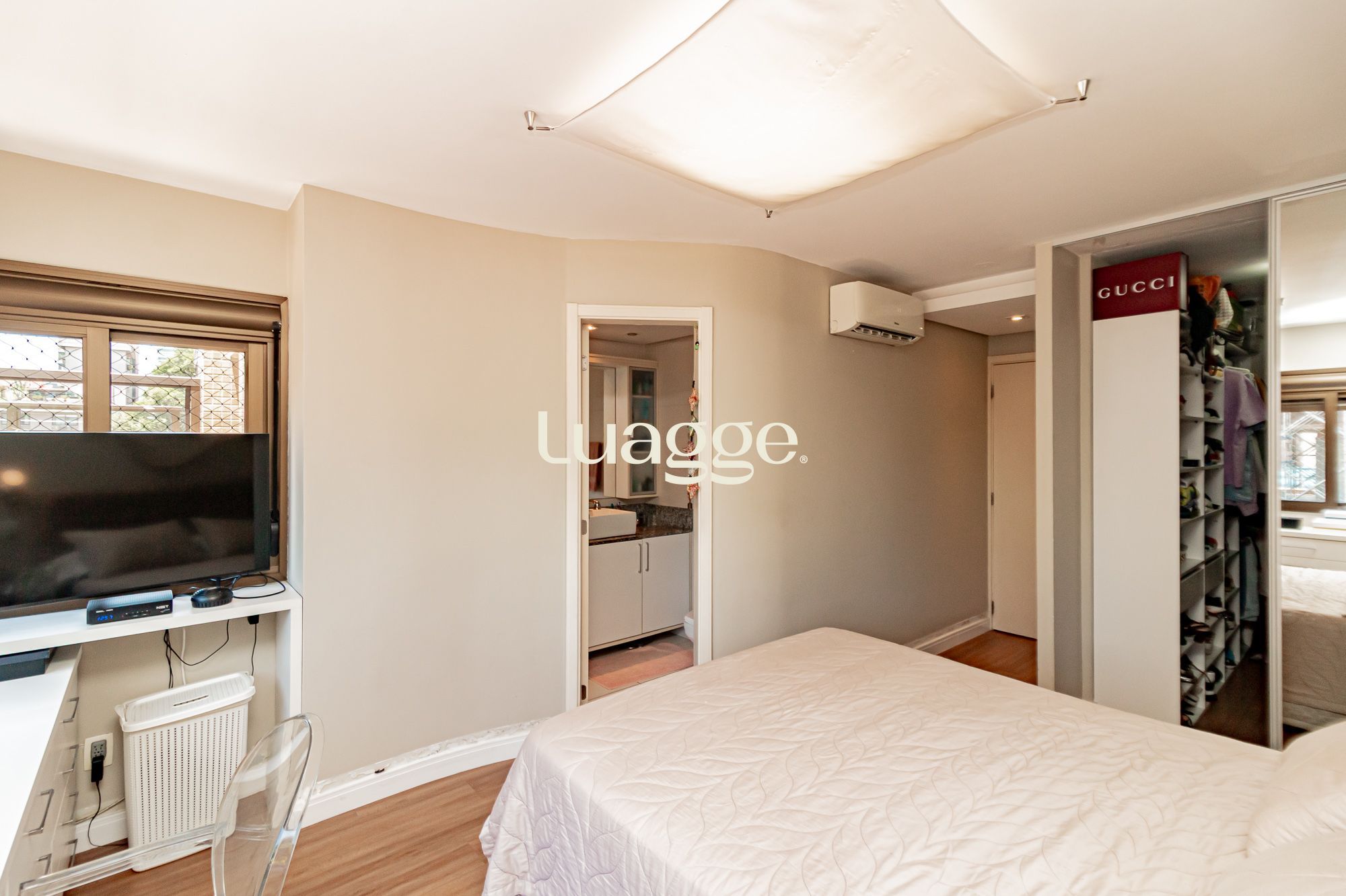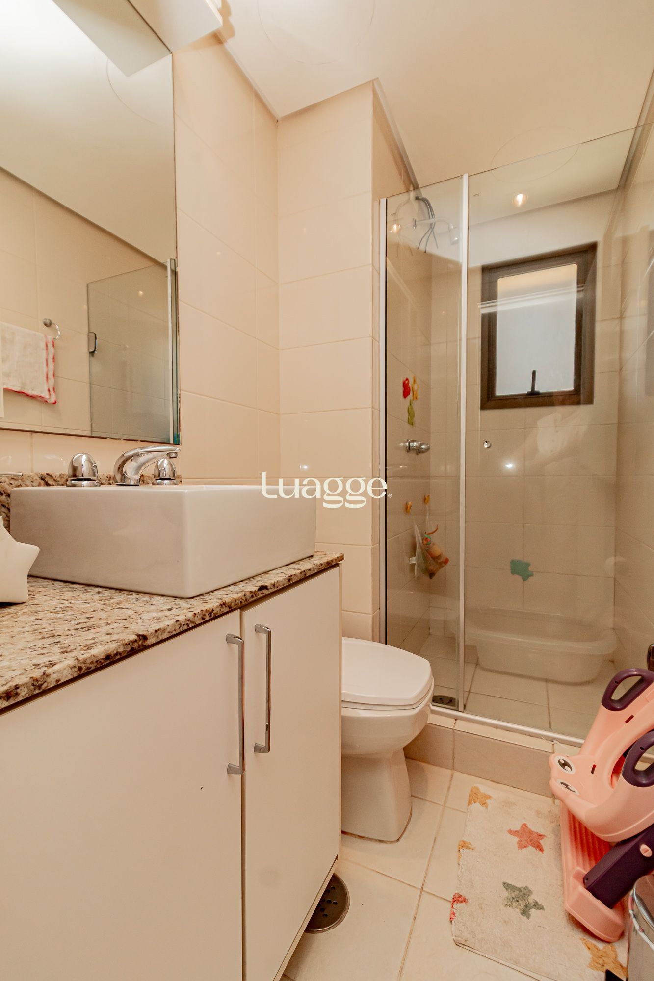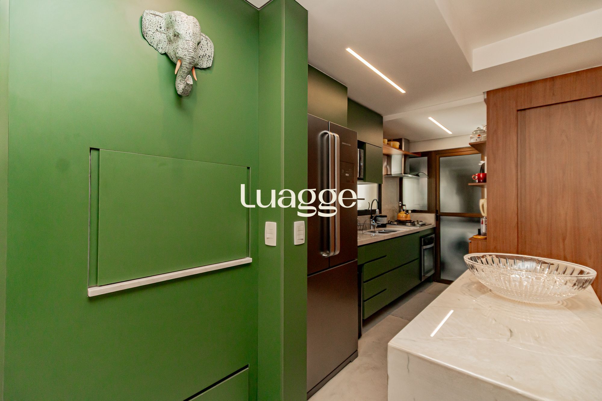 02 suítes, uma delas com closet, banheira, cozinha americana integrada com a sala de estar, lavado, churrasqueira, piscina na área externa ensolarada e 2 vagas de garagem.