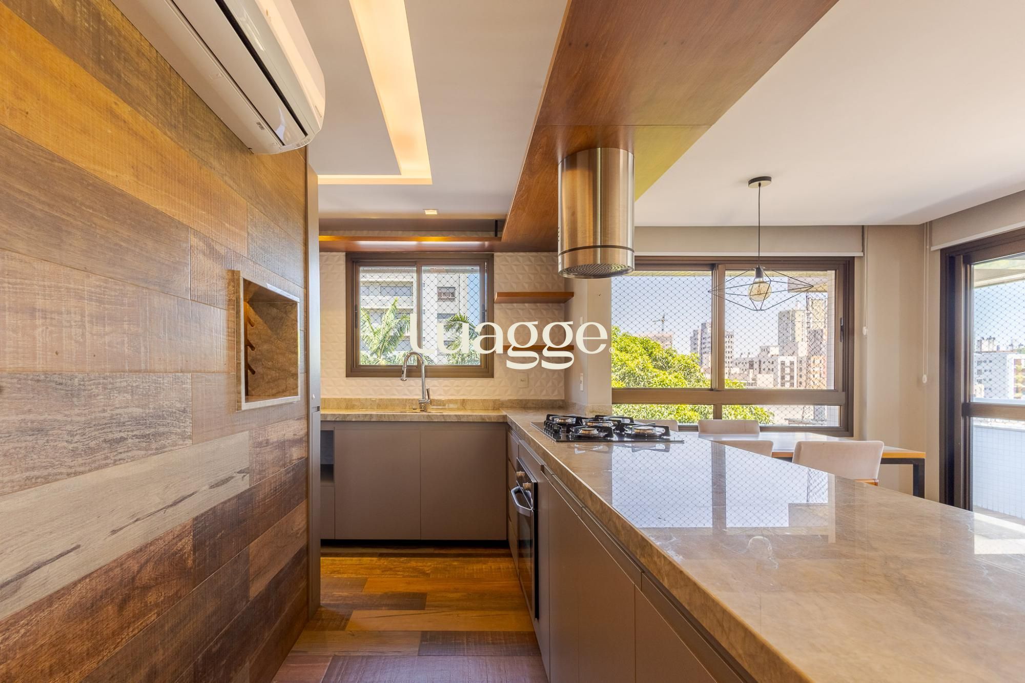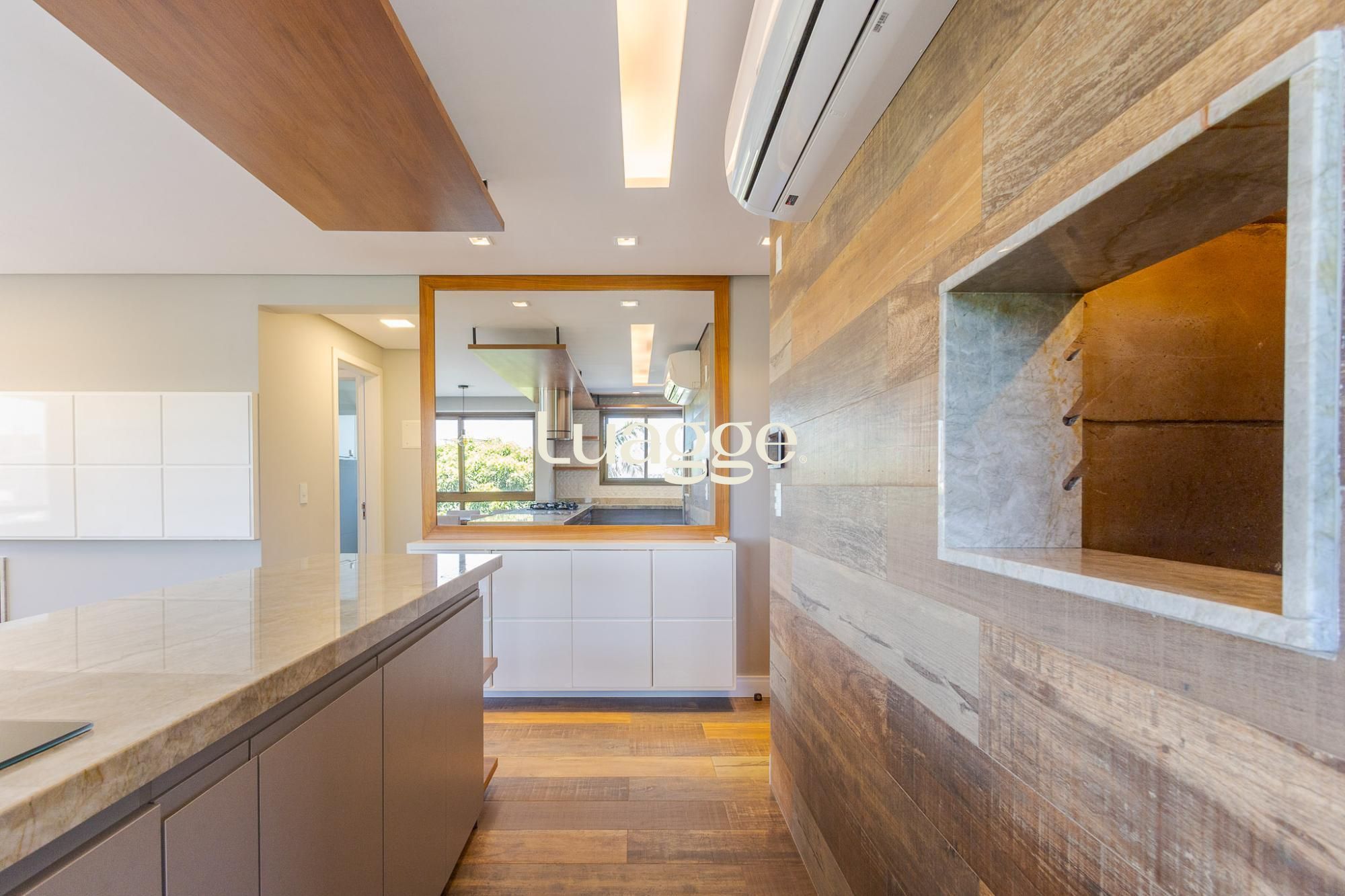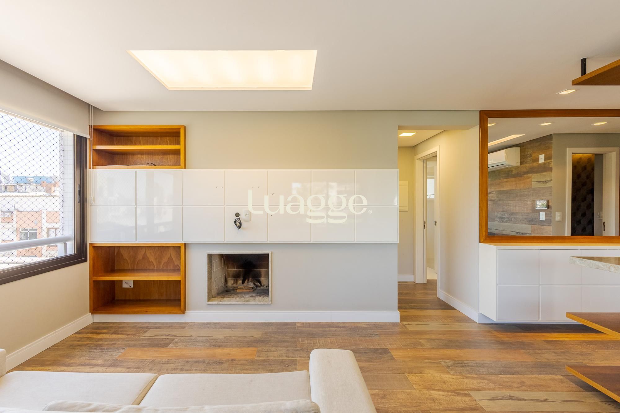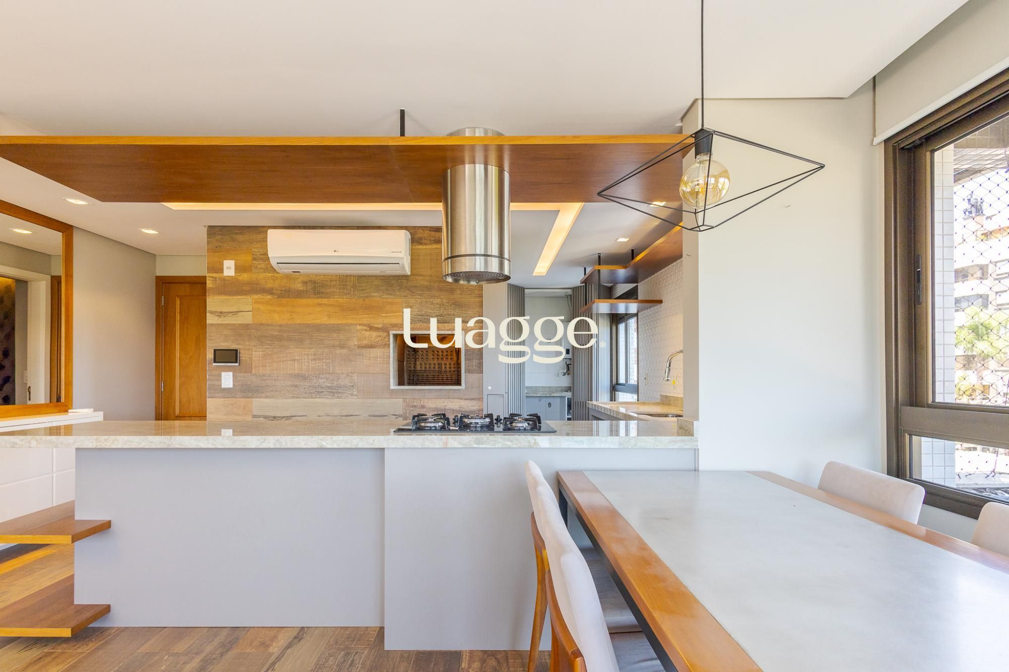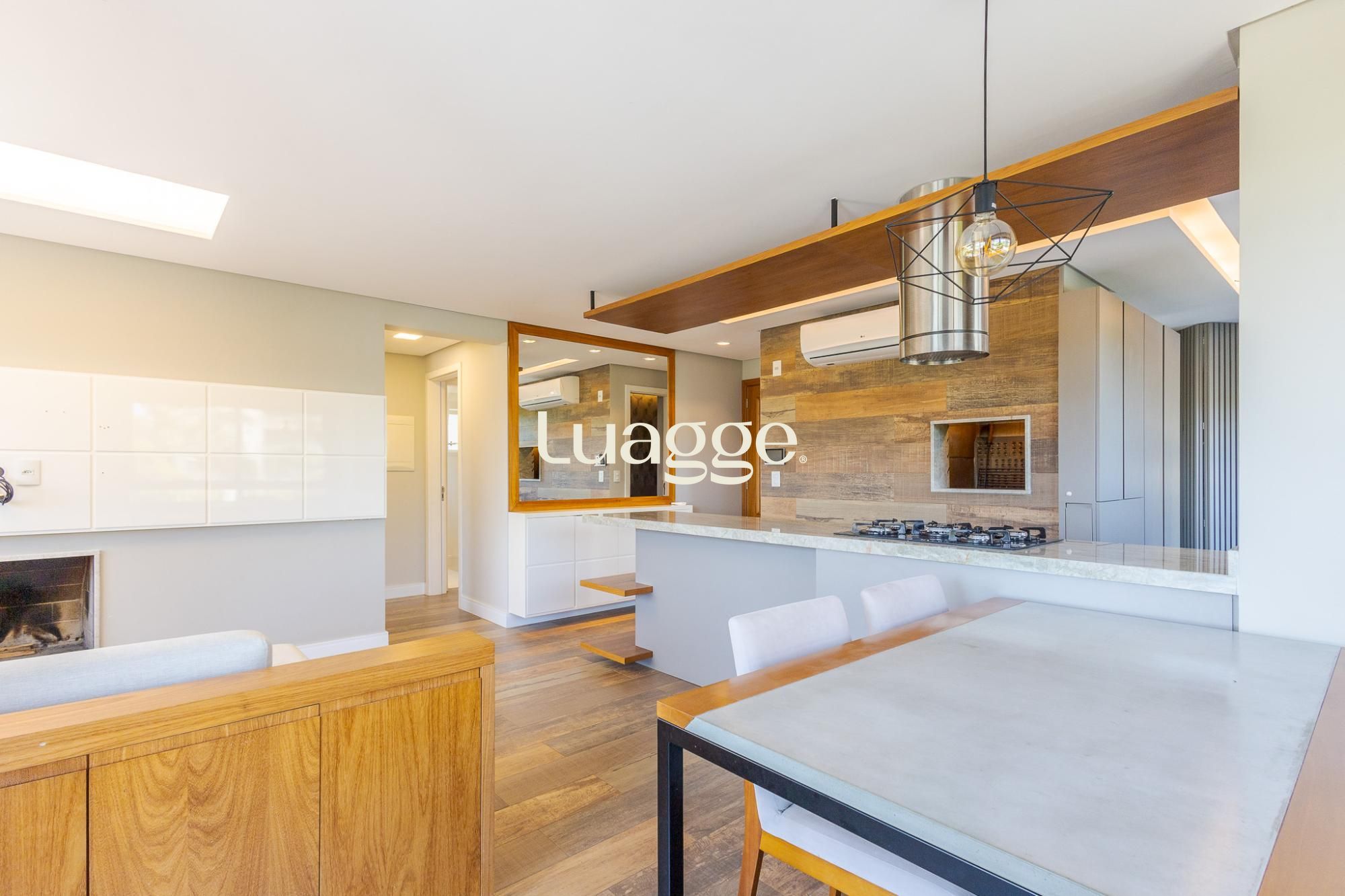 O living amplo para dois ambientes, com lareira e sacada, oferece conforto e ótima entrada de luz natural. A cozinha americana com churrasqueira integra perfeitamente os ambientes, ideal para momentos de convivência, além de contar com lavabo de apoio.