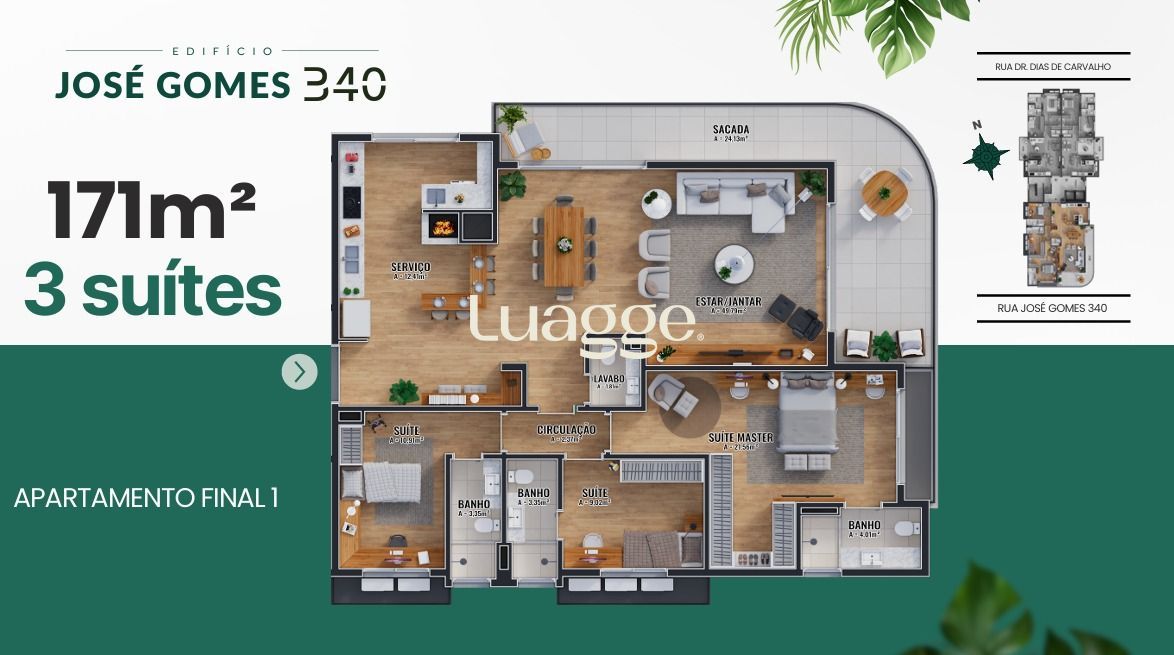 Ótimo e amplo apartamento no Empreendimento José Gomes, previsão de entrega para início de 2028 . Unidade com amplo living para 2 ambientes com sala de estar e sala de jantar, ampla sacada de frente em L, 3 dormitórios sendo 3 suítes, lavabo, cozinha espaçosa com churrasqueira e área de serviço separada. Espera para instalação de Splits no living e nas suítes. Todas as peças com forro de gesso. Piso vinílico no living e dormitórios, e porcelanato na cozinha, banheiros e sacada. Espera para instalação de Junker. Imóvel de frente com ótima vista e sol da tarde. Possui 2 vaga de garagem cobertas e escrituradas (lado a lado). Condomínio com hall de entrada, pilotis, bicicletário, carregador para carro elétrico, gás central e água com consumo individual, elevadores, academia, salão de festas com terraço, rooftop com salão de festas e estar social, jardim. Localizado em ótima região próximo das Avenidas Otto Niemeyer e Wenceslau Escobar, a poucos minutos do Shopping Paseo e do Zaffari, com todos os recursos próximos. Solicite mais informações.