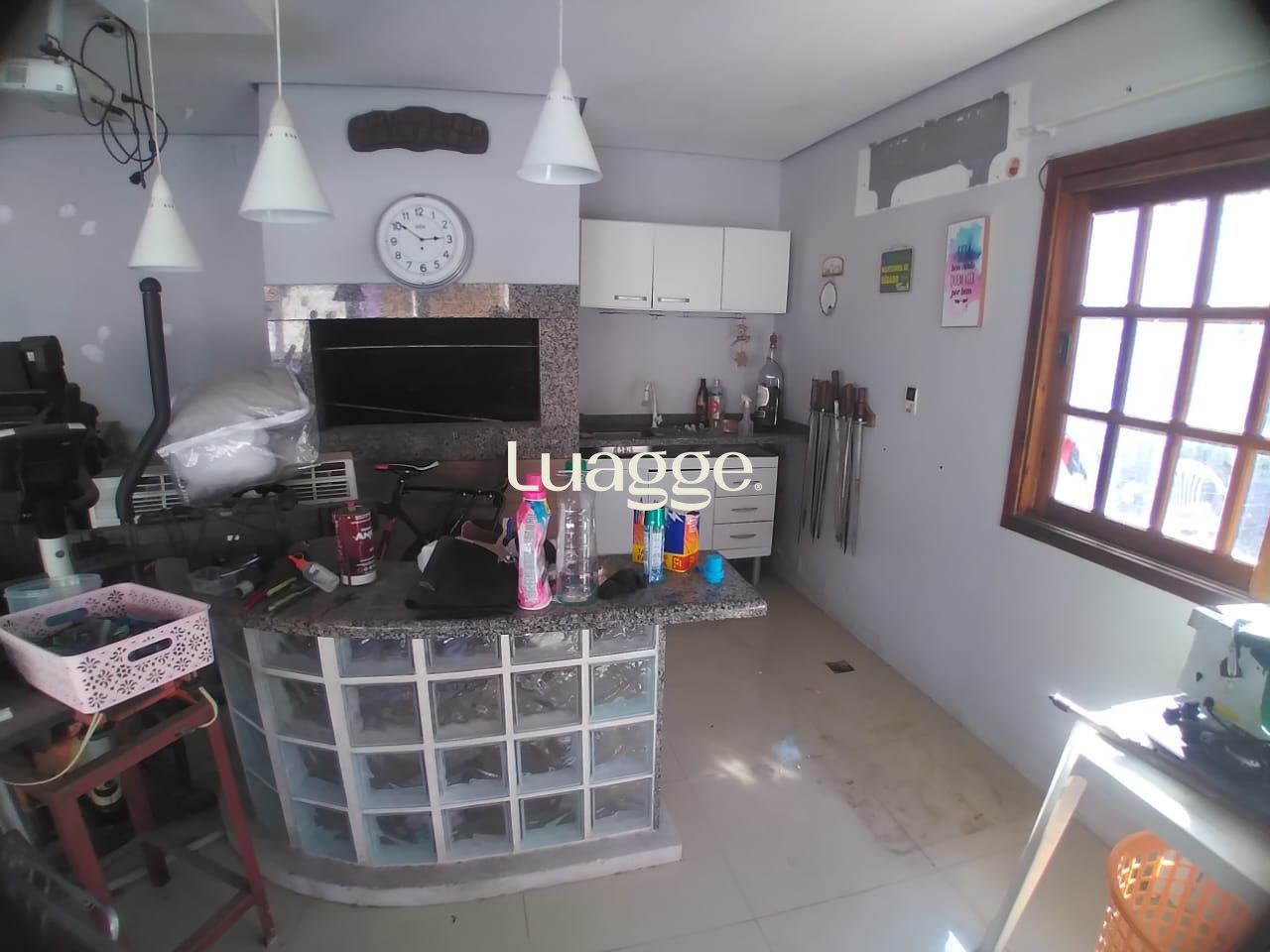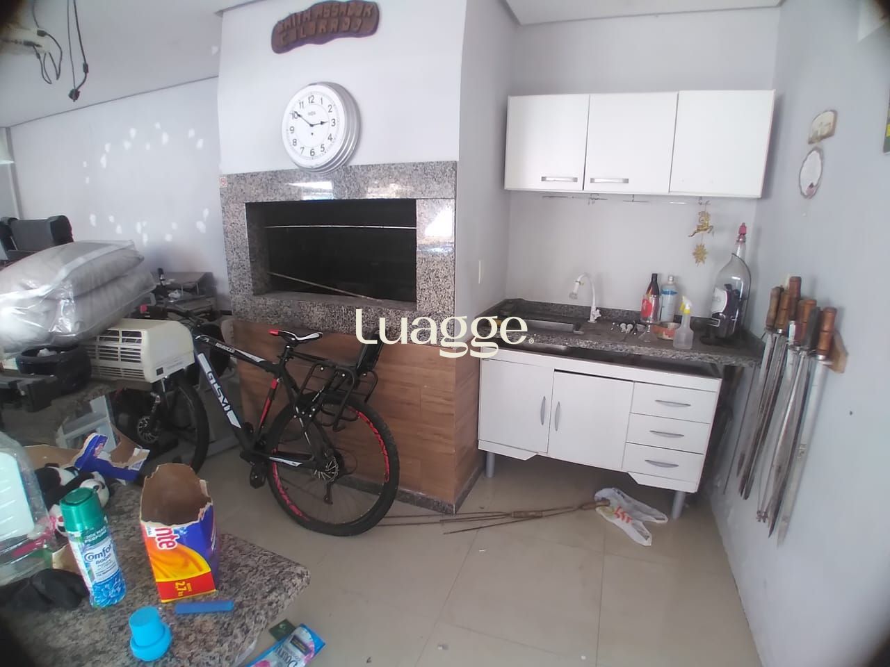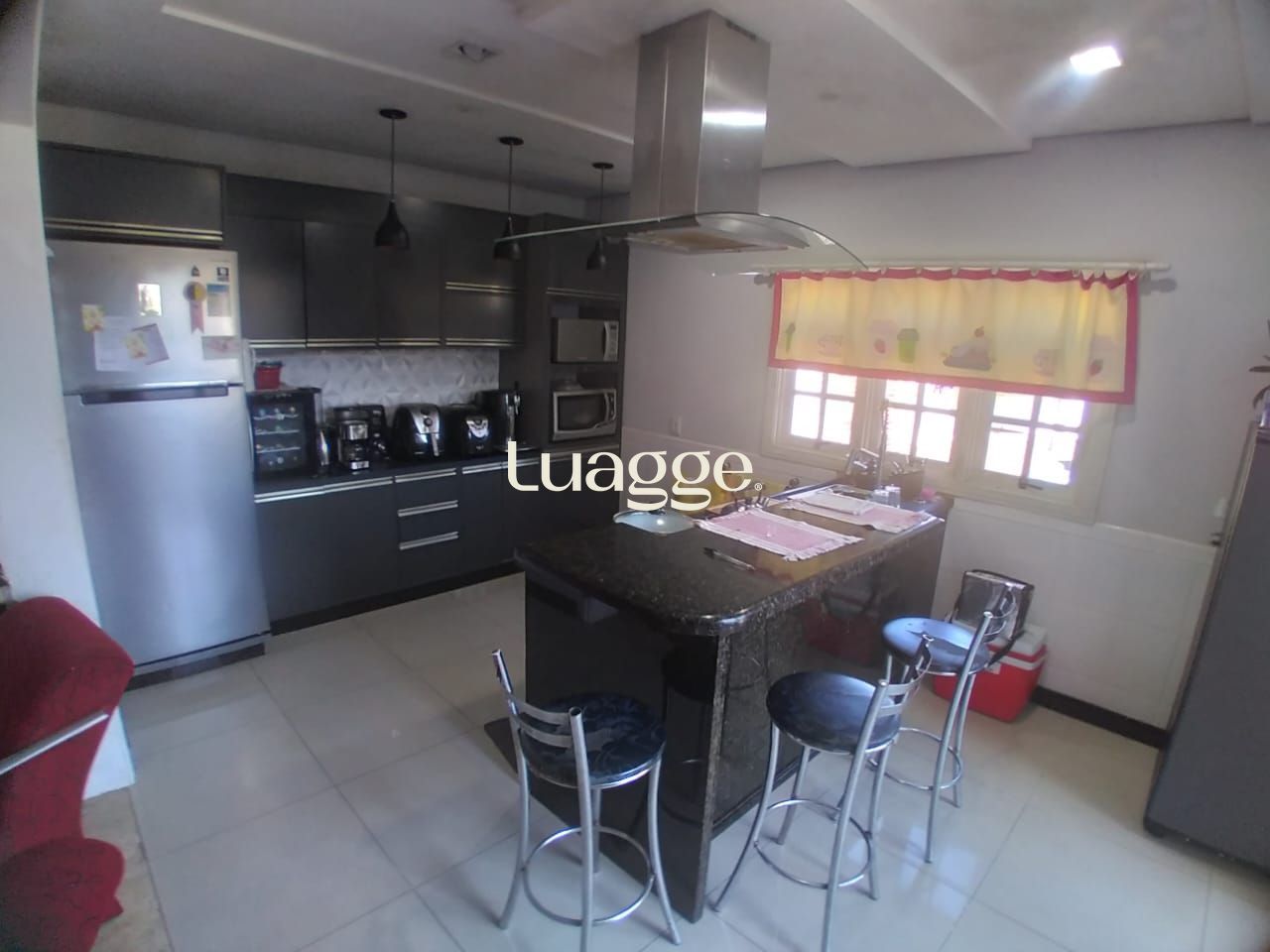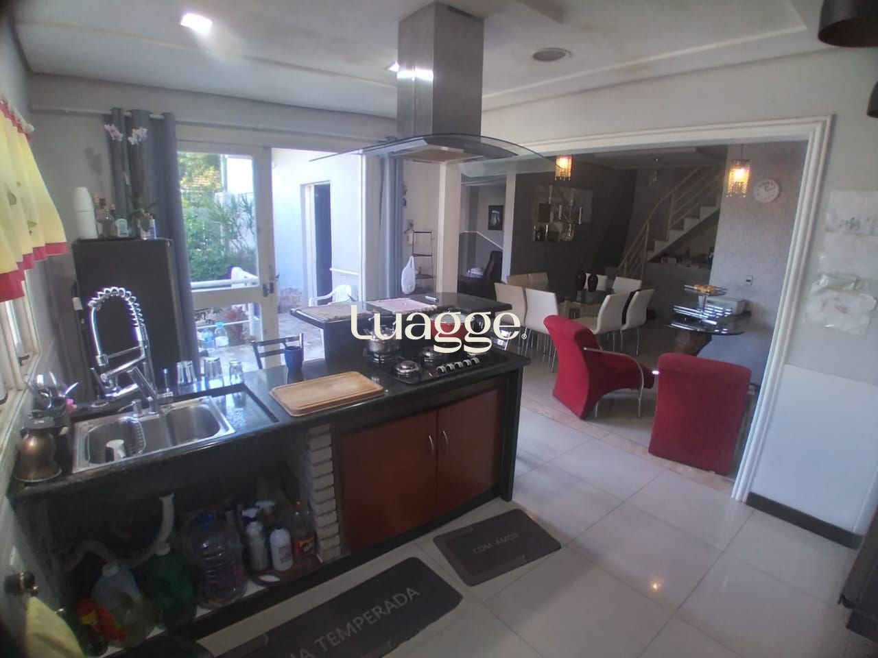 A área social é composta por sala de estar e jantar integradas, fogão a lenha em alvenaria, churrasqueira e cozinha americana planejada com armários sob medida.
