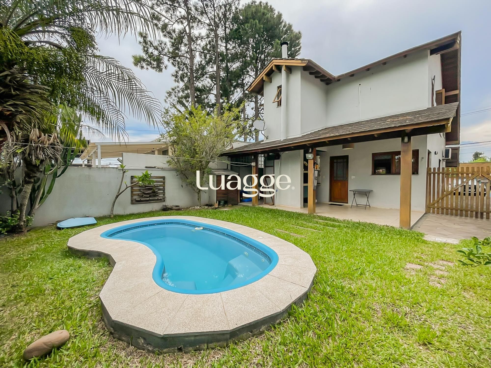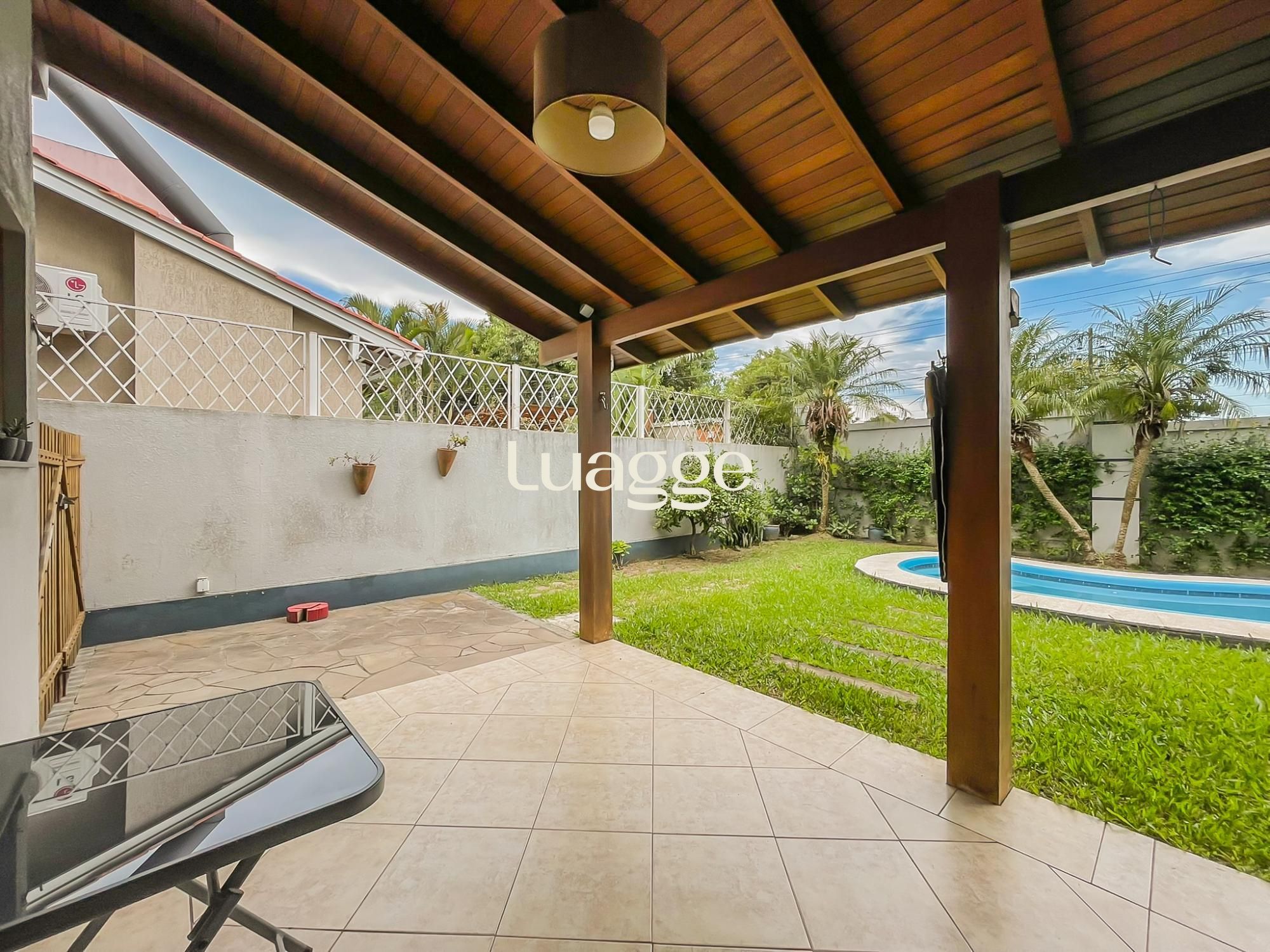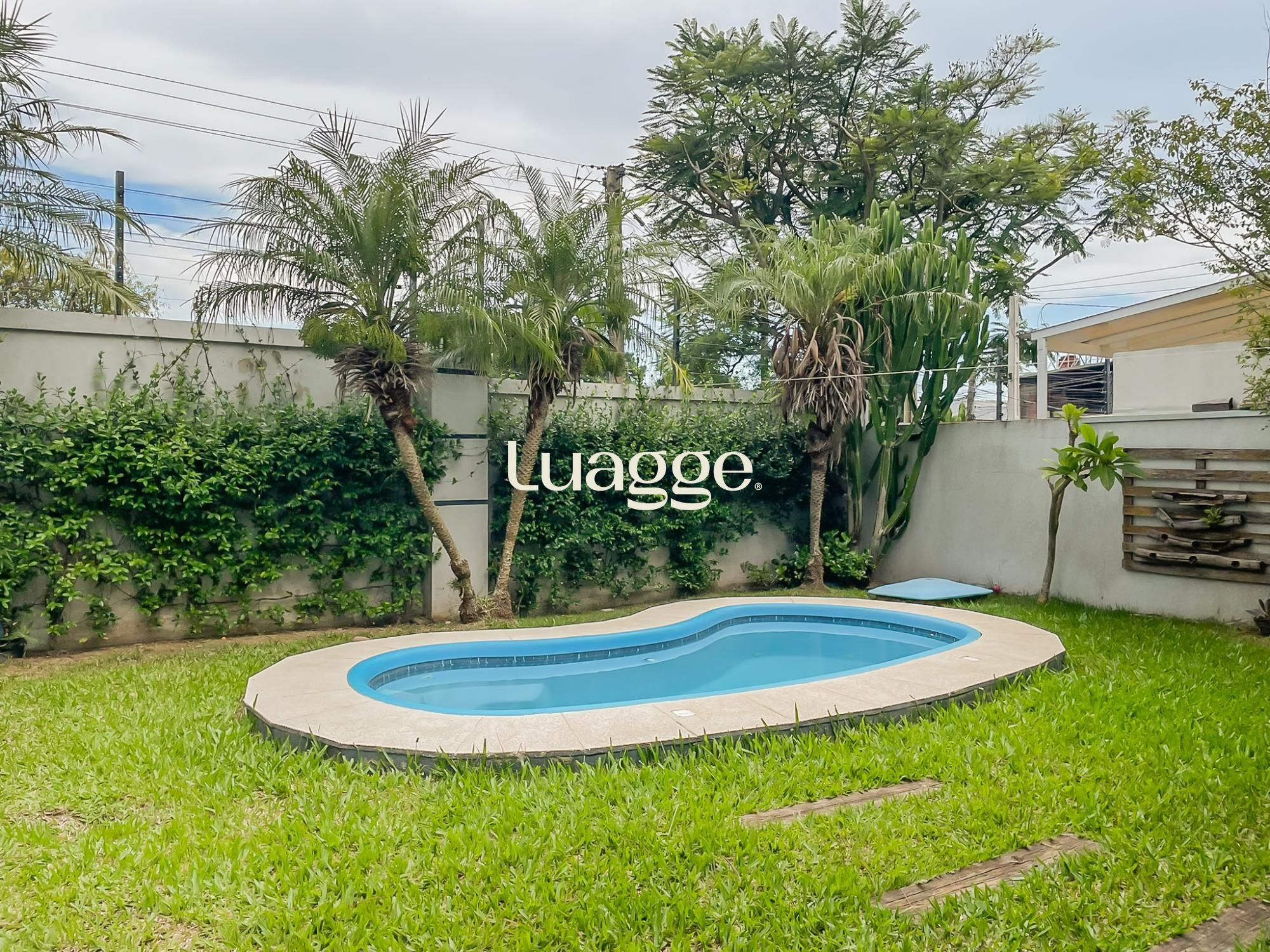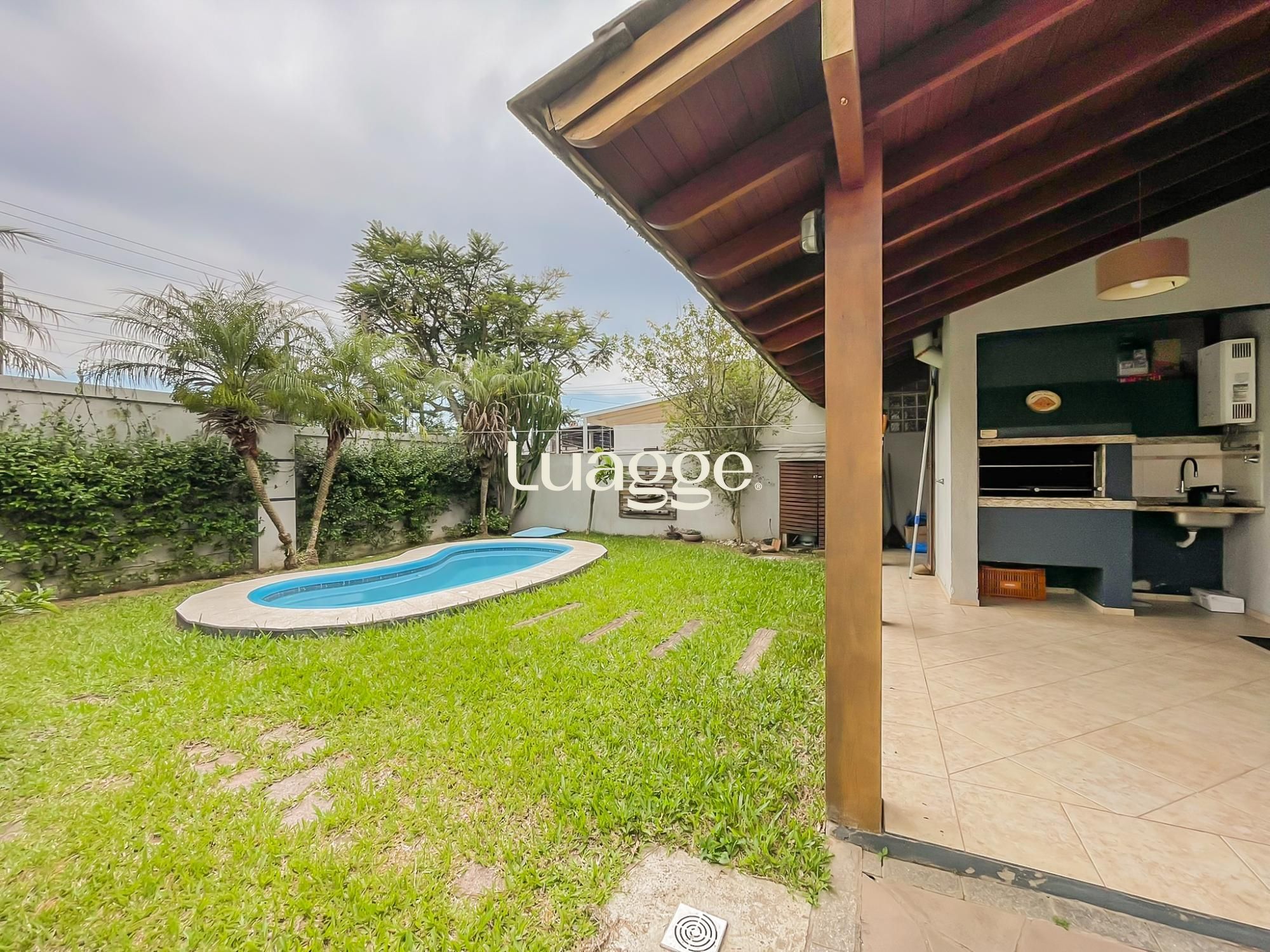 Parte externa com vaga para 4 carros, corredor lateral e pátio ao fundo com piscina e ambiente de churrasqueira.
