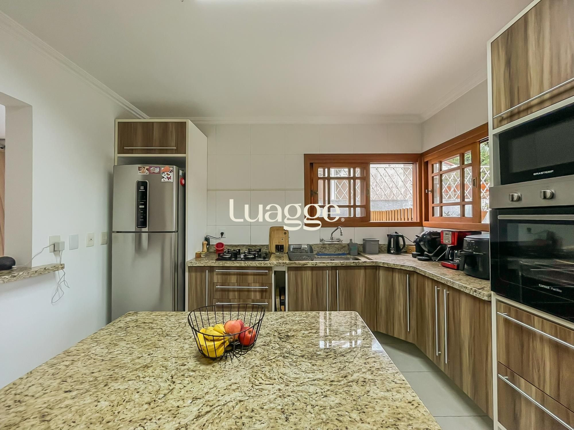 Amplo living para dois ambientes com lareira, lavabo e cozinha americana semi mobiliada com bancada em granito.