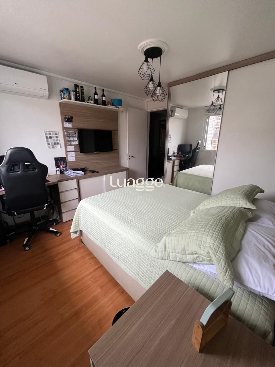 No andar superior, o imóvel oferece dormitórios confortáveis e totalmente mobiliados, incluindo um quarto de casal com closet, além de um banheiro com claraboia que proporciona iluminação natural, trazendo ainda mais aconchego ao ambiente.