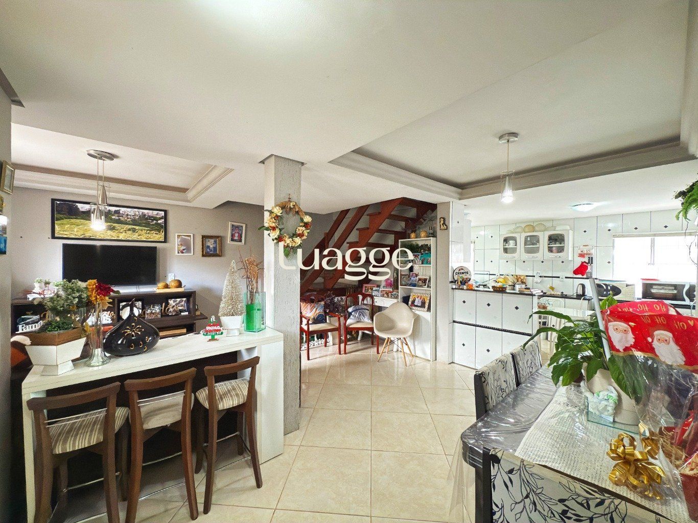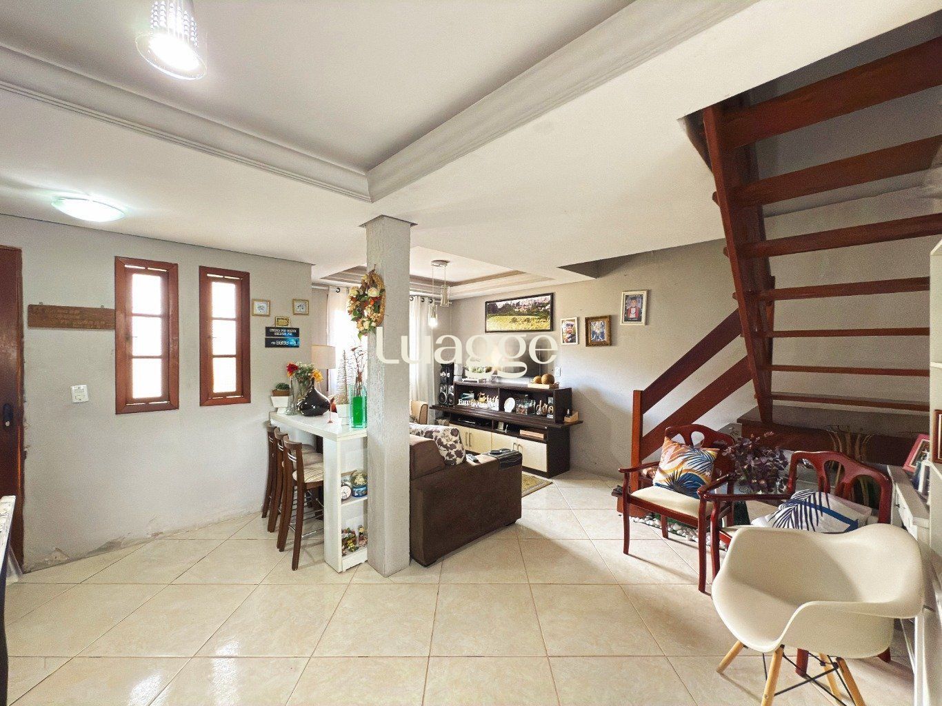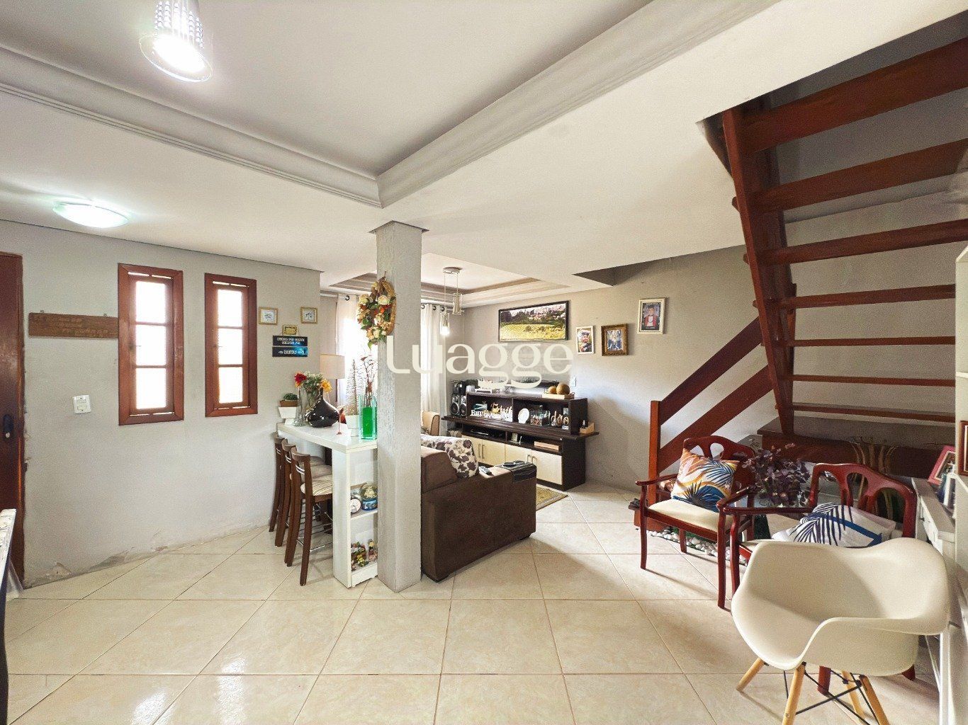 No primeiro piso, encontram-se a sala de estar e jantar, integradas, a cozinha e um banheiro social, compondo uma área social prática e bem definida. A garagem dispõe de churrasqueira e duas vagas, sendo uma coberta e outra descoberta.