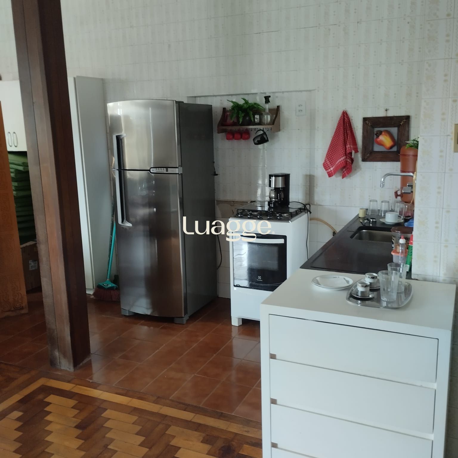 Cozinha ampla, iluminada e ventilada, em piso cerâmico, com janelas grandes.