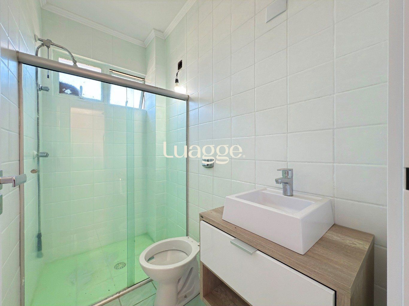 Banheiro auxiliar no primeiro pavimento, arejado e iluminado, com box de vidro, armário sob medida e janela com abertura para o exterior.