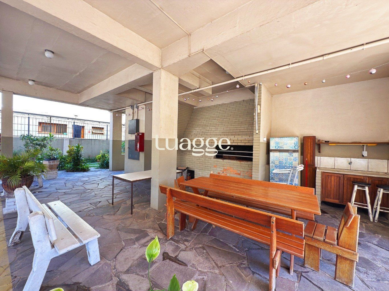 Terraço com área gourmet equipada com mesa, bancos, churrasqueira e pia.