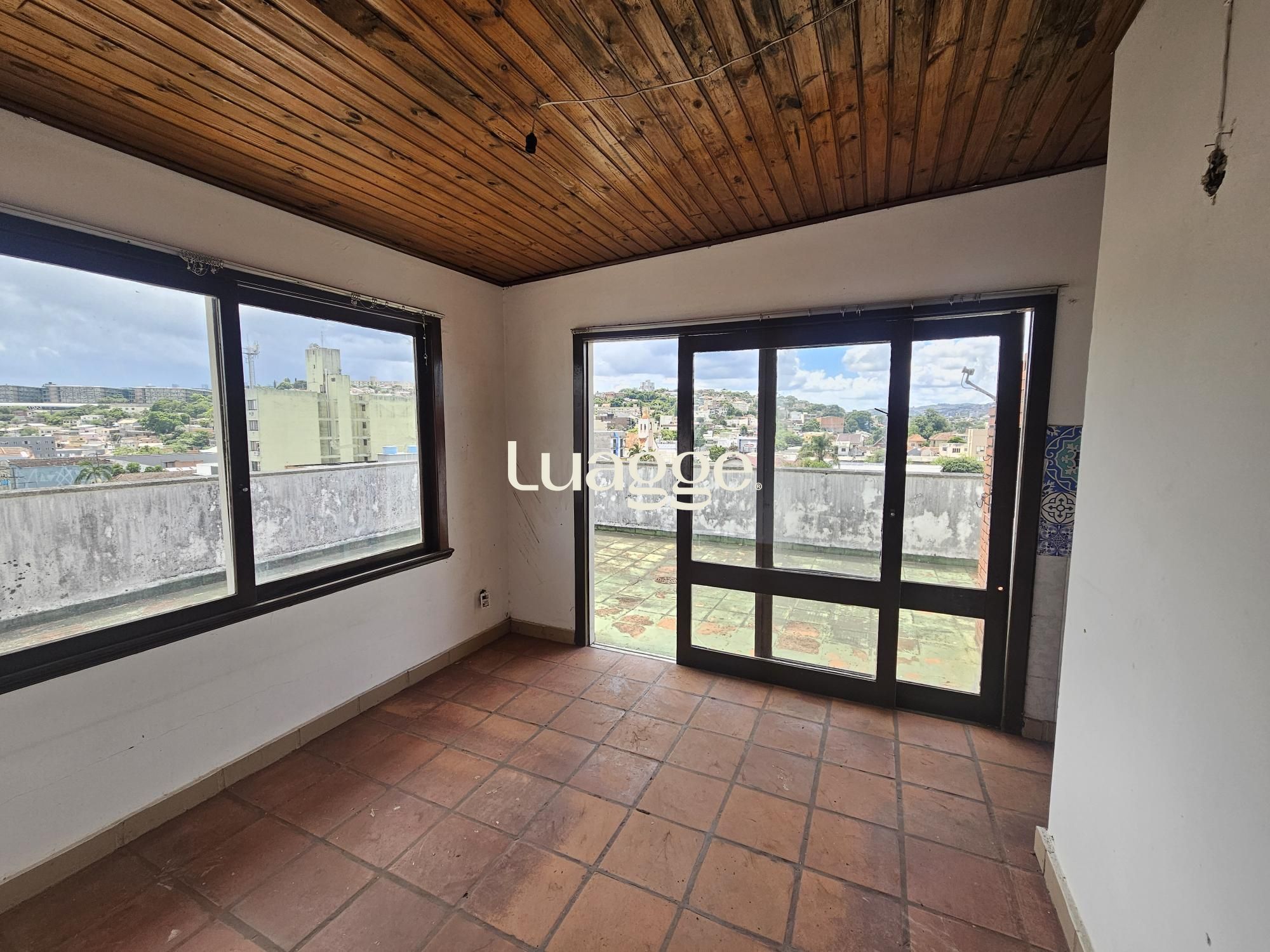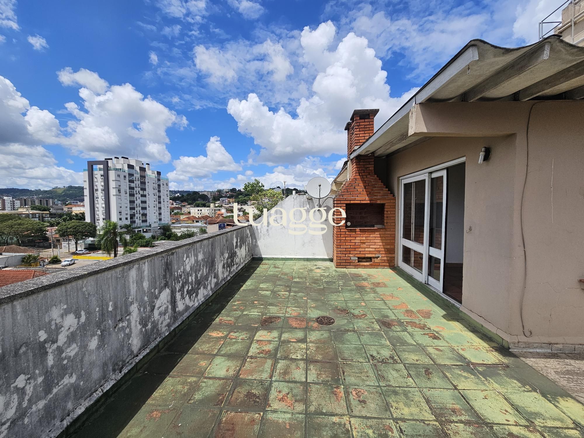 Já na parte superior que o acesso é pelas escadas do prédio, temos uma ampla área coberta, banheiro e uma área externa com churrasqueira e uma vista de quase 360 graus.