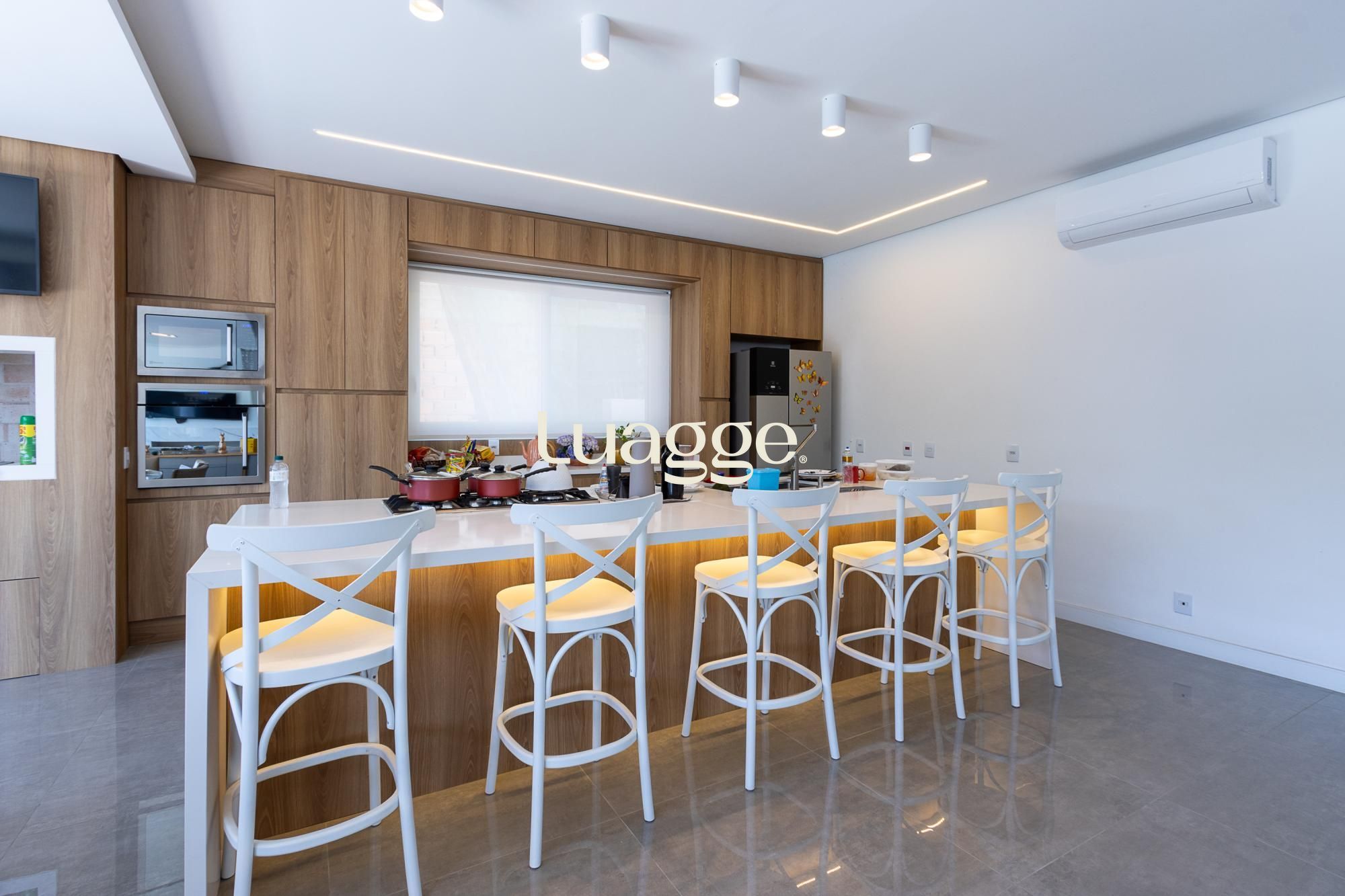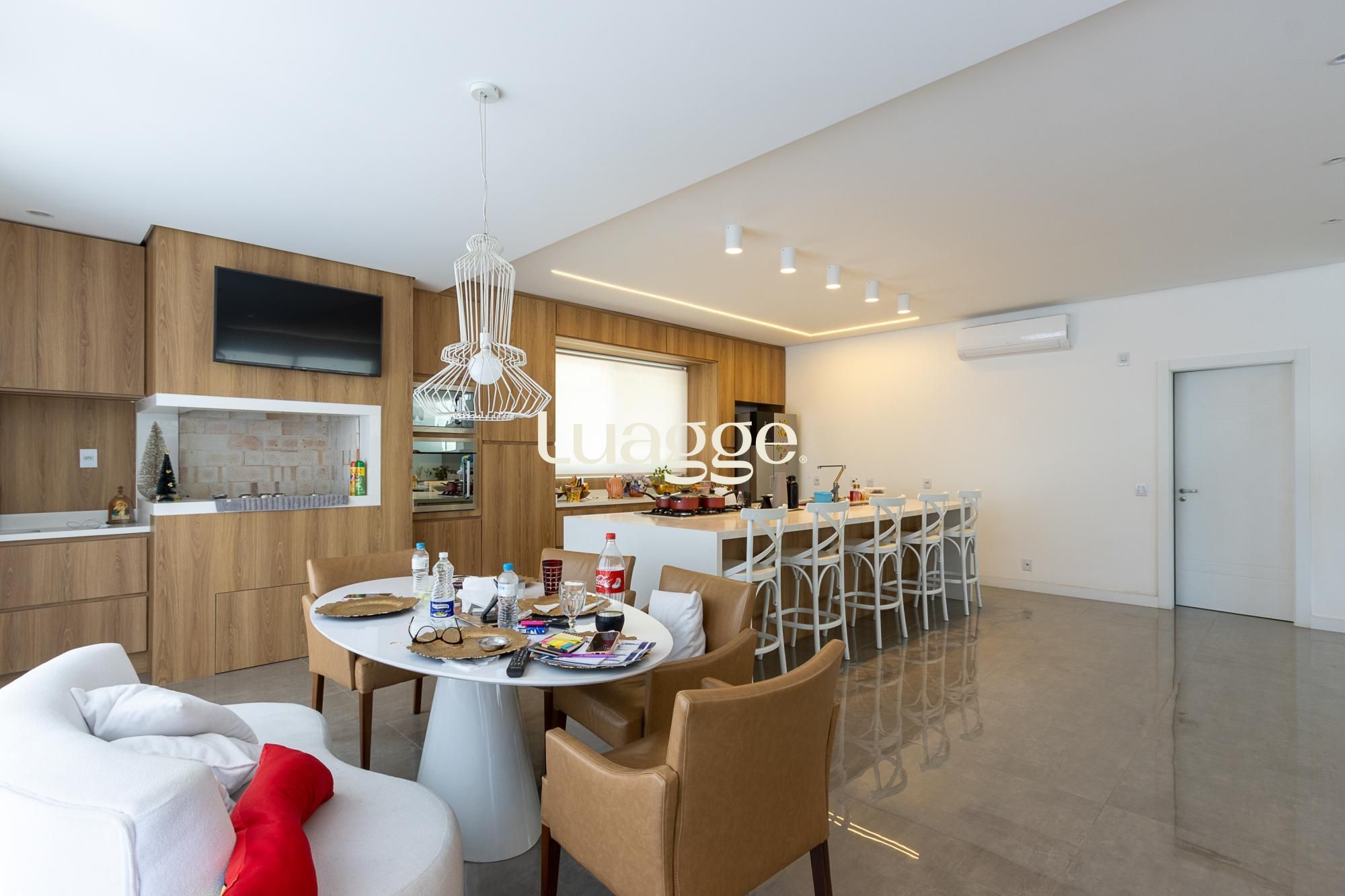 No andar térreo, os ambientes são amplos e integrados, com abertura para o pátio com piscina. Sala de estar com lareira, lavanderia, despensa e um ambiente versátil, ideal para escritório ou suíte térrea.