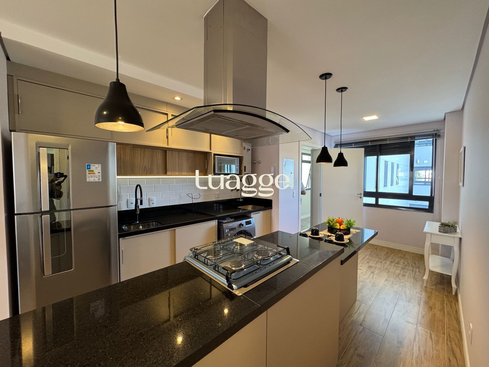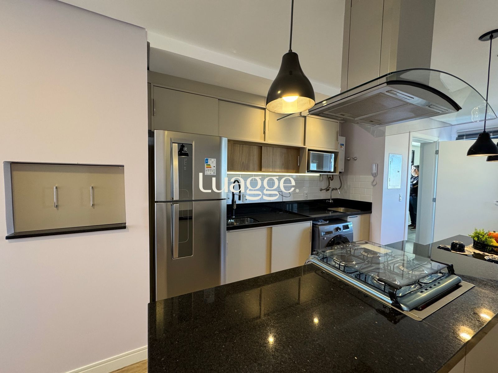 ✅ Cozinha americana com balcão em granito , com fogão cooktop , coifa , pia , geladeira