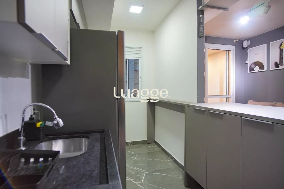 O imóvel possui 2 dormitórios, sendo 1 suíte, além de banheiro social. Living para dois ambientes, com integração entre sala de estar e jantar. Cozinha planejada com bancada em pedra São Rafael, armários sob medida e equipada com geladeira, cooktop, micro-ondas, máquina de lavar e junker. Área de serviço integrada e churrasqueira. Sacada com vista aberta.