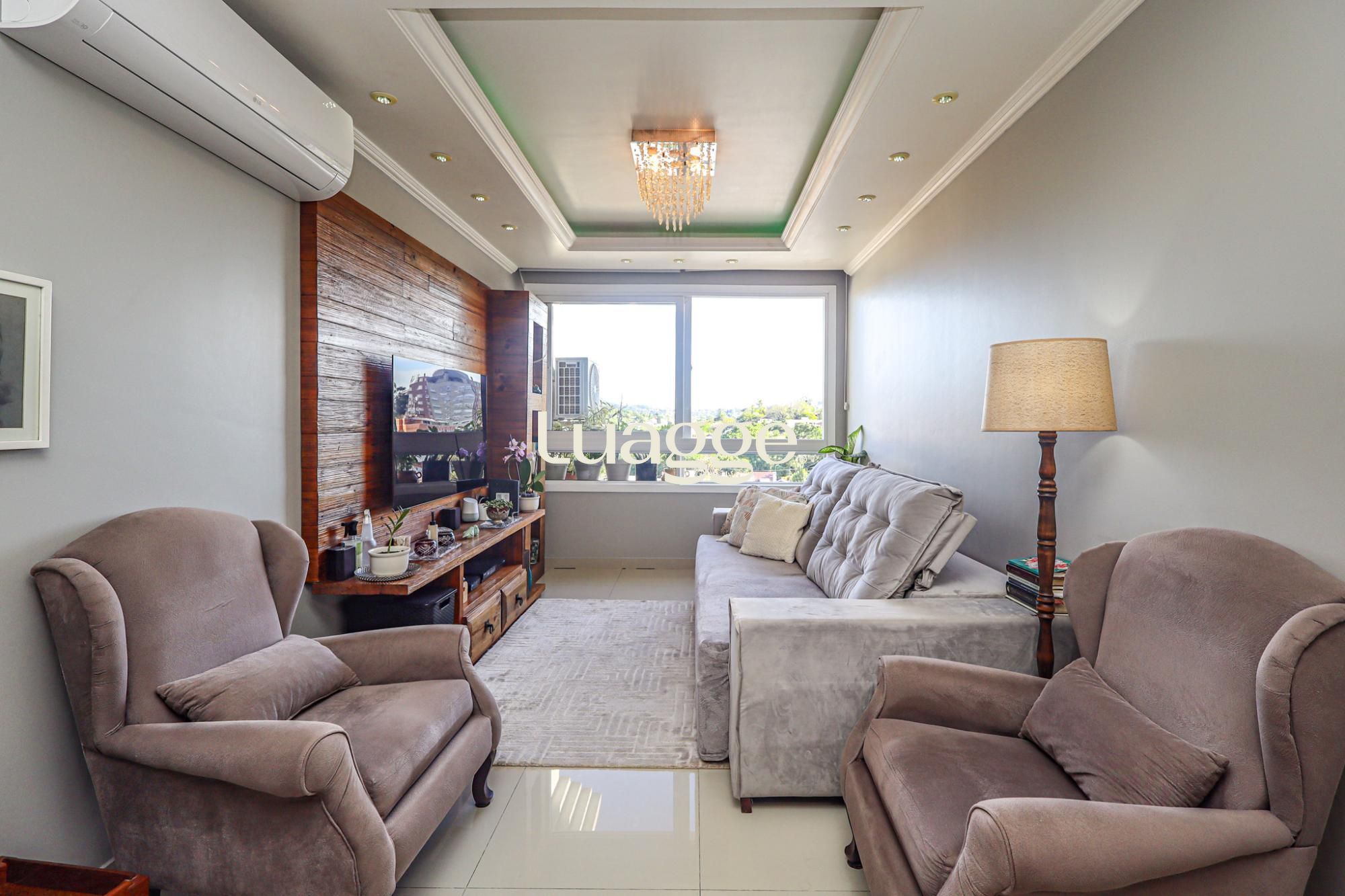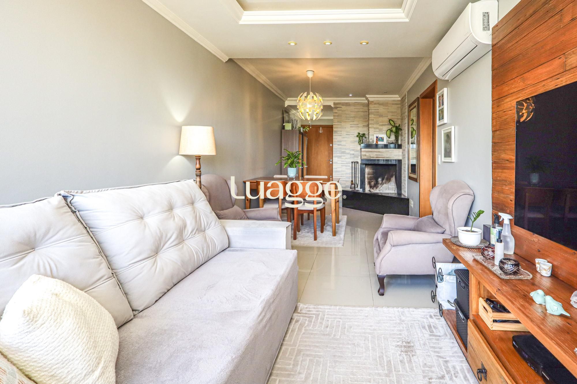 Apartamento semimobiliado com 72 m² de área privativa com 2 dormitórios sendo 1 suíte, banheiro social com ventilação natural, living amplo para 3 ambientes com lareira, cozinha montada com churrasqueira e área de serviço individual. Possui 2 vagas de garagem cobertas e escrituradas.