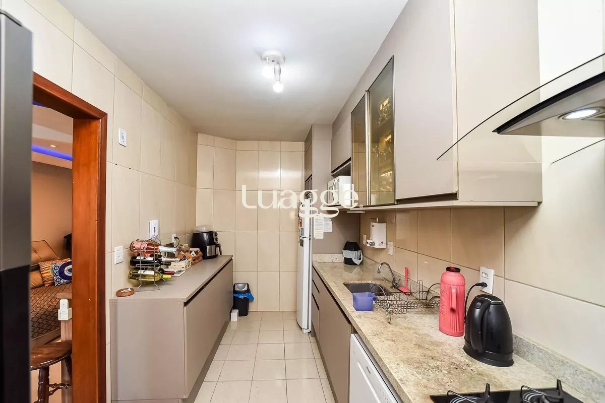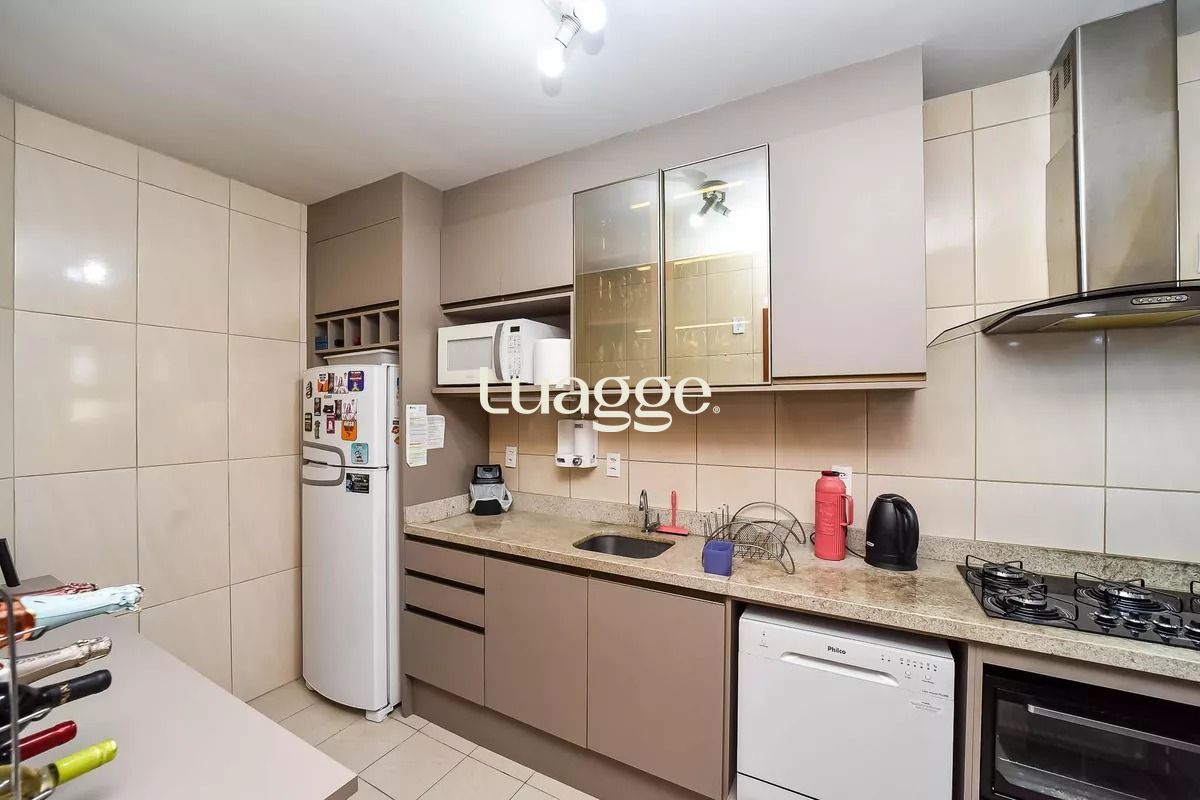 A sala é ampla, arejada e bem iluminada, com janelas grandes, ar-condicionado, móveis planejados sob medida e mesa de jantar. A cozinha é grande, ventilada e com excelente iluminação natural, equipada com armários, geladeira, fogão, máquina de lavar louça e liquidificador.