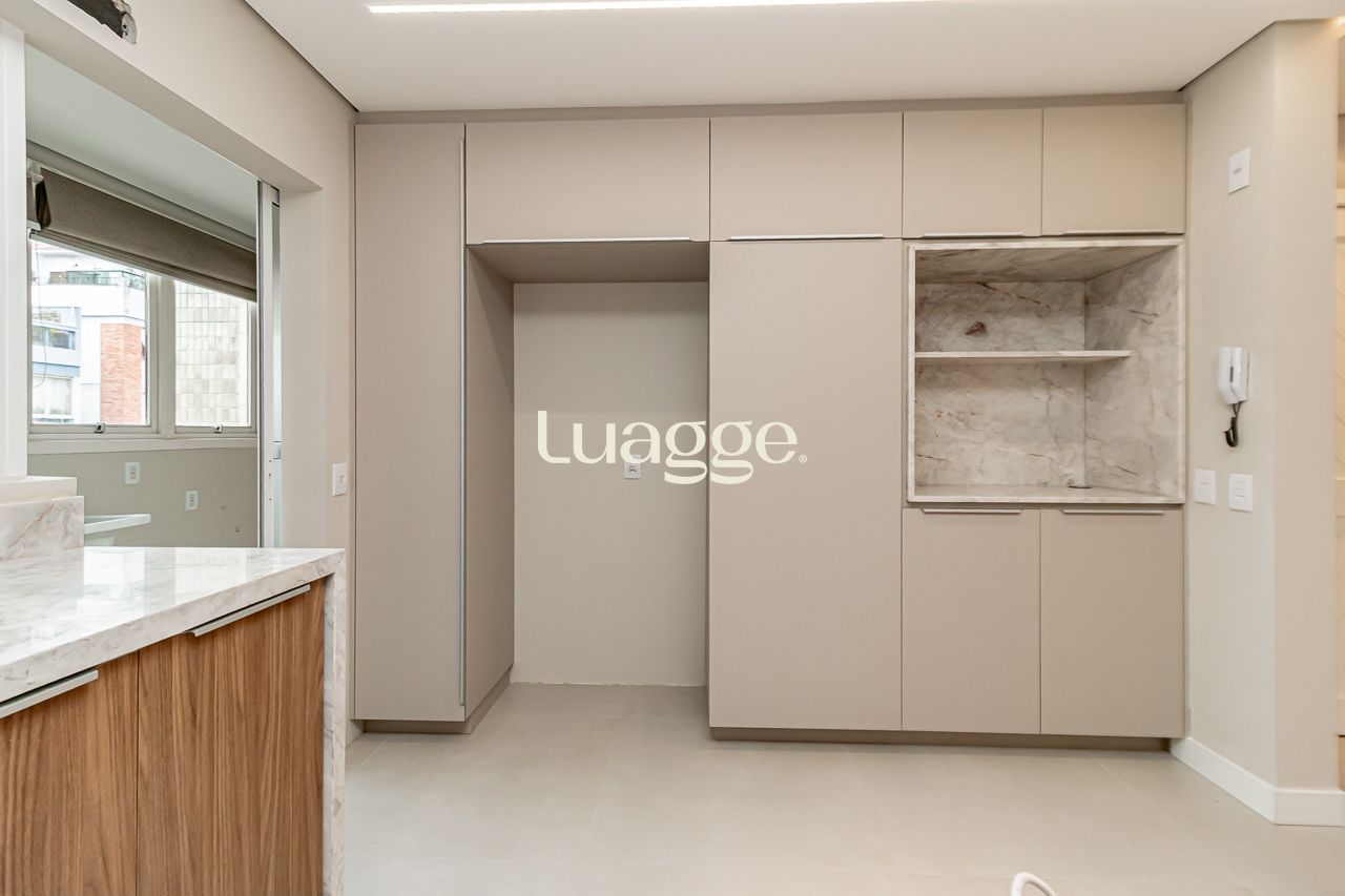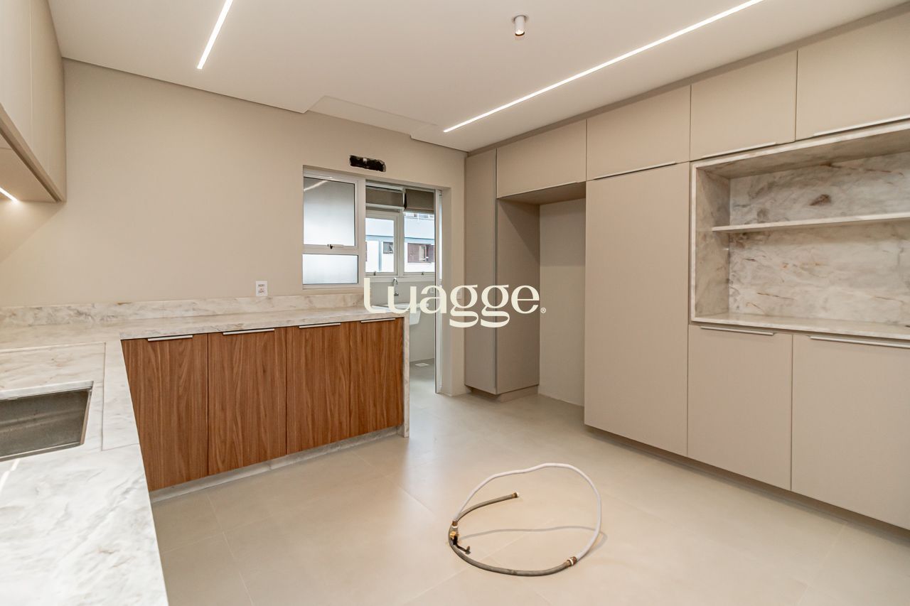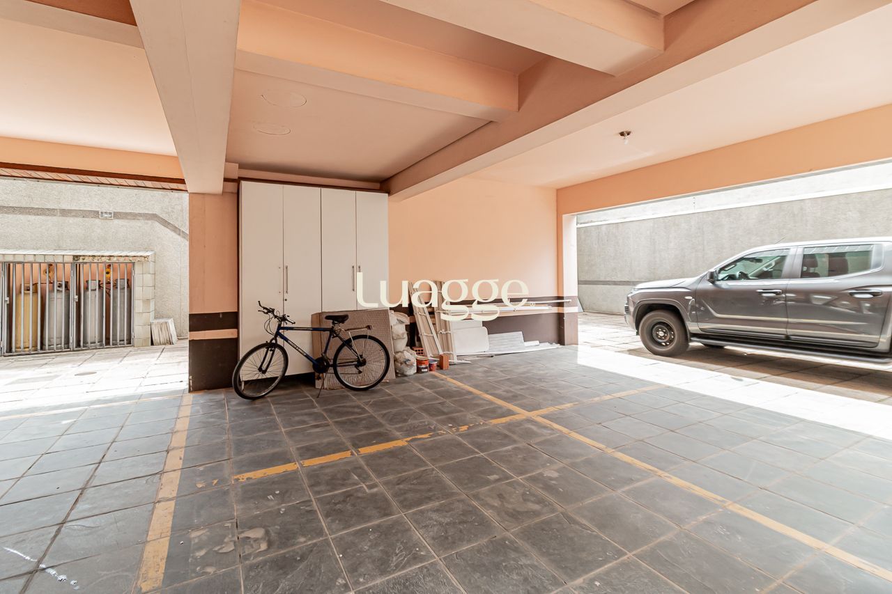 A cozinha, espaçosa e funcional, possui espera para ilha gourmet, além de área de serviço independente e dependência completa, garantindo praticidade no dia a dia. O imóvel dispõe ainda de 2 amplas vagas de garagem cobertas e escrituradas, sendo uma delas equipada com armário privativo.