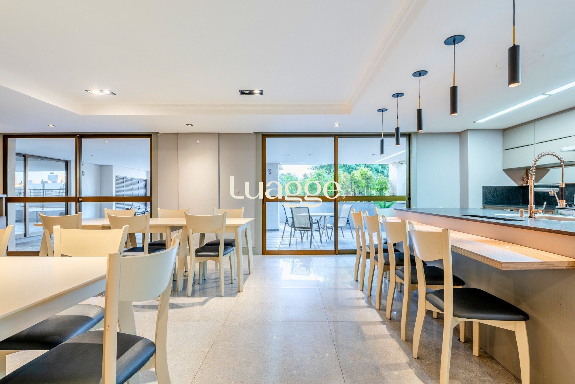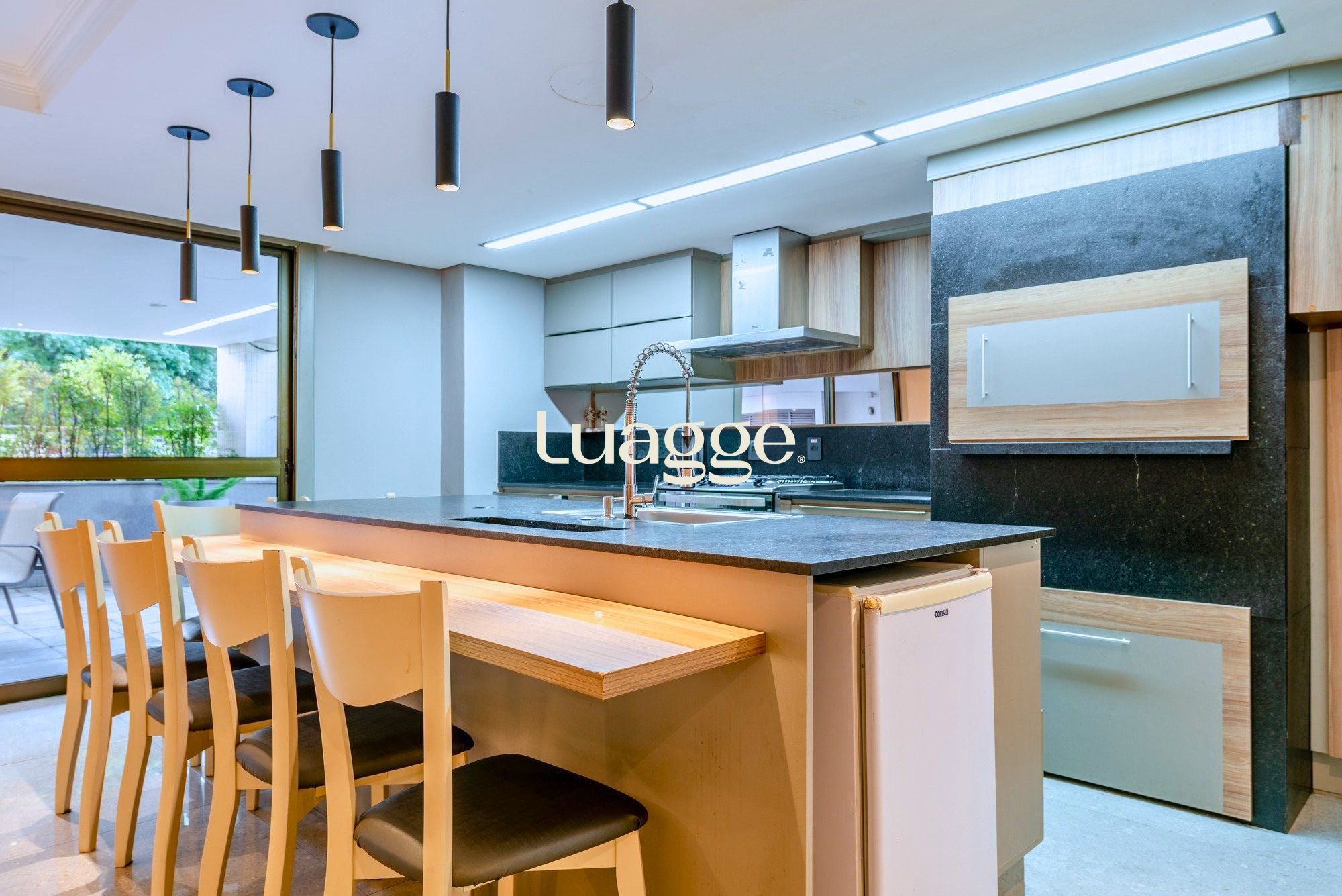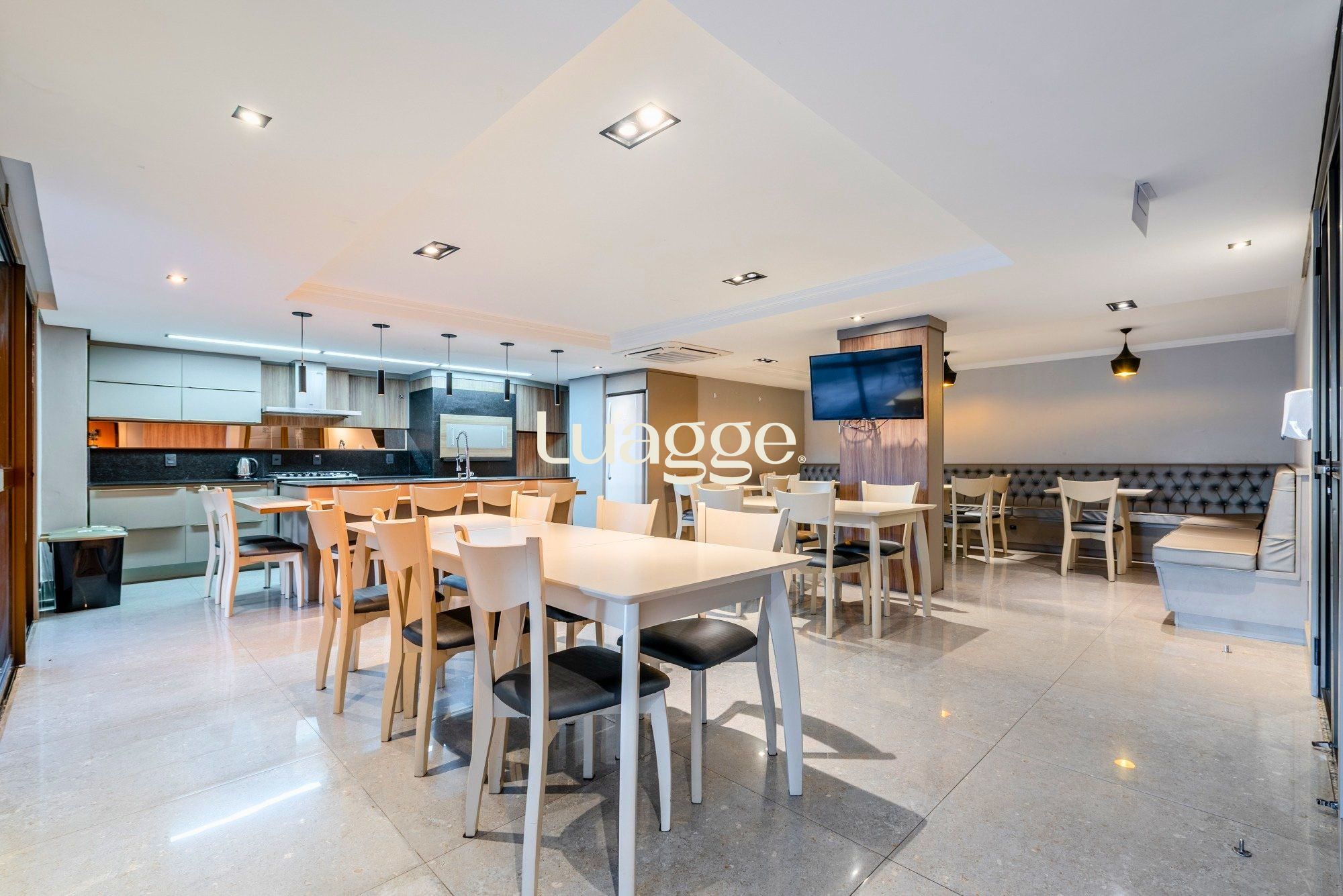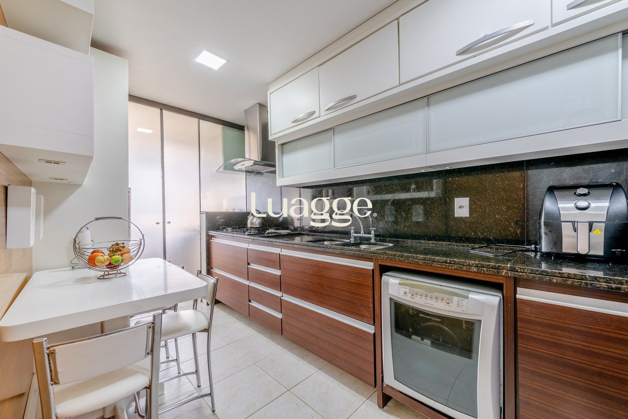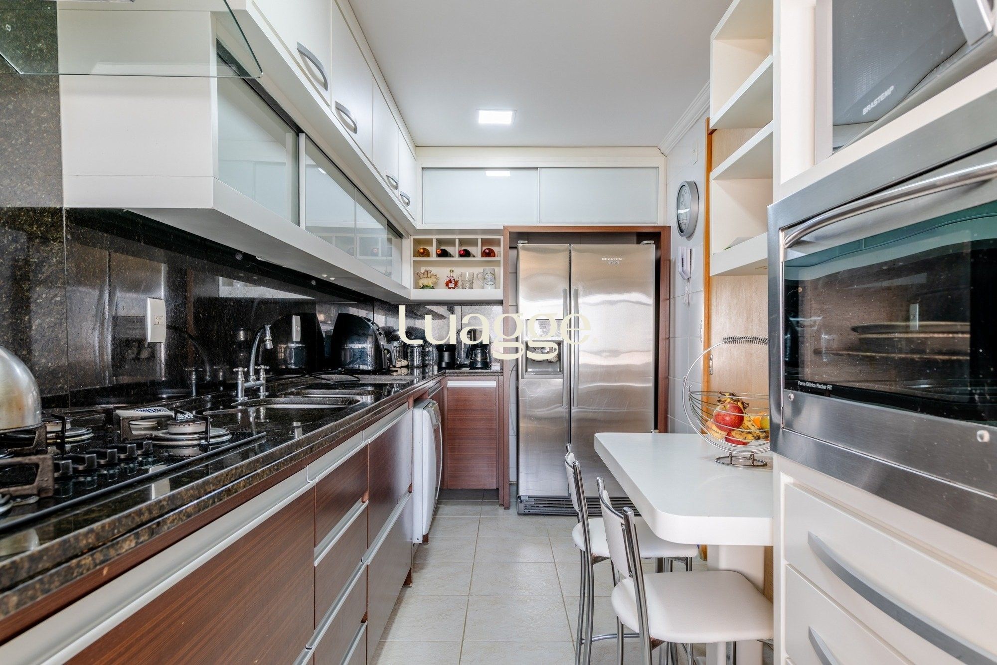 A cozinha é totalmente mobiliada, prática e bem distribuída, com área de serviço separada para maior organização no dia a dia.