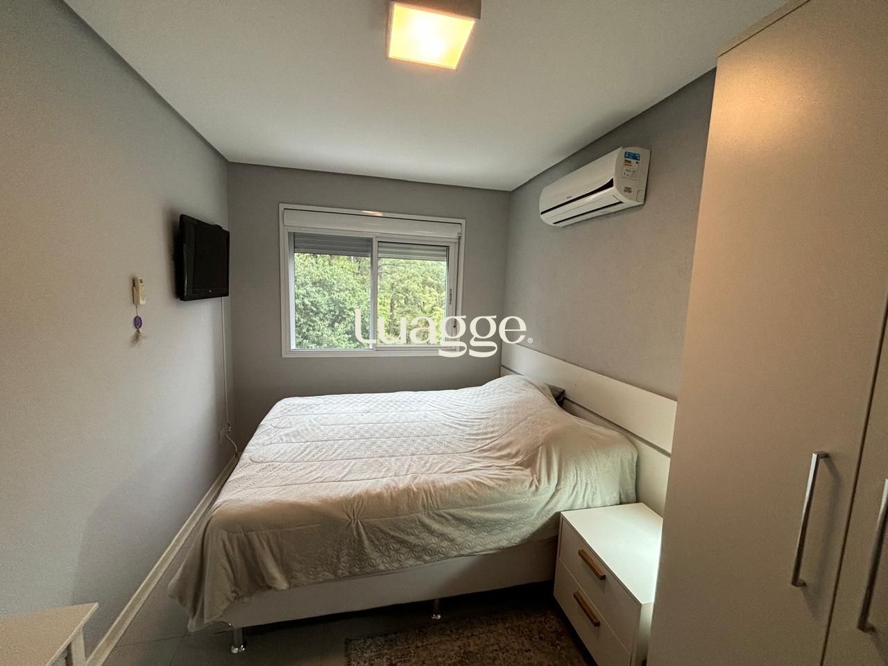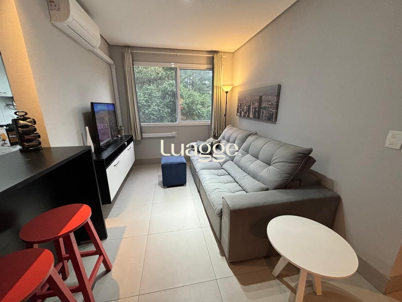 Apartamento mobiliado de 56 metros privativos. Ampla sala dois ambientes com janela grande e split. Cozinha americana com móveis planejados, geladeira, fogão e maquina de lavar. 2 dormitórios com uma suíte. Banheiro social. Duas vagas de garagem escrituradas. Sol da tarde.