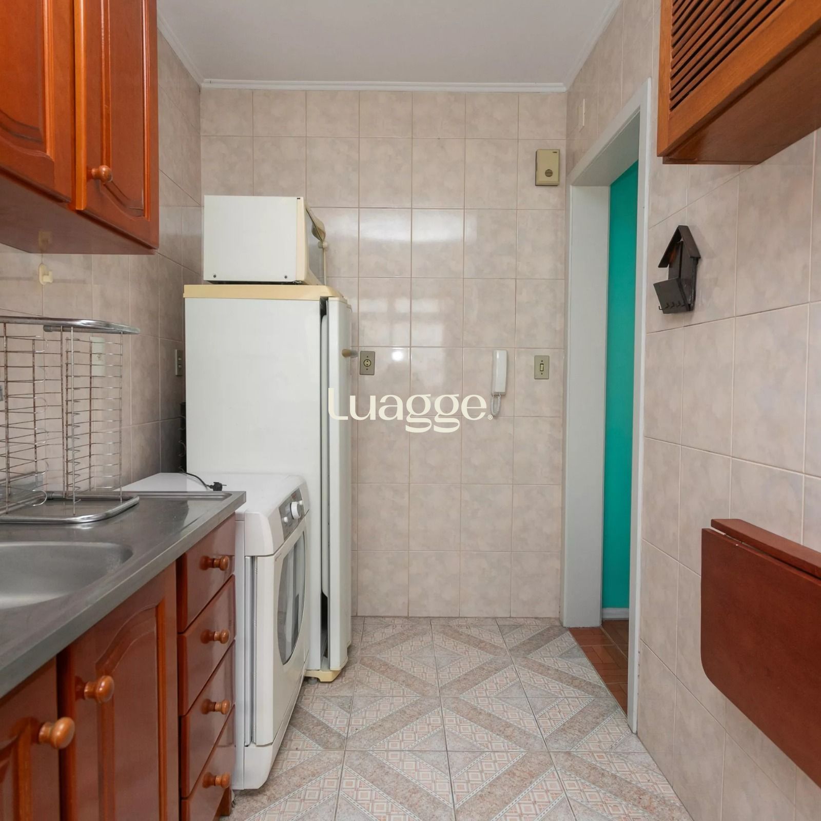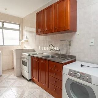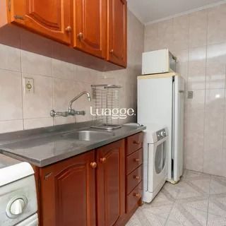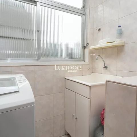 Cozinha ampla, ventilada e com ótima iluminação natural, equipada com armários sob medida, geladeira, fogão e micro-ondas, toda revestida em cerâmica e com janelas grandes. Área de serviço integrada à cozinha, arejada e iluminada, com máquina de lavar e tanque.