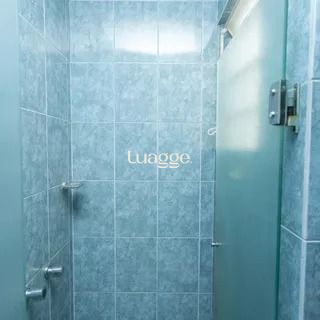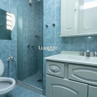 Banheiro totalmente revestido em cerâmica, com box de vidro, armários planejados, ambiente arejado e bem iluminado.