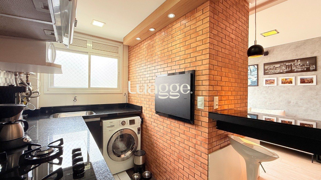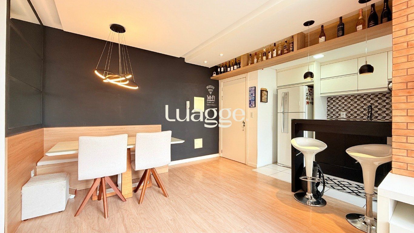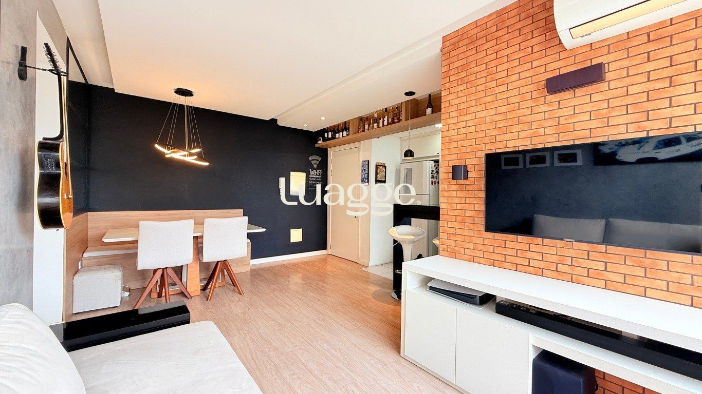 Apartamento de 2 dormitórios com suíte, sala ampla com 2 ambientes decorados, cozinha americana com churrasqueira, móveis planejados e área de serviço integrada. Banheiro com ventilação natural.