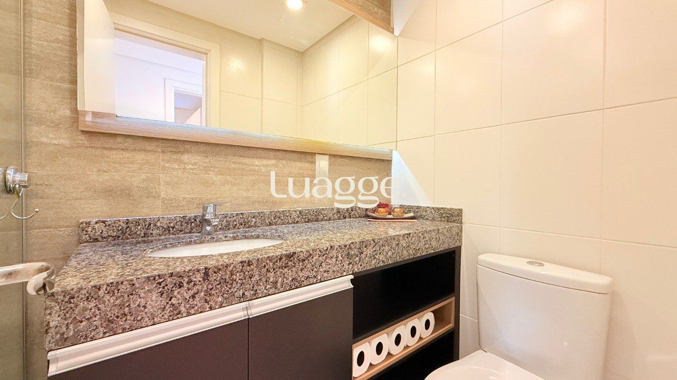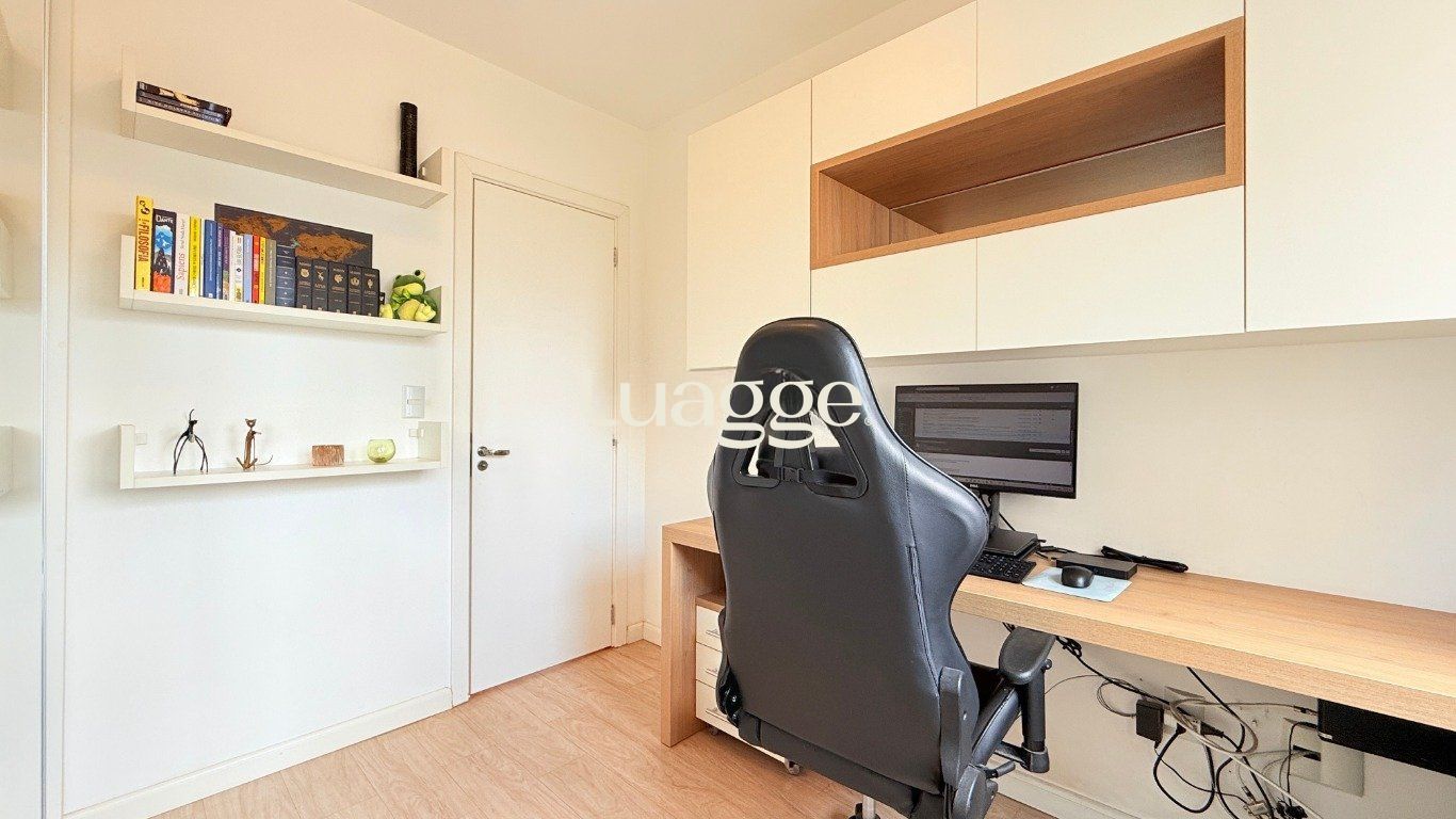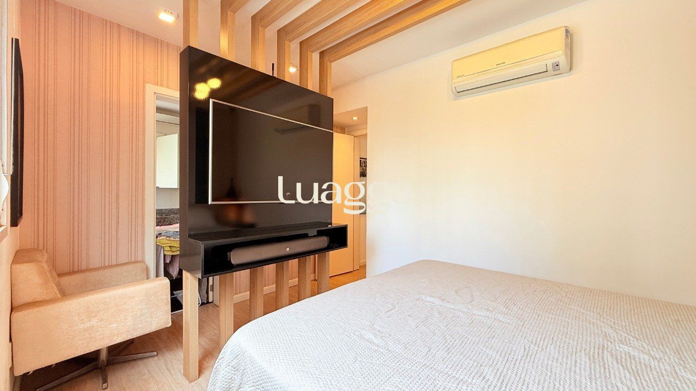 Apartamento de 2 dormitórios com suíte, sala ampla com 2 ambientes decorados, cozinha americana com churrasqueira, móveis planejados e área de serviço integrada. Banheiro com ventilação natural.