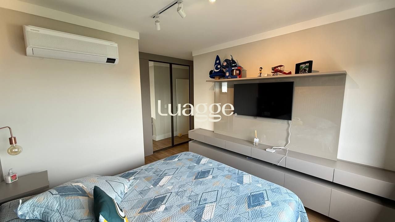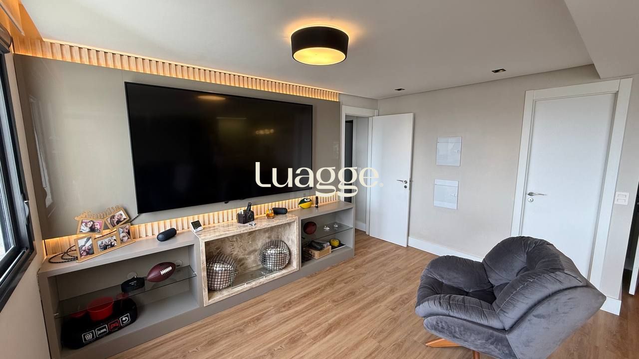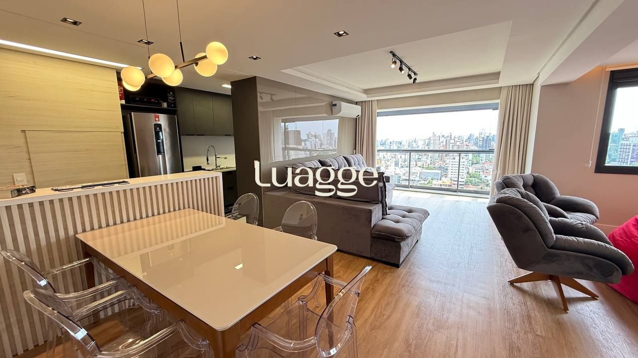 Um apartamento pronto para morar, com conforto, vista e excelente localização. Este imóvel mobiliado, com 99m² privativos, oferece um living acolhedor para dois ambientes, sacada com churrasqueira, janelas com isolamento acústico e uma vista panorâmica que valoriza cada momento em casa. São dois dormitórios, sendo uma suíte espaçosa. A cozinha americana é moderna e funcional, equipada com forno elétrico, cooktop e móveis sob medida. O imóvel ainda conta com lavabo, área de serviço e duas vagas de garagem.
