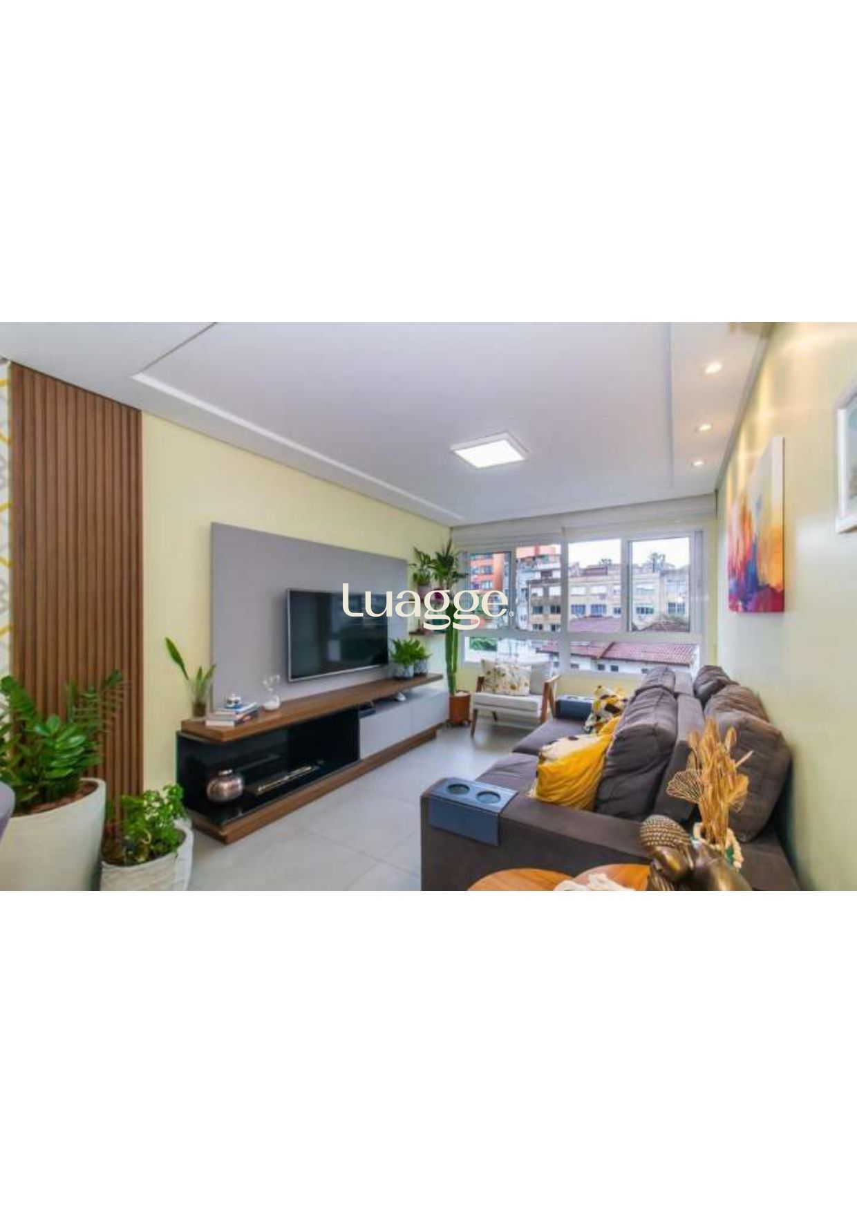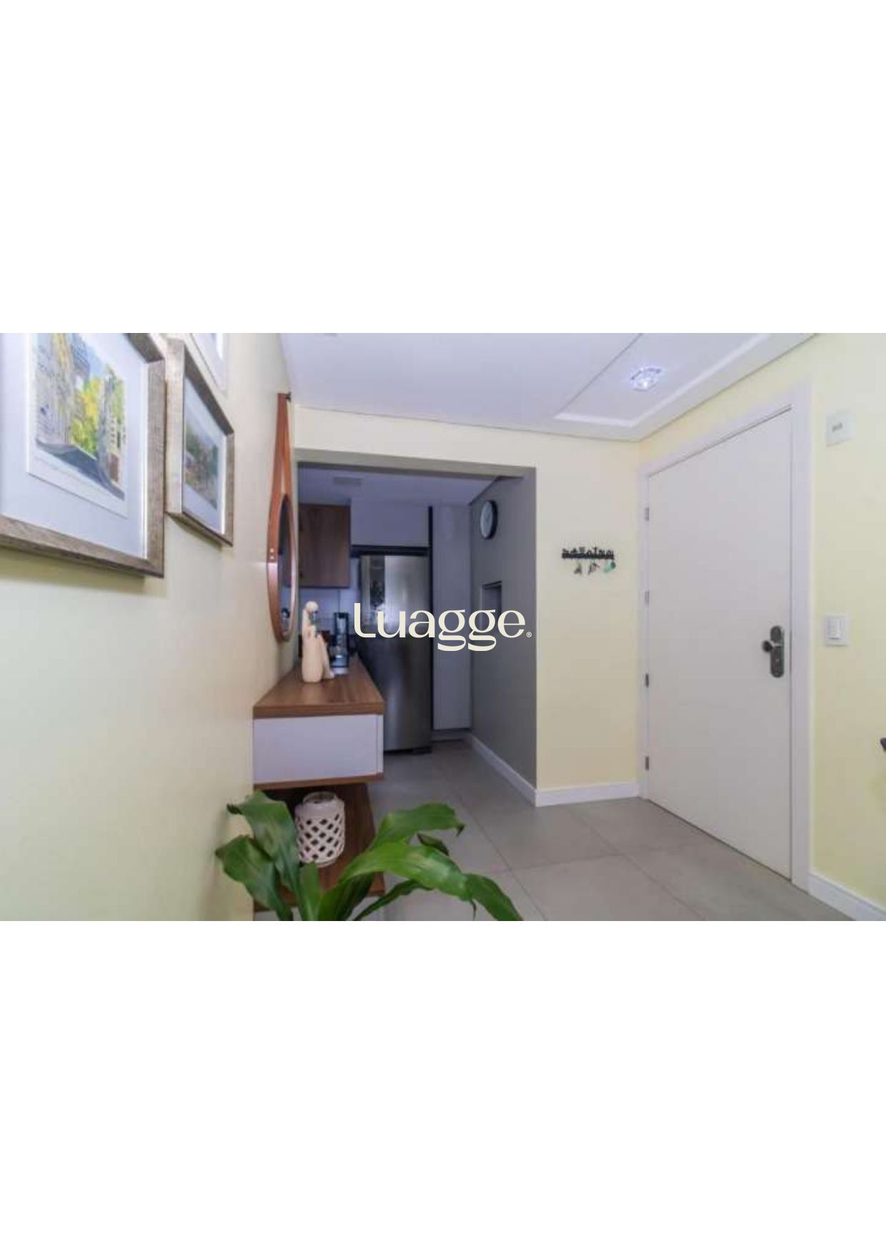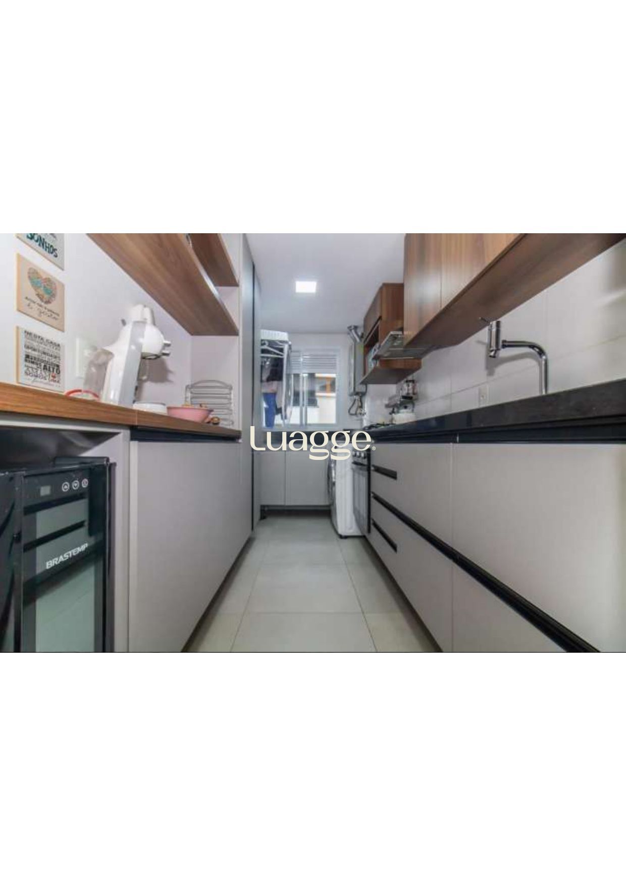 2 Dormitórios (1 suite), banho social, living 2 ambientes em piso porcelanato com lareira ecológica, cozinha montada com espaço churrasco e área de serviço integrada.