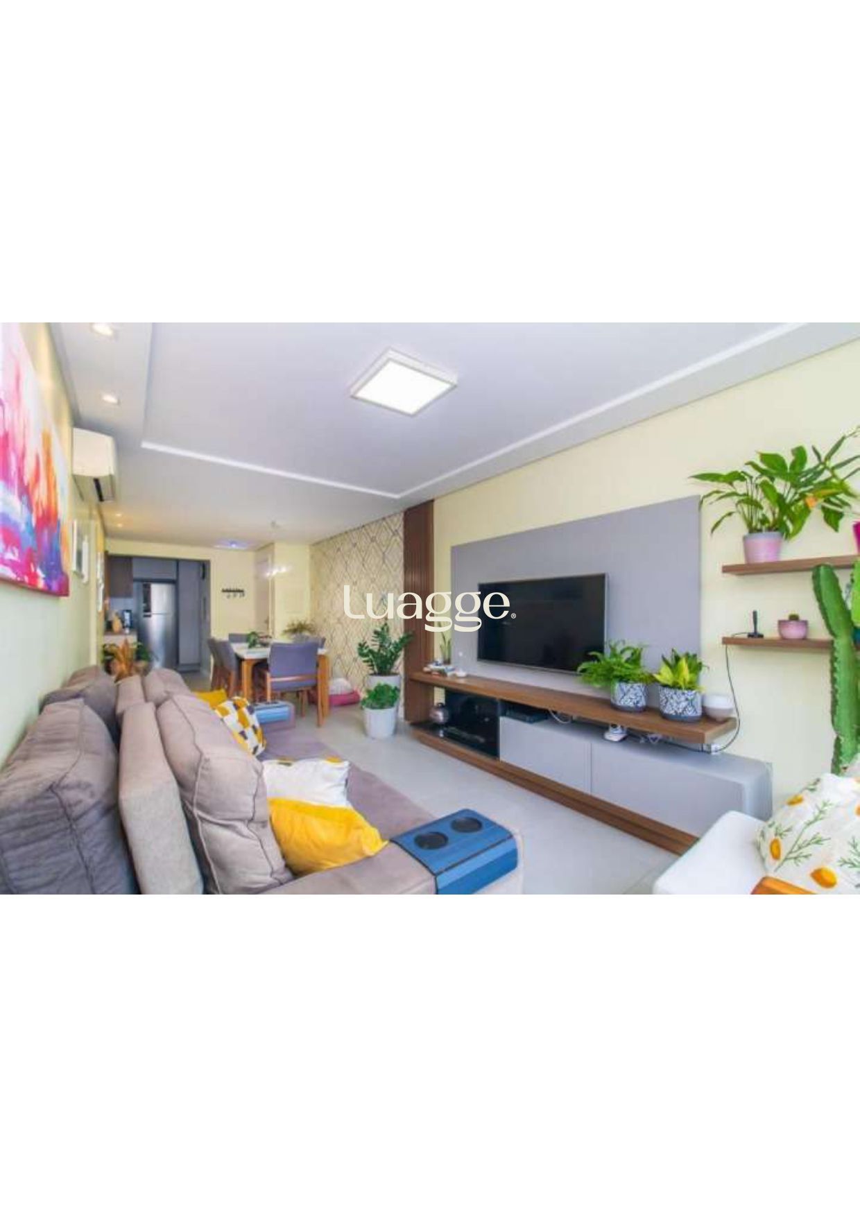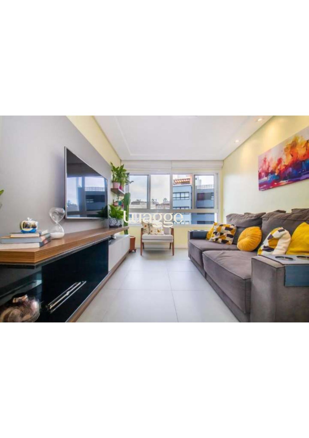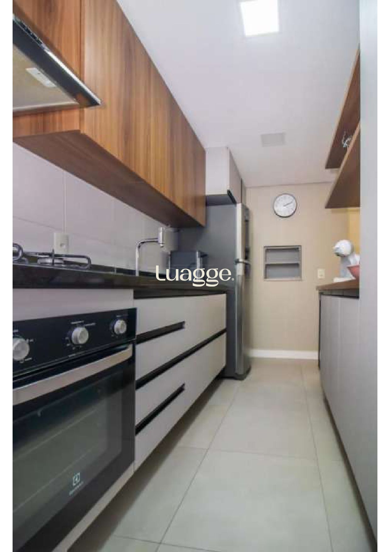 2 Dormitórios (1 suite), banho social, living 2 ambientes em piso porcelanato com lareira ecológica, cozinha montada com espaço churrasco e área de serviço integrada.