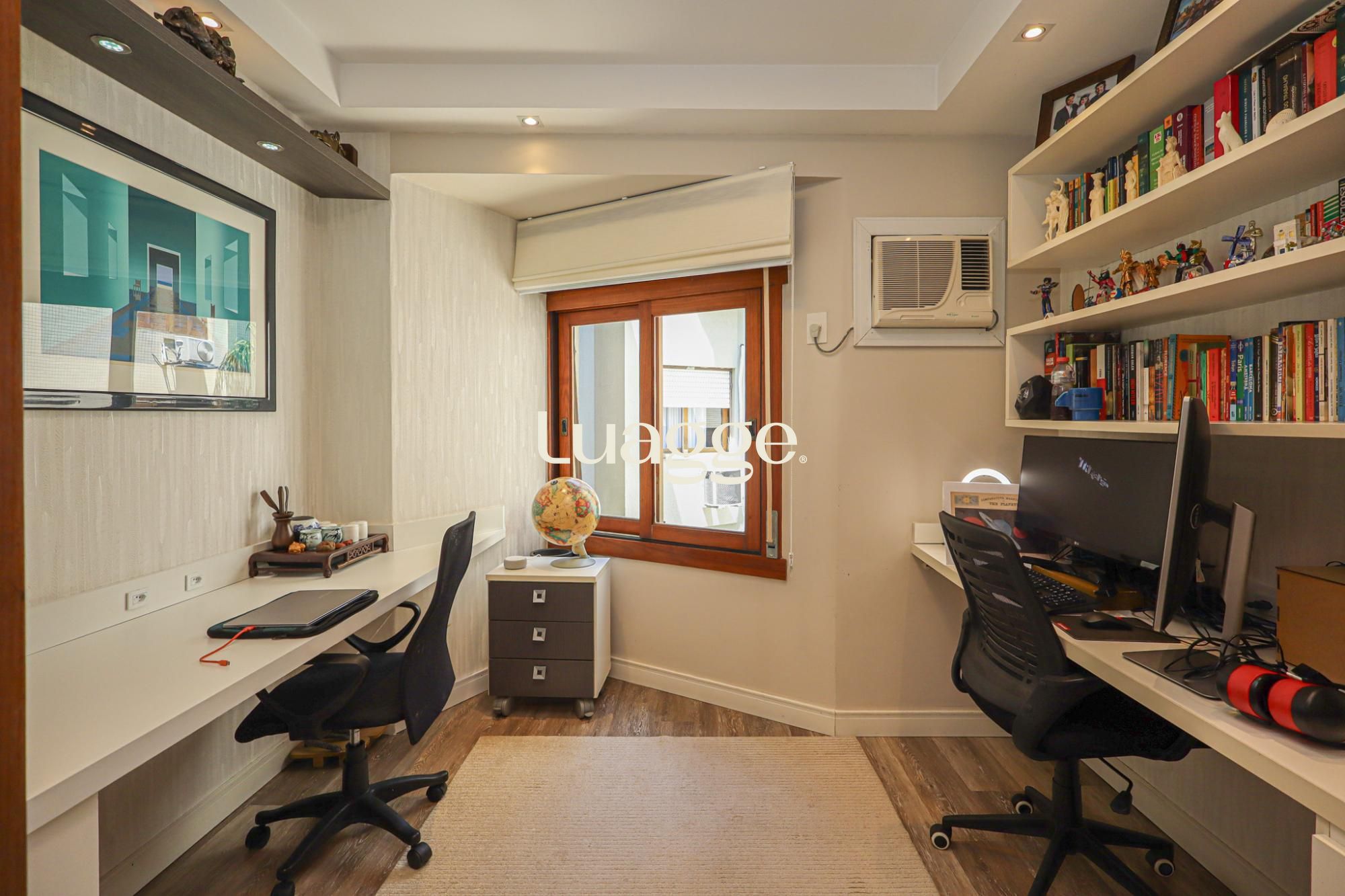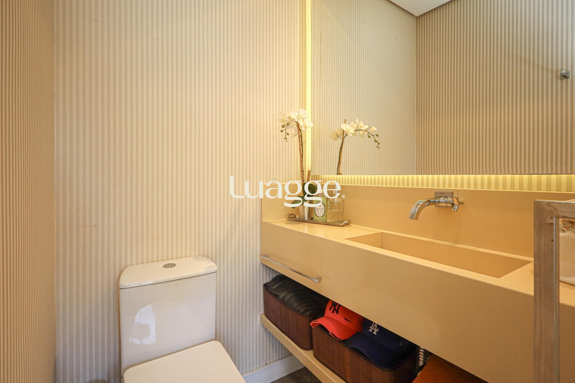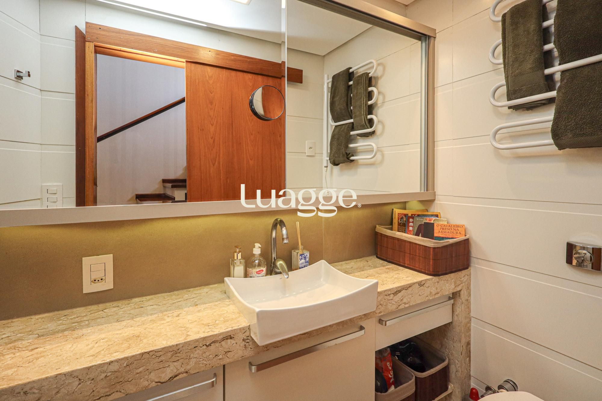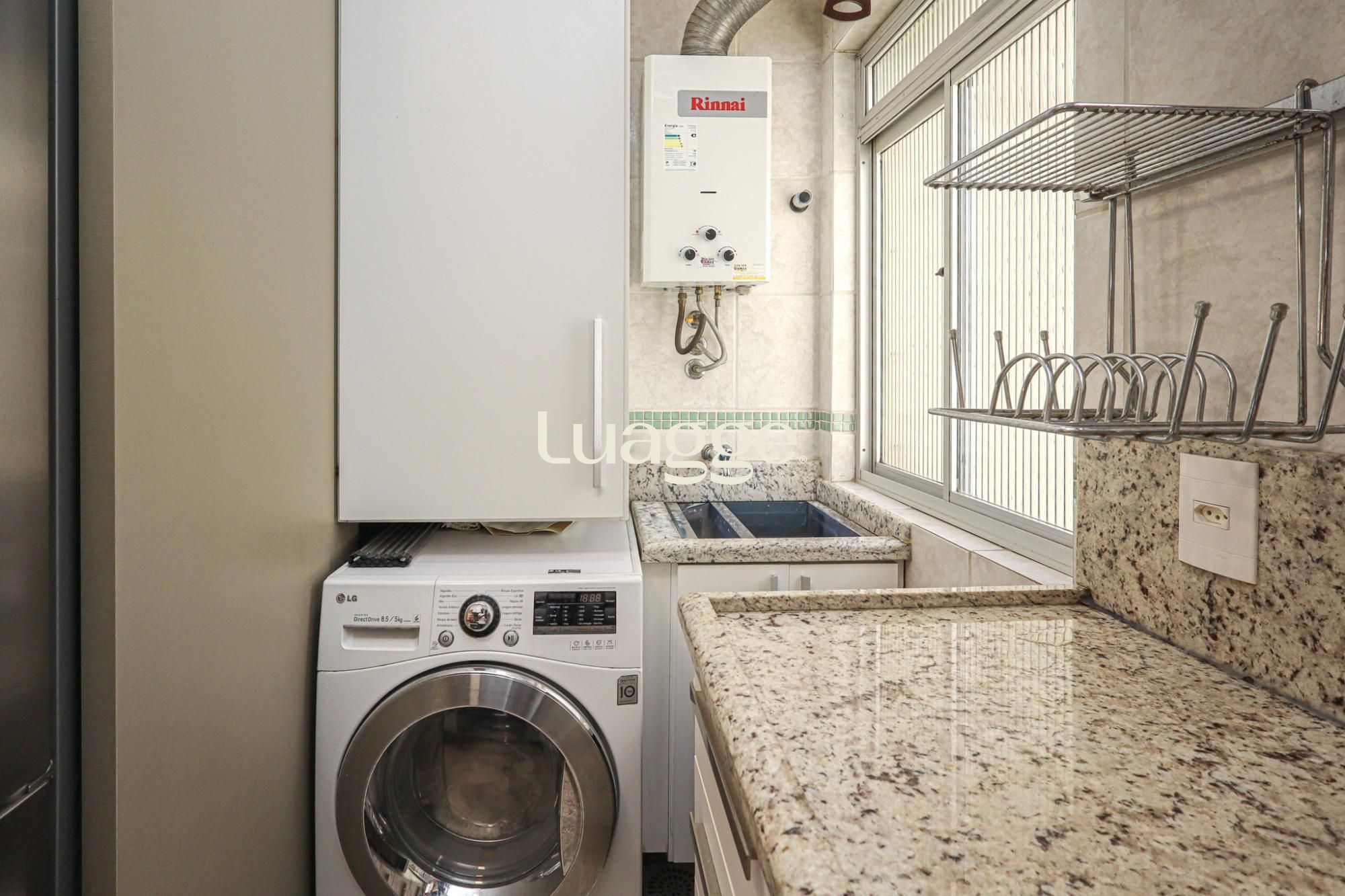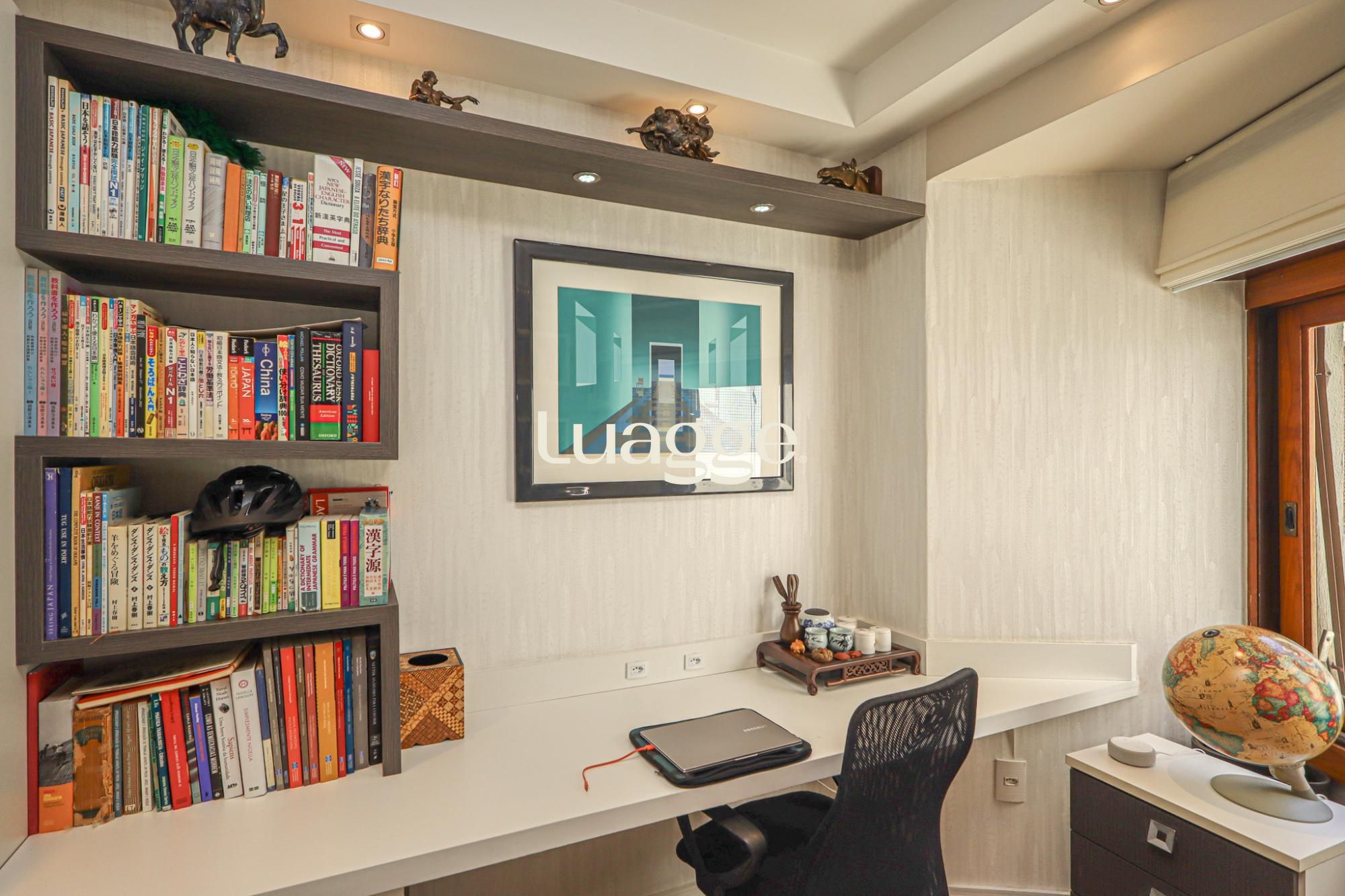 O terceiro pavimento conta com sala de estar íntima com lareira e duas sacadas — uma aberta com churrasqueira e outra fechada, utilizada como lavanderia com armários.