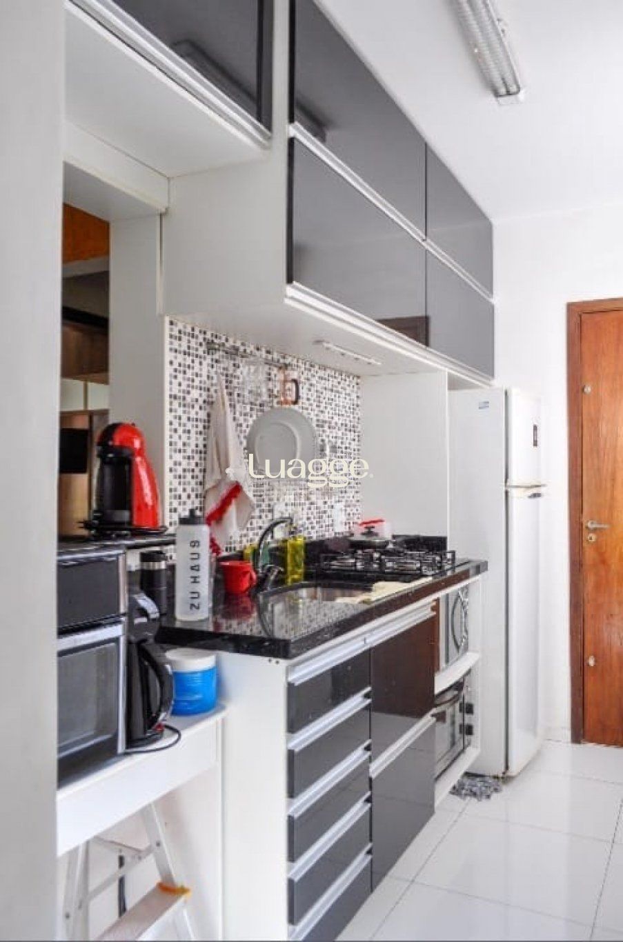 Cozinha com ótimo aproveitamento de espaço, equipada com móveis sob medida, geladeira, micro-ondas, forno elétrico e fogão cooktop. Ambiente todo revestido em cerâmica, com janela ampla que garante boa ventilação e iluminação natural.