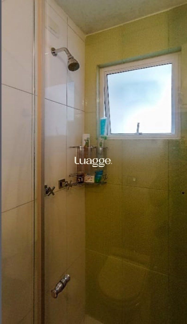 Banheiro amplo, ventilado e iluminado, com armários planejados, box de vidro e janela com abertura para o exterior.