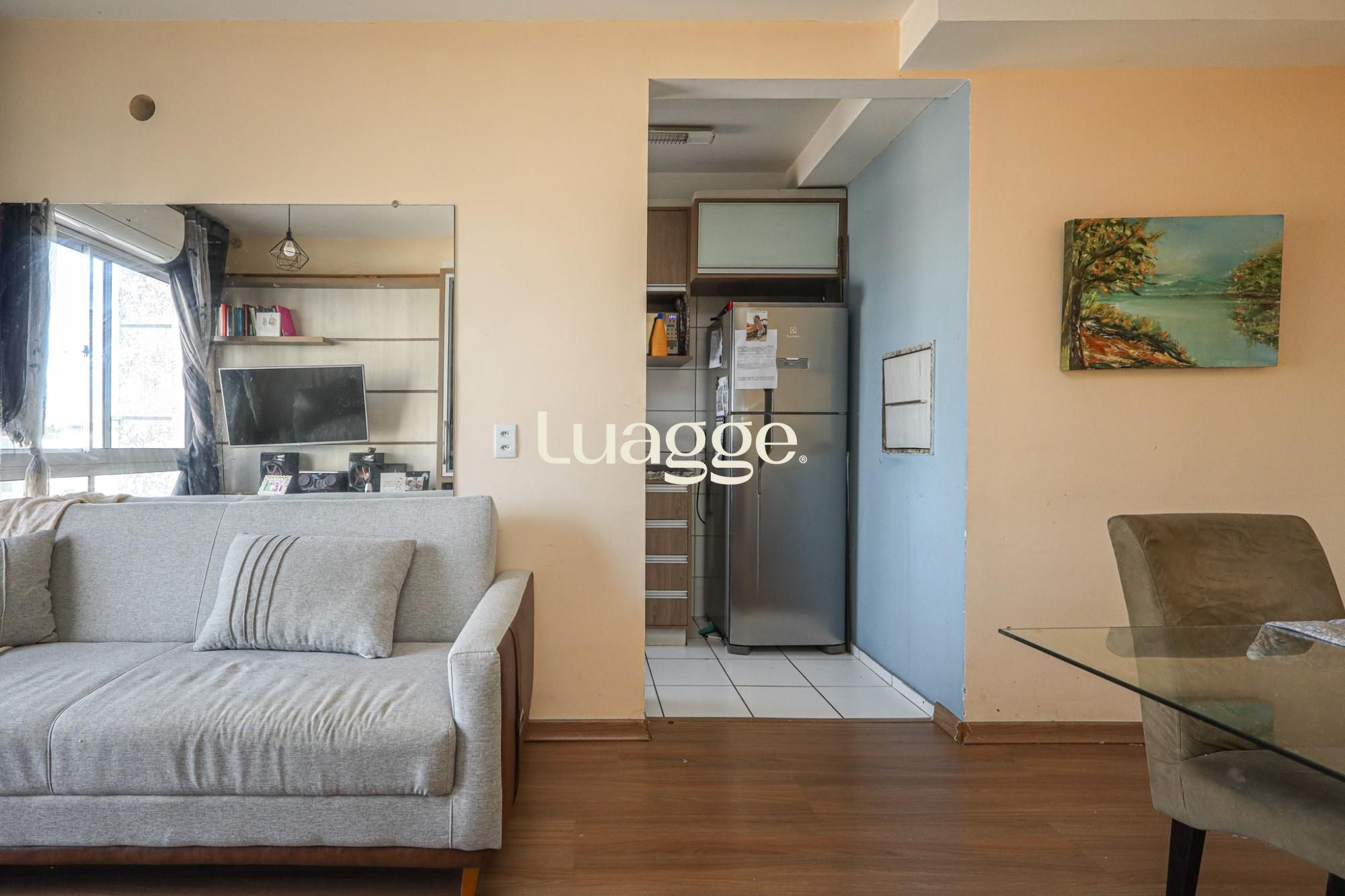 Apartamento semimobiliado com 57 m² de área privativas com 2 dormitórios sendo 1 suíte, banheiro social, living para 2 ambientes, cozinha americana montada com churrasqueira e área de serviço. Possui 1 vaga de garagem escriturada.