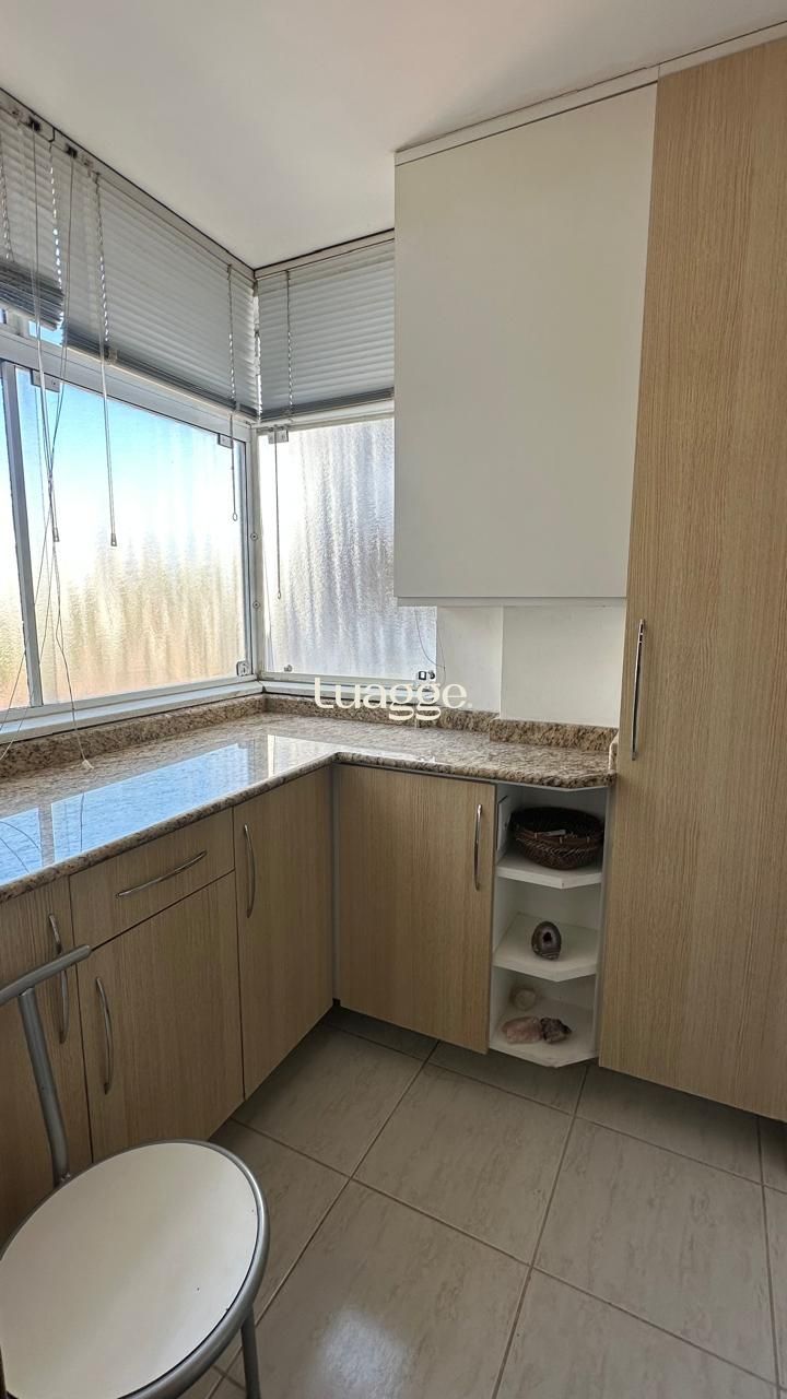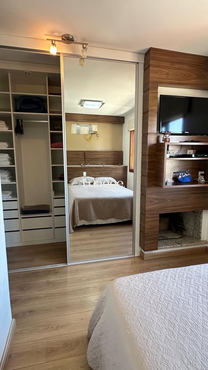 Dois dormitórios, sendo uma suíte com closet e lareira, cozinha ampla com passa pratos, área de serviços independente.