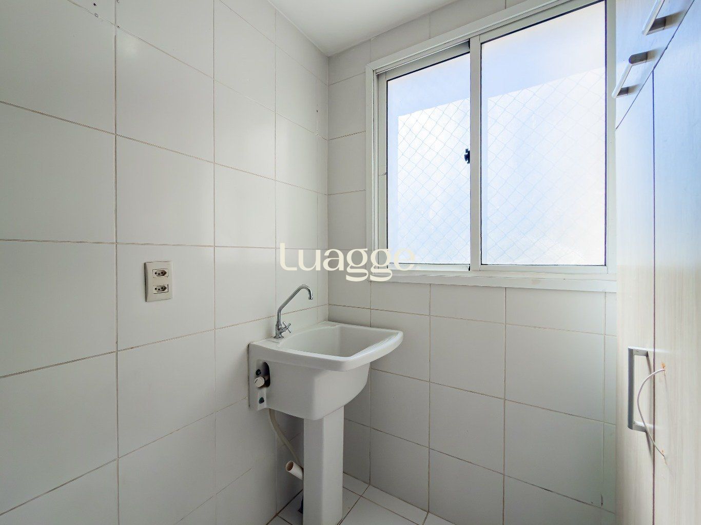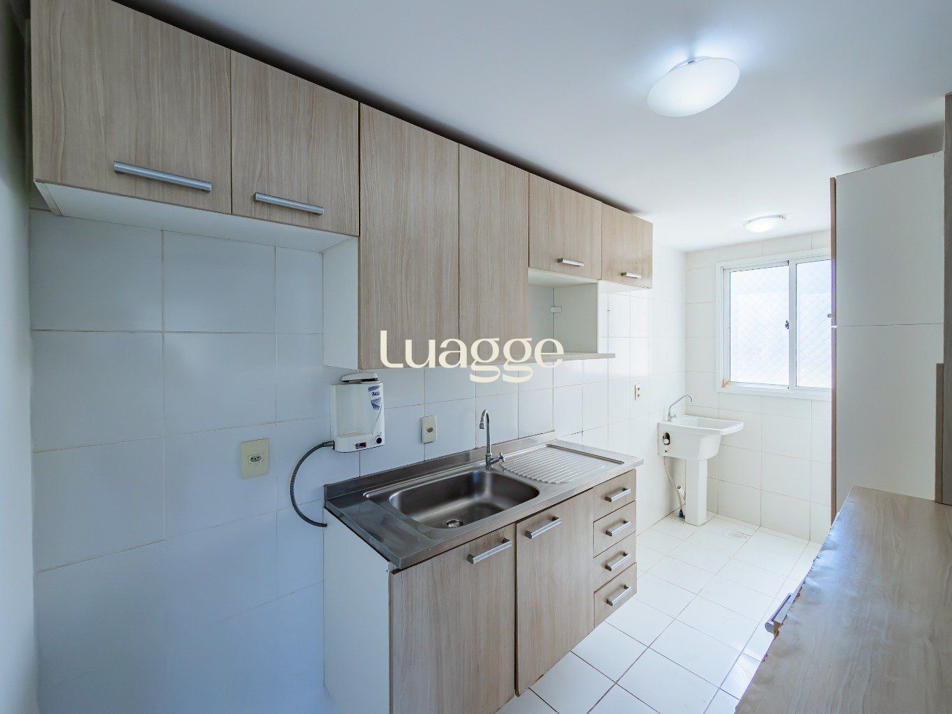 Área de serviço integrada com a cozinha arejada e iluminada com janelas grandes.