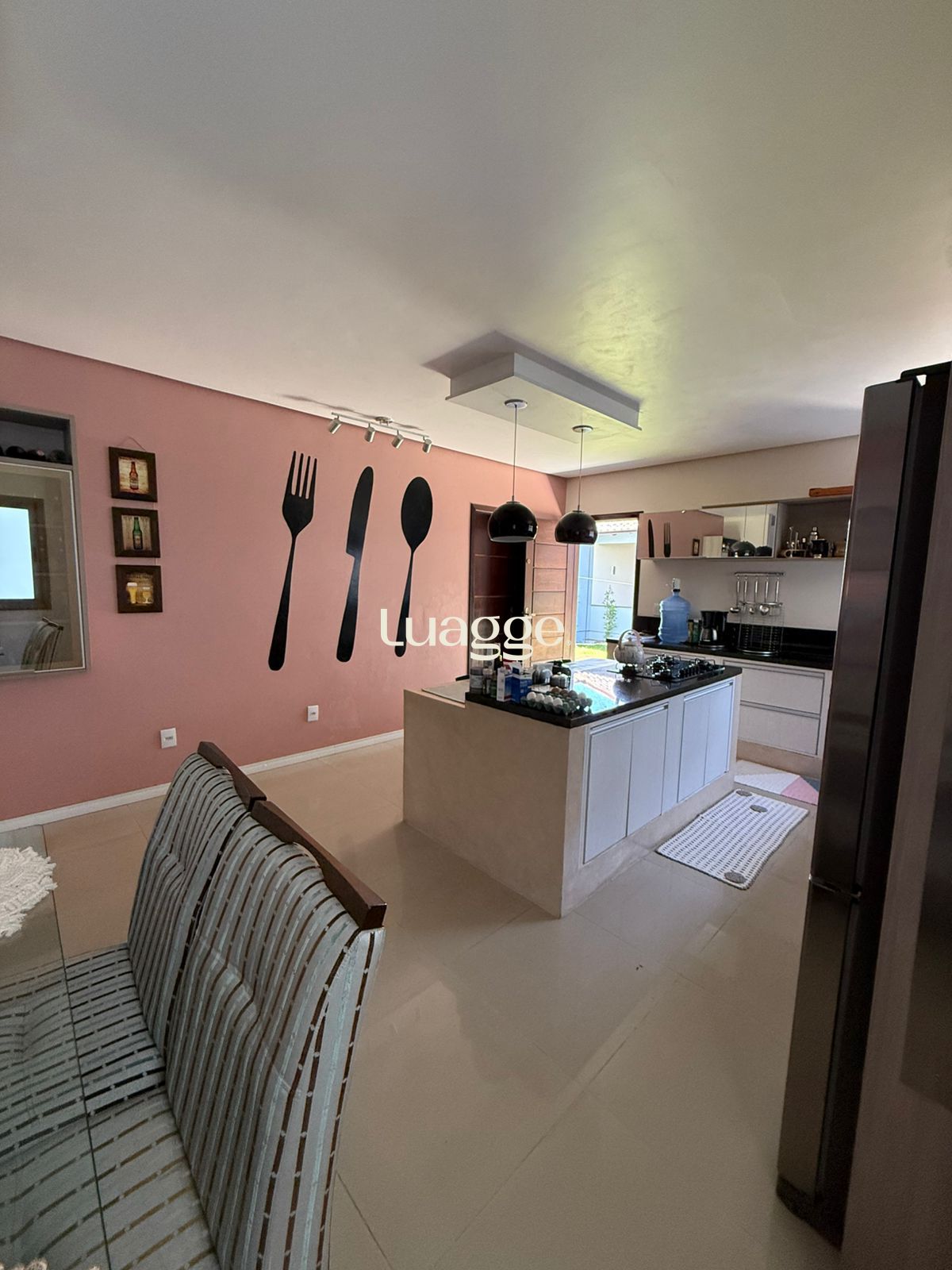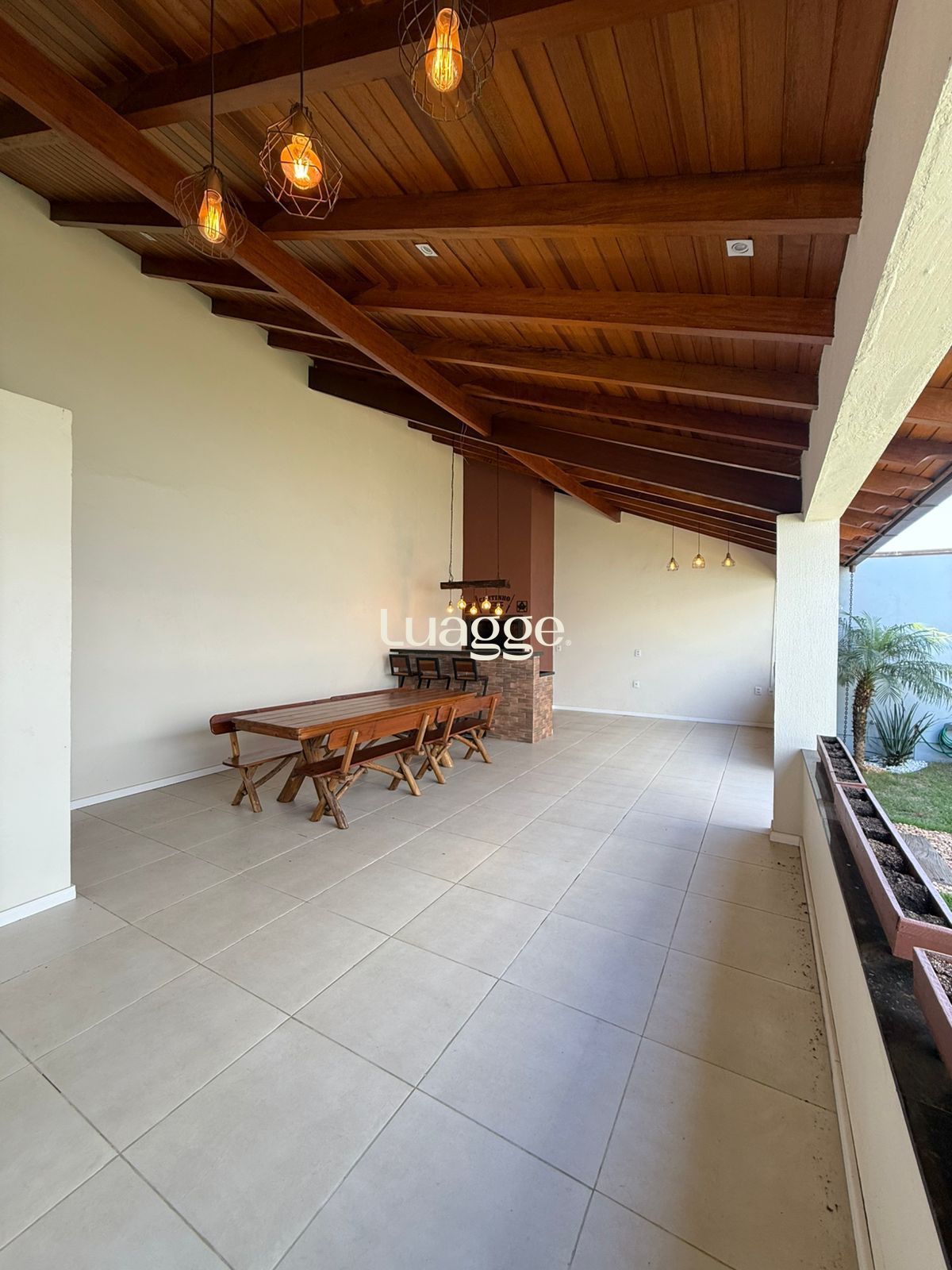 - Ampla área de churrasco, conta com uma ilha para 3 lugares e um lavabo; tem sua iluminação direta e conta com iluminação indireta estilo retrô/vintage;