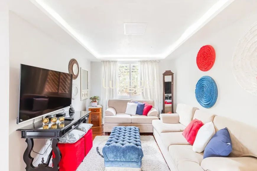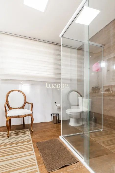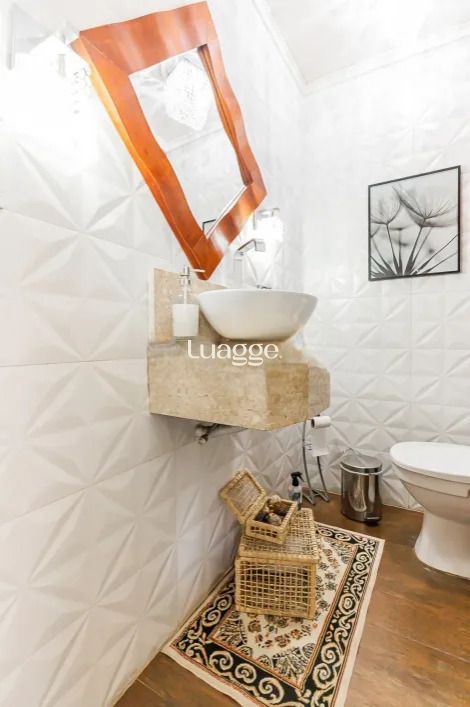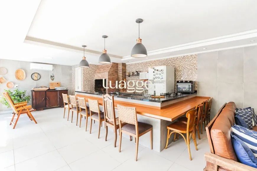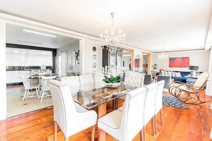 Casa com 4 dormitórios, sendo 1 suíte master de grandes proporções, com possibilidade de adaptação para 4 dormitórios. O living para 4 ambientes inclui sala de TV, sala de jantar, lareira e lavabo, além de uma cozinha montada. A área íntima está localizada no segundo pavimento, garantindo mais privacidade.