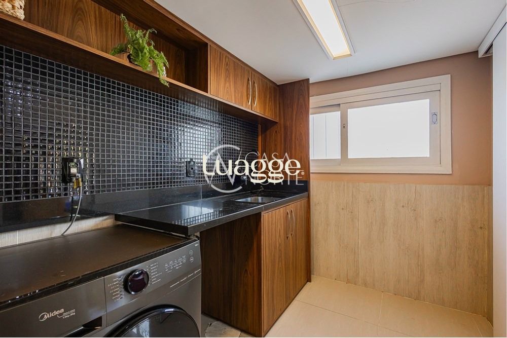 A área social se destaca pelo espaço gourmet completo, com ilha gourmet, geladeira side by side, torre quente e móveis planejados, criando um ambiente moderno e funcional. A cozinha é integrada e conta ainda com uma área de serviço separada e muito ampla.