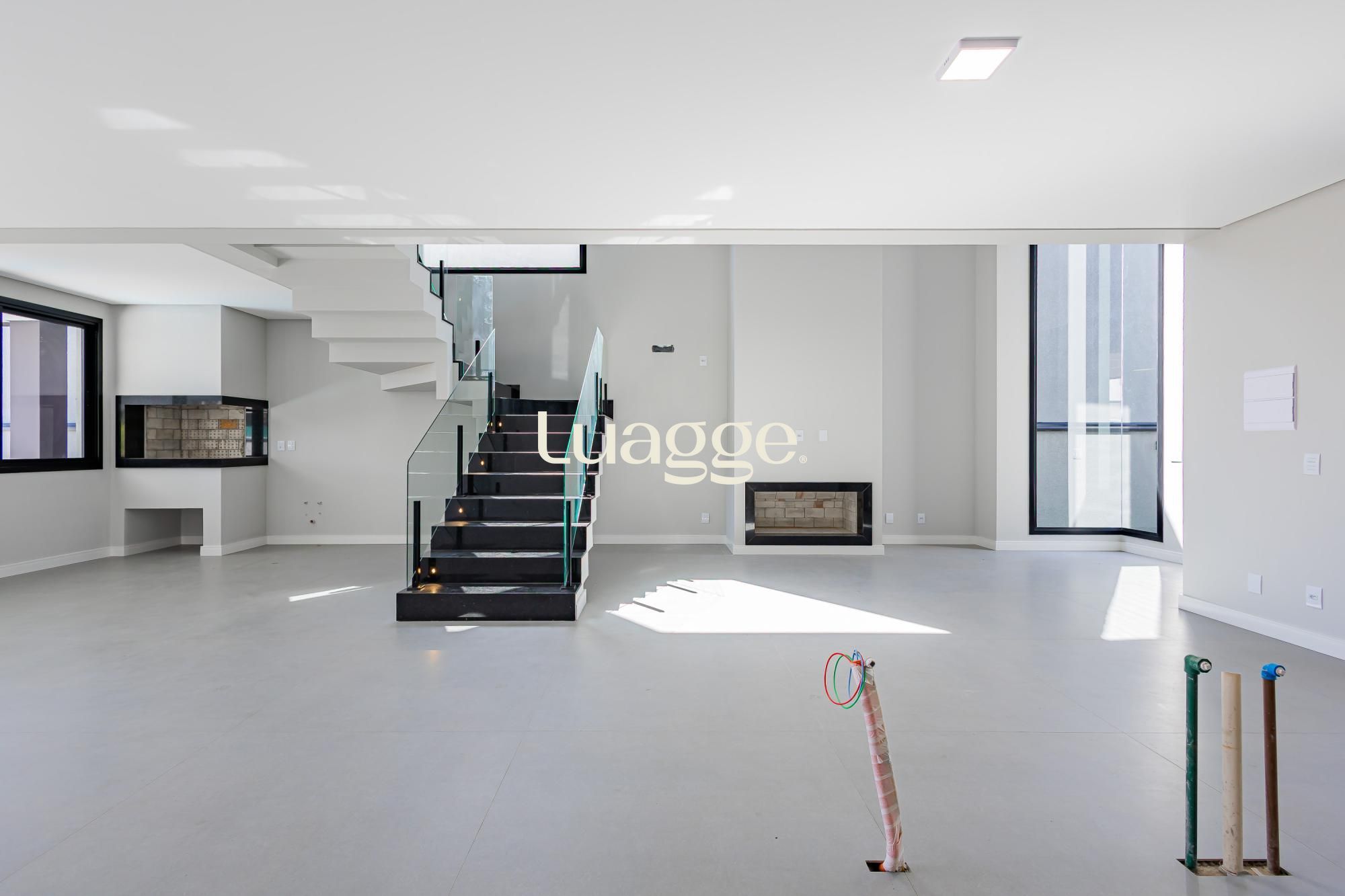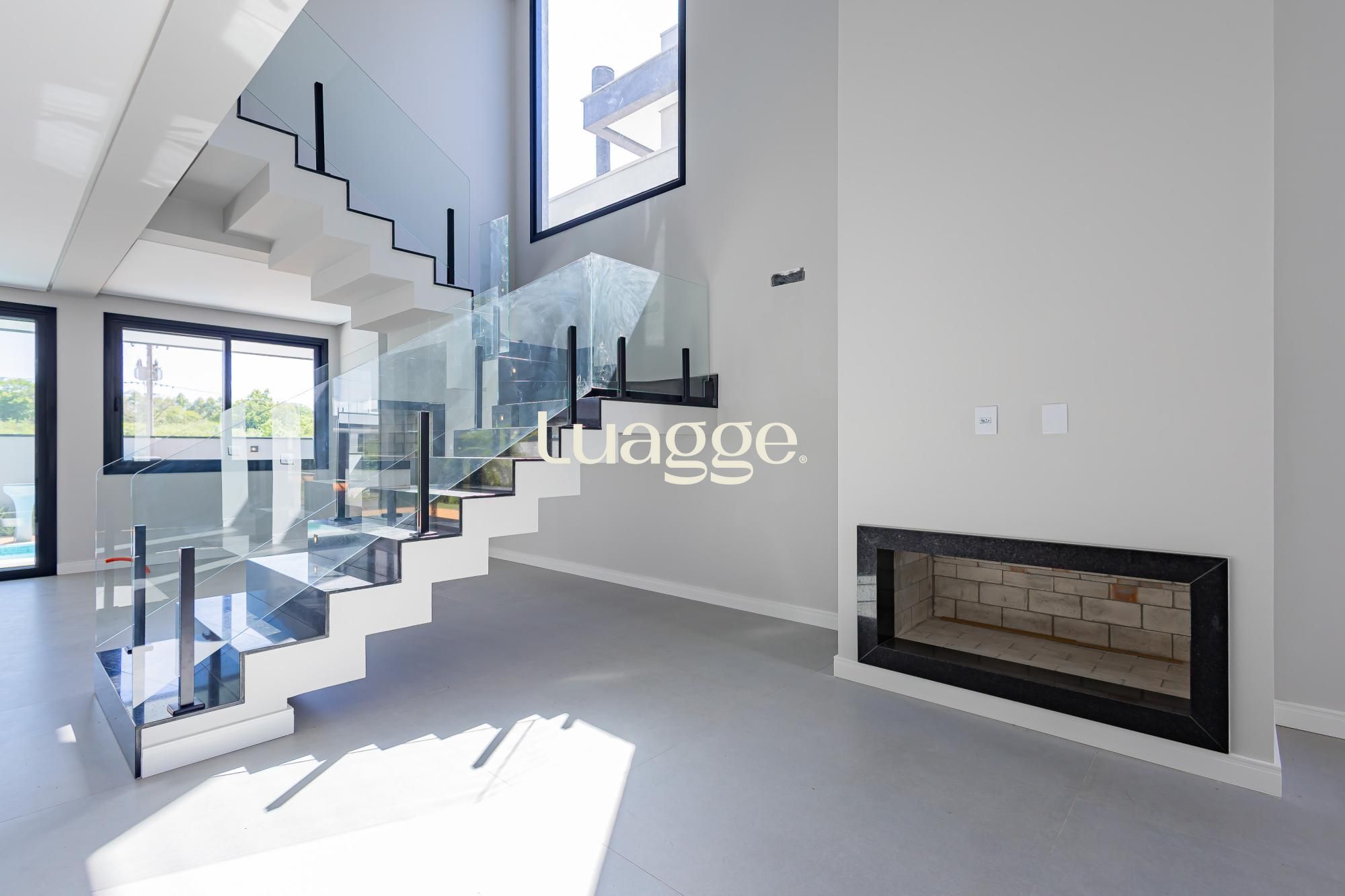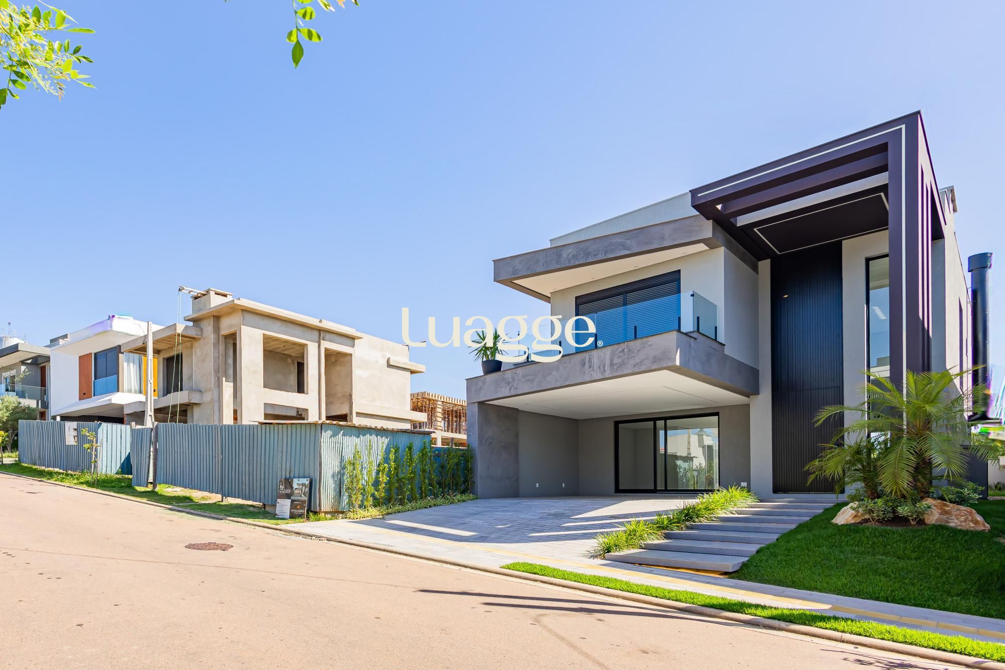 A fachada impressiona com traços angulares, volumetria marcante, pé-direito duplo e elementos em concreto aparente, criando uma estética moderna, imponente e atemporal.