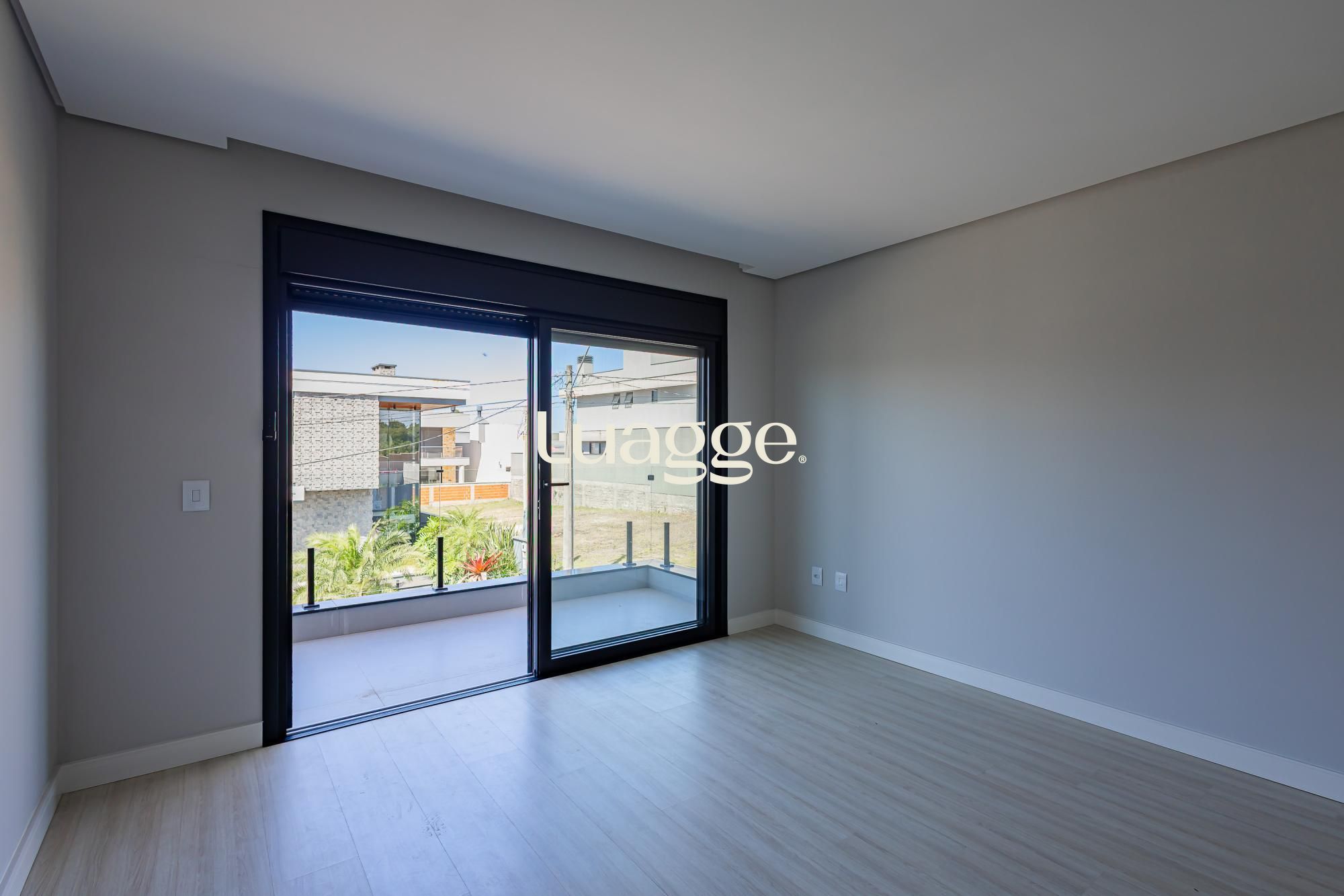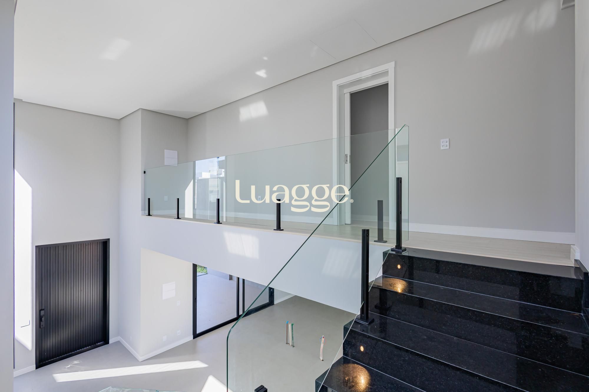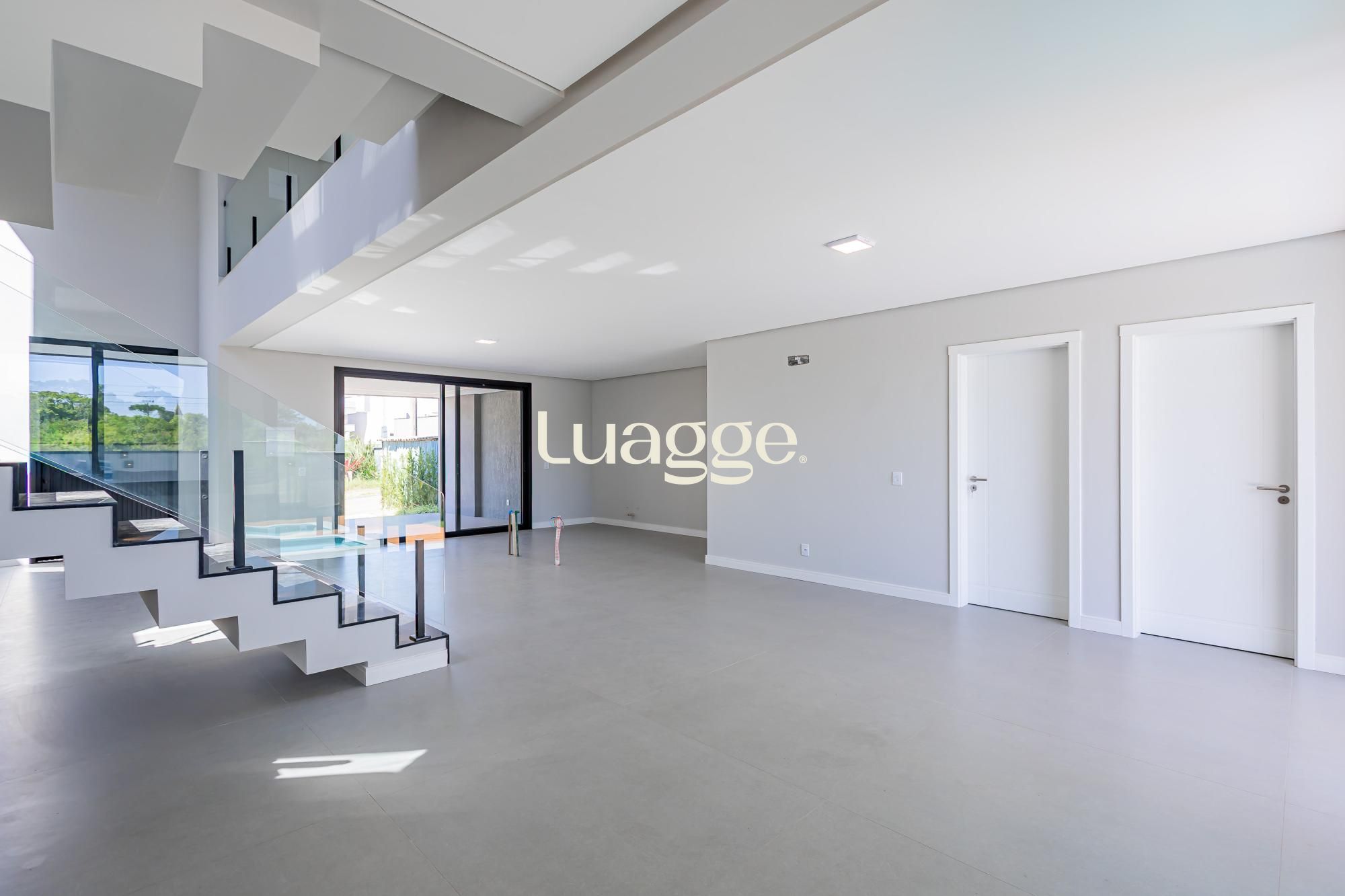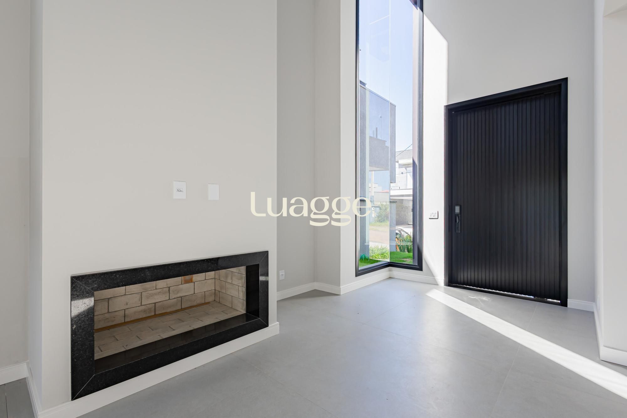 A fachada impressiona com traços angulares, volumetria marcante, pé-direito duplo e elementos em concreto aparente, criando uma estética moderna, imponente e atemporal.