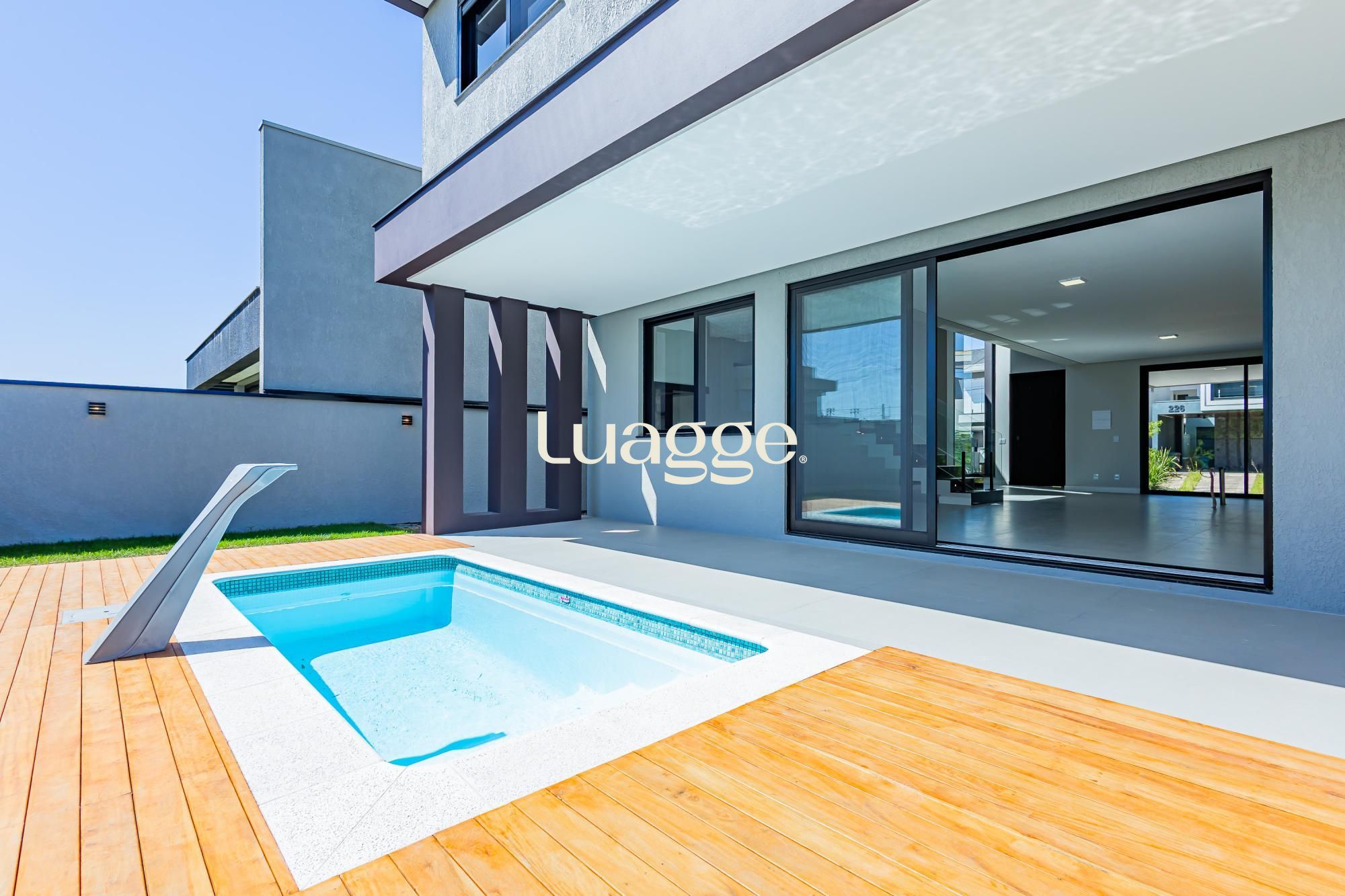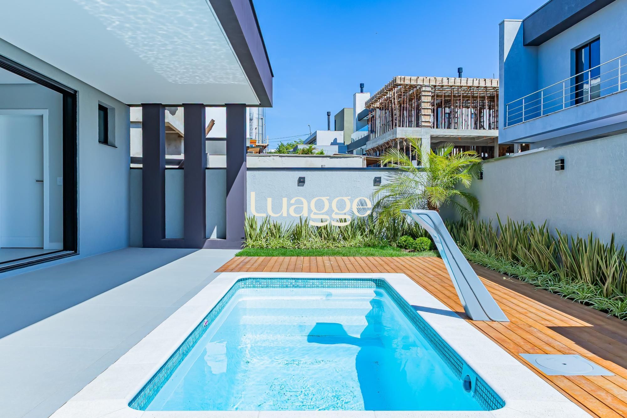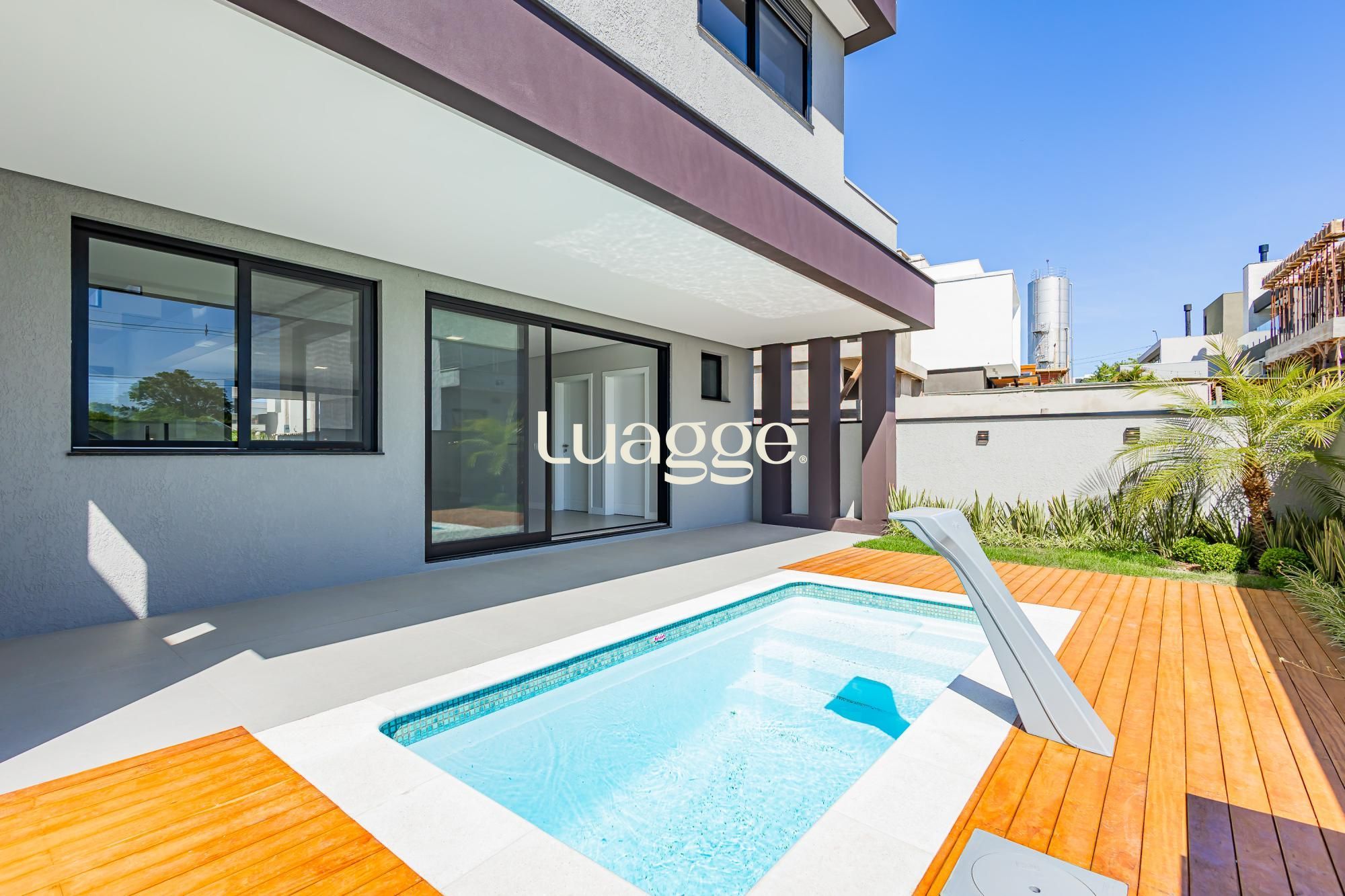 Piscina aquecida e jardim projetado, reforçando a sensação de bem-estar e lazer permanente.