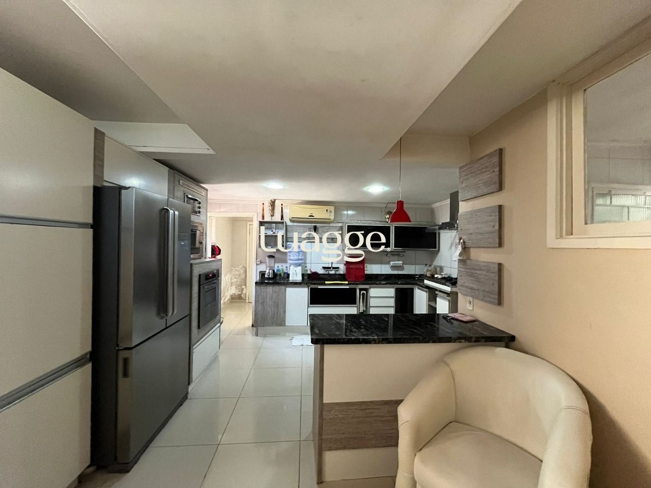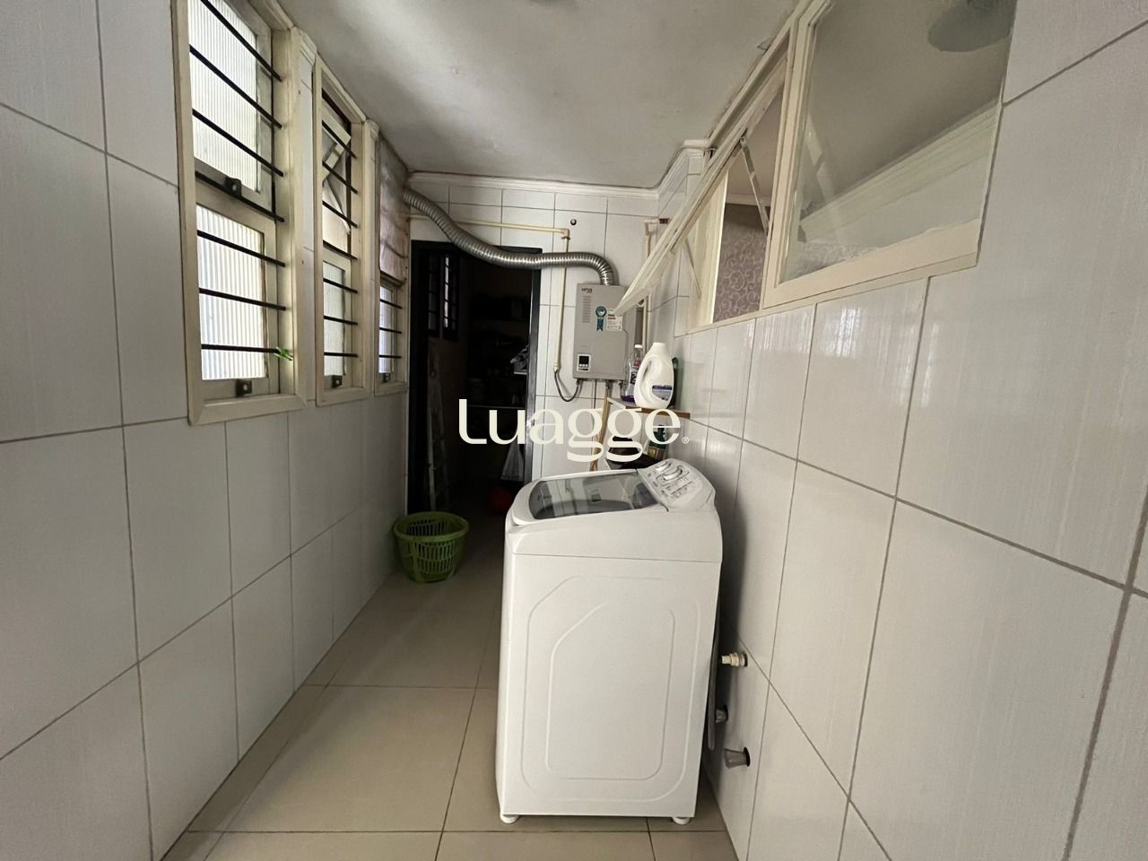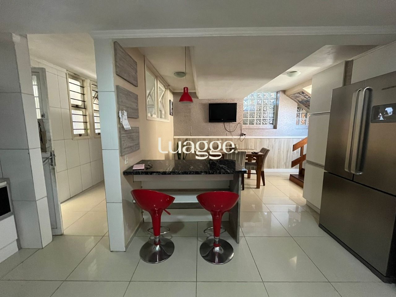 Cozinha ampla com lavanderia e dispensa em peças separadas. Acesso para um escritório da parte térrea, com banheiro.