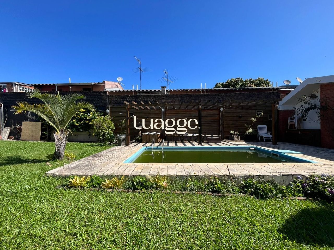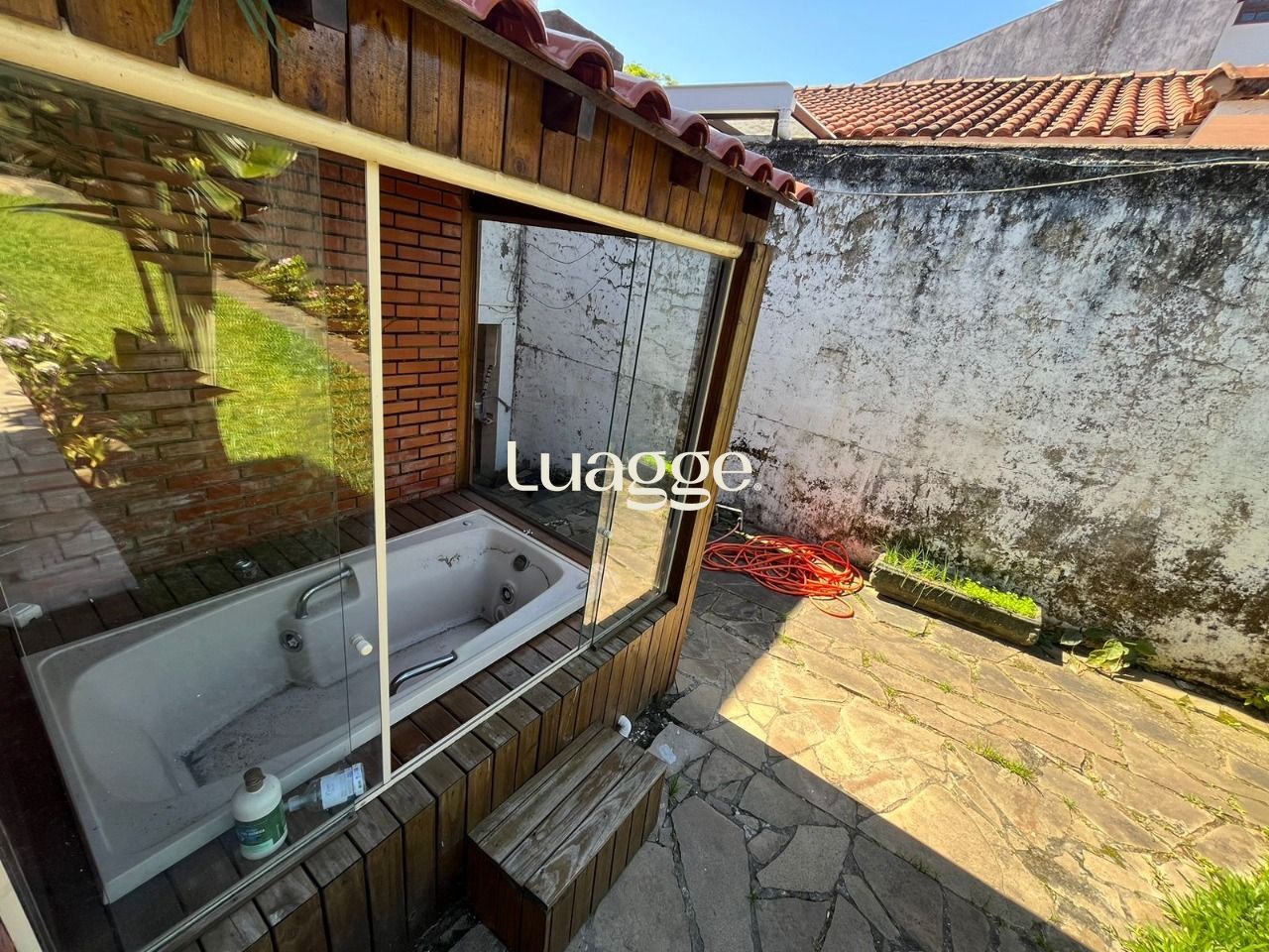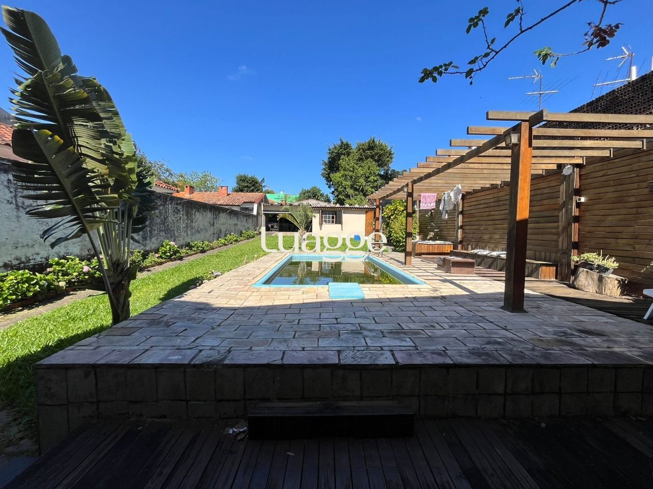 Terreno maravilhoso, super bem cuidado, com pátio enorme com piscina e deck. Nos fundos da casa um enorme salão de festas com espaço com churrasqueira, banheiro e 2 peças separadas. No pátio você também uma charmosa banheiro envidraçada.