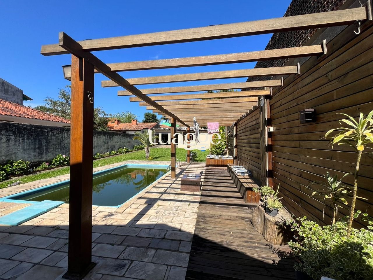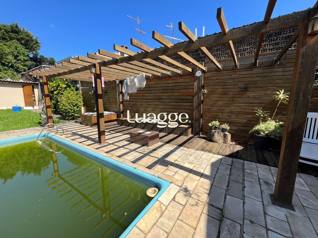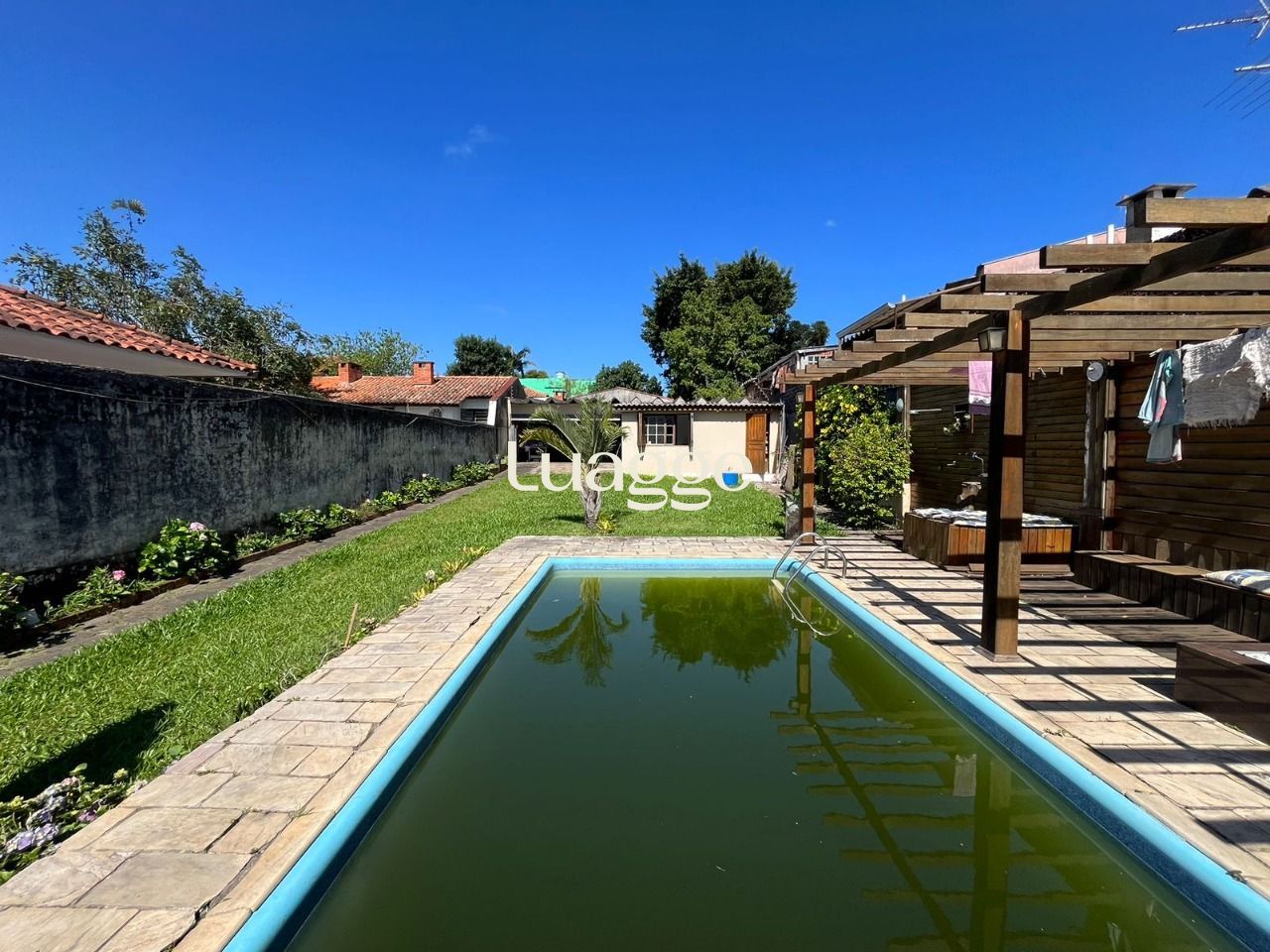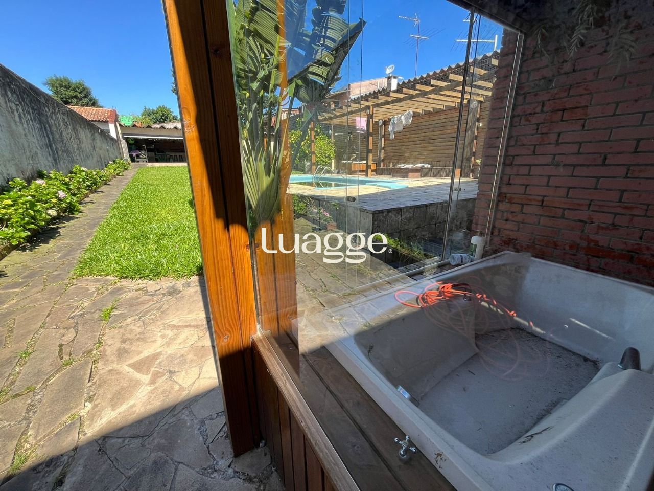 Terreno maravilhoso, super bem cuidado, com pátio enorme com piscina e deck. Nos fundos da casa um enorme salão de festas com espaço com churrasqueira, banheiro e 2 peças separadas. No pátio você também uma charmosa banheiro envidraçada.