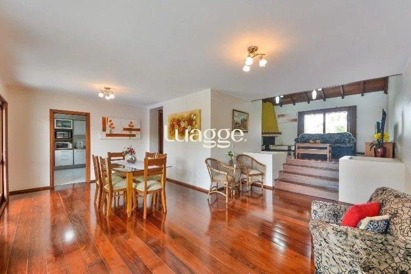 No térreo, conta com hall de entrada, gabinete, lavabo, living com pé-direito alto e desnível, proporcionando charme e amplitude ao ambiente. A sala de jantar é ampla e integrada ao pátio, com vista para a piscina, além de copa-cozinha, lavanderia e banheiro auxiliar.