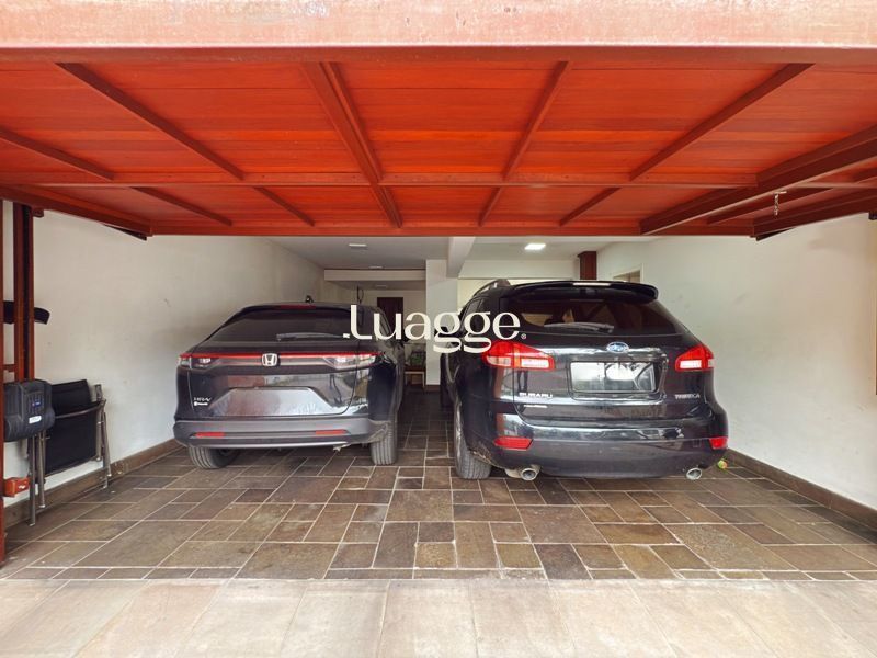 Garagem fechada para 4 carros e condição de estacionar mais 2 em área descoberta em frente a casa no pátio frontal, totalizando 6 vagas.