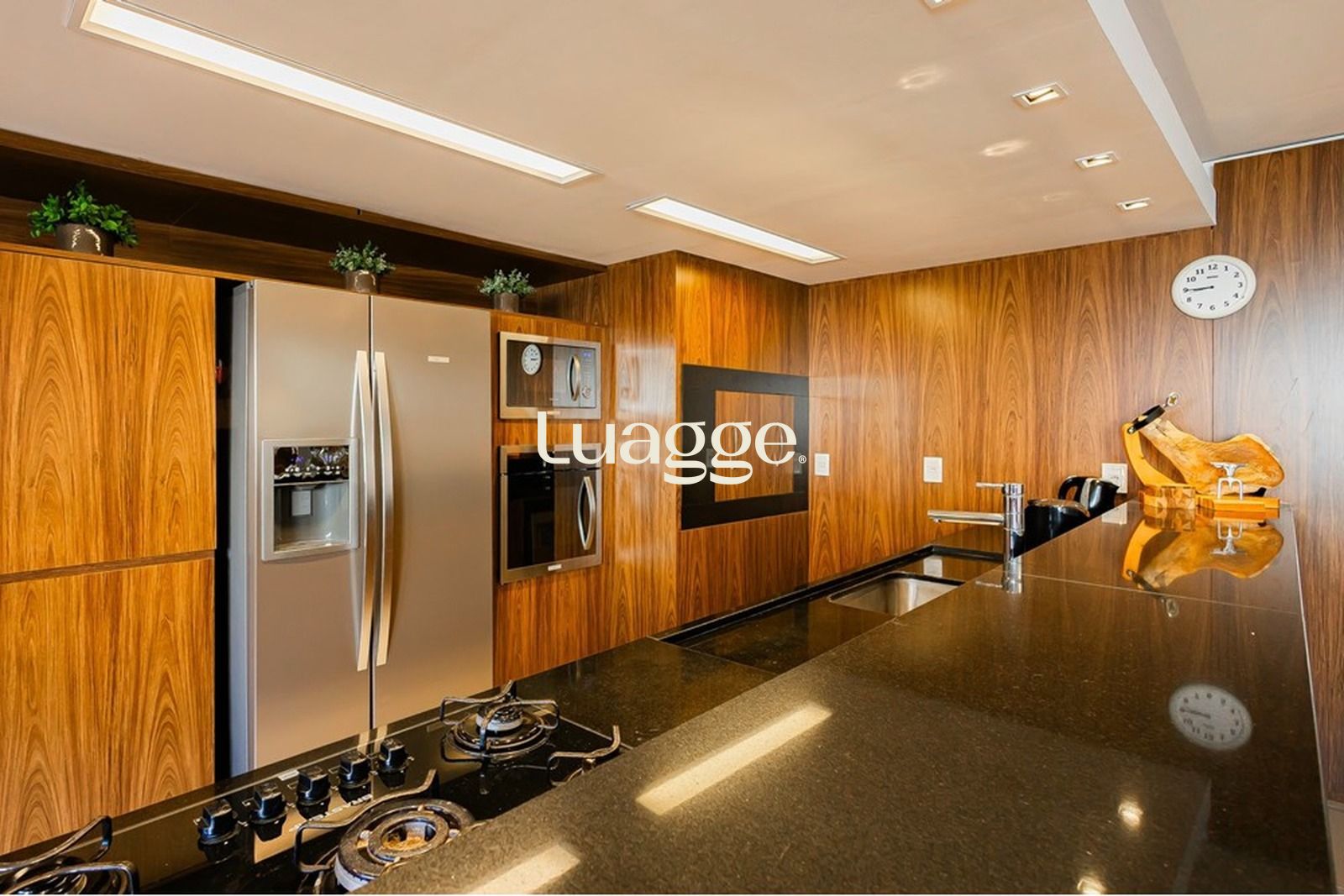 A área social se destaca pelo espaço gourmet completo, com ilha gourmet, geladeira side by side, torre quente e móveis planejados, criando um ambiente moderno e funcional. A cozinha é integrada e conta ainda com uma área de serviço separada e muito ampla.